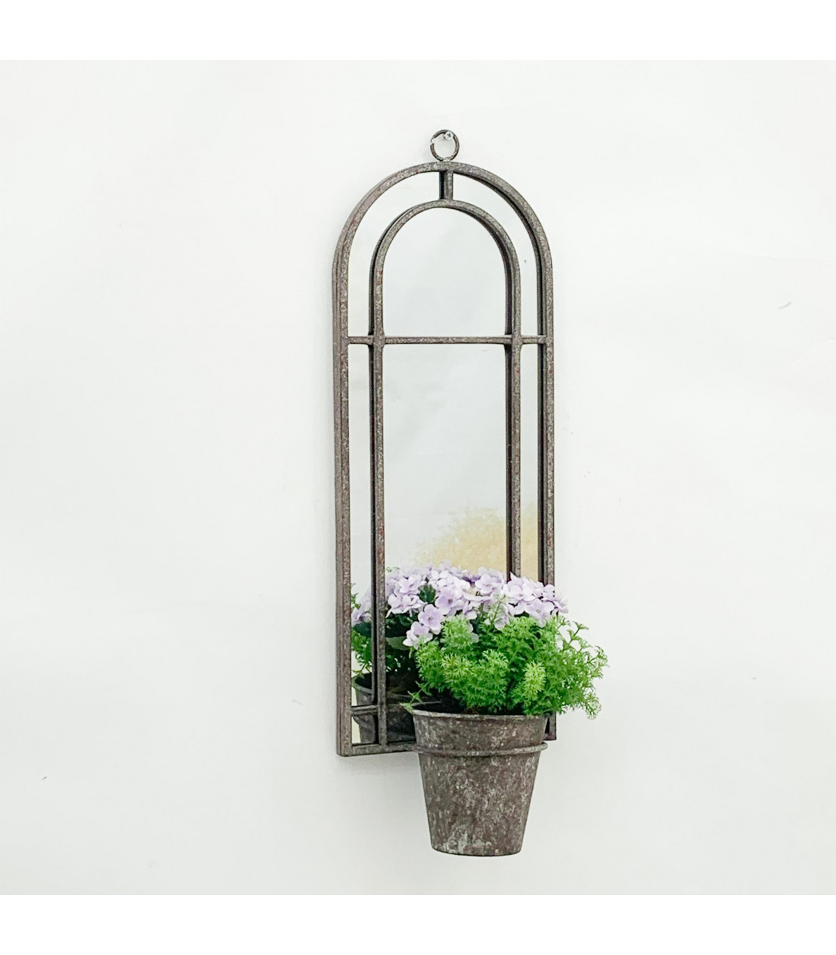 64CM WALL MIRROR WITH SINGLE PLANTER A decorative metal mirror with an antique finish complete with 1 planter holder and pot. Hard wearing Distressed Metal