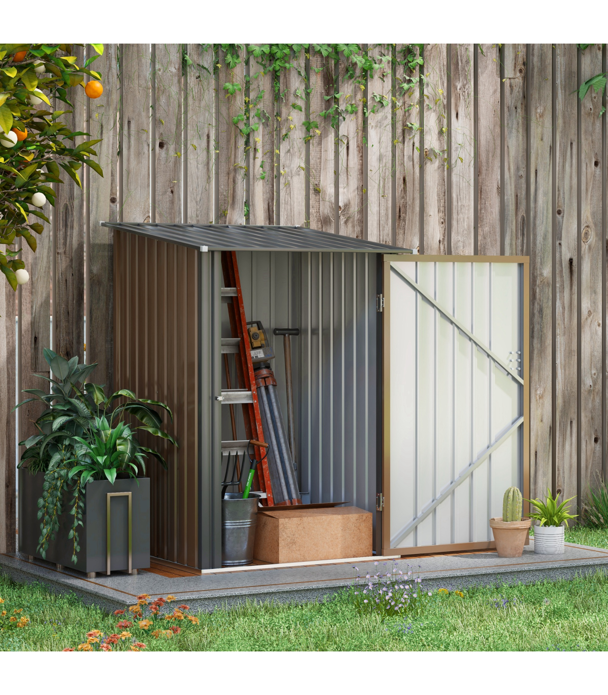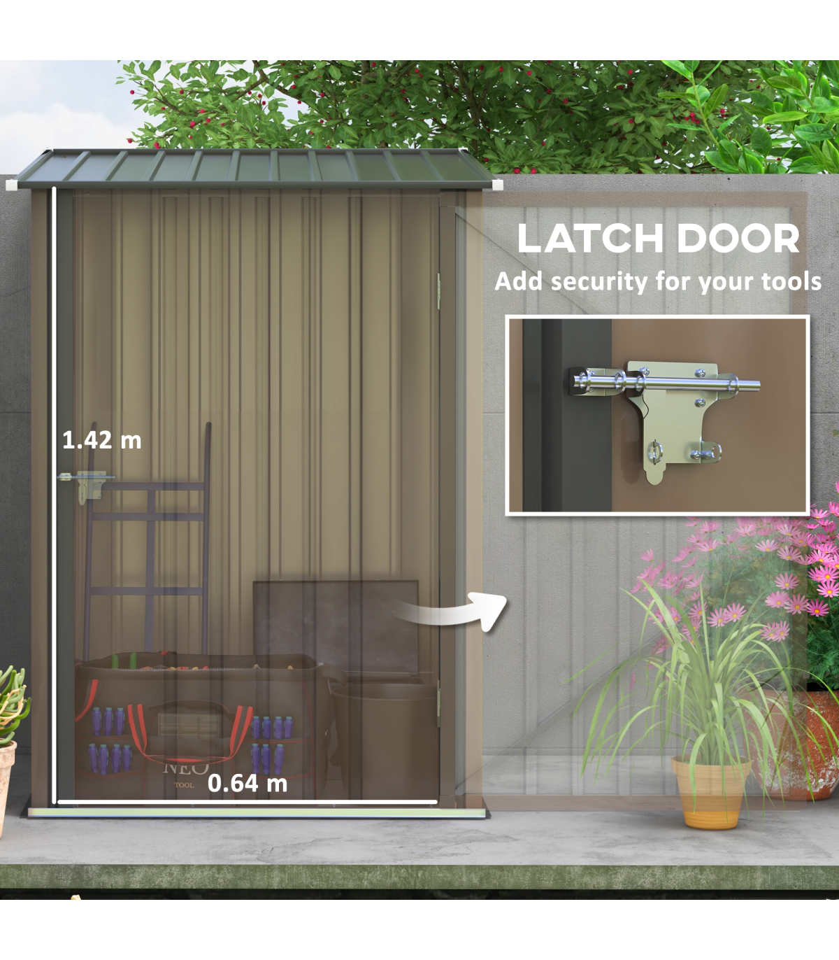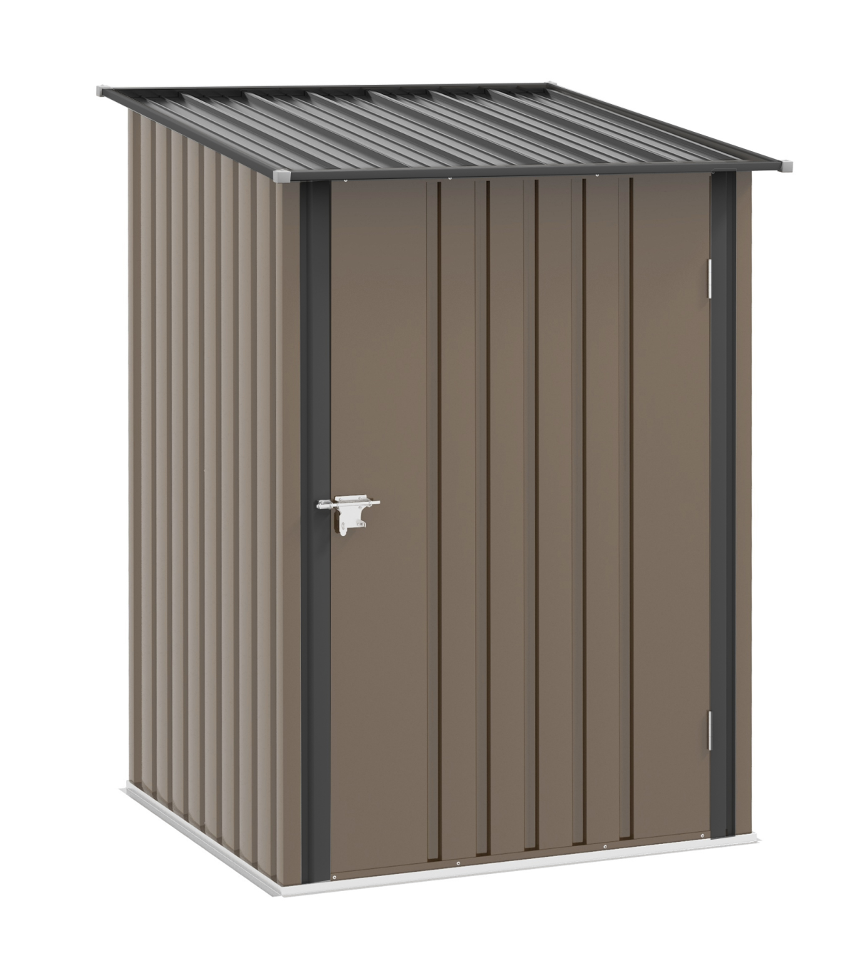 - Foundation kit is not included; - Suitable for garden/outdoor tools, equipment and more; - Corrugated steel structure with galvanised finish for a strong shell; - Sloped roof means no rainwater buildup; - Latched door to keep safely shut; - Assembly required; - Colour: Brown, Dark Grey; - Materials: Steel; - Overall Dimension: 100W x 103D x 146/160Hcm; - Inner Dimension: 83W x 86Dcm; - Bottom Size: 94W x 98Dcm (0.92m²); - Door Size: 63.5W x 142Hcm; - Item Label: 845-530V00BN; - Note: Three people required for installation in approx. two hours - ALWAYS wear gloves. Do not build during windy weather conditions.