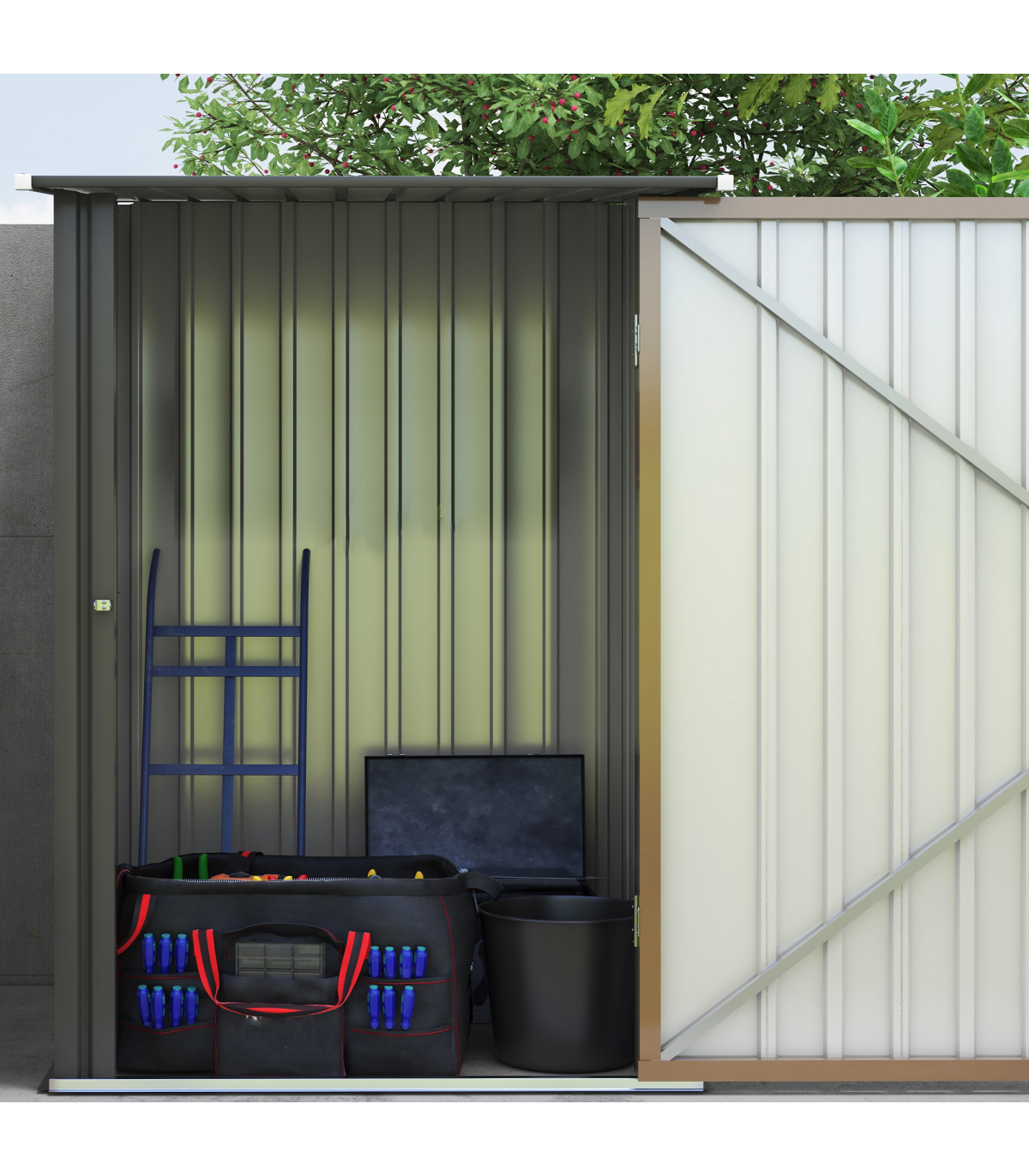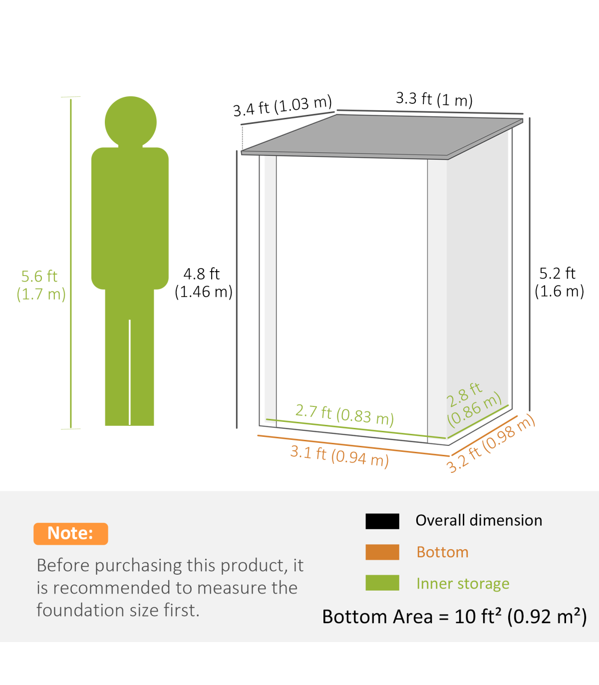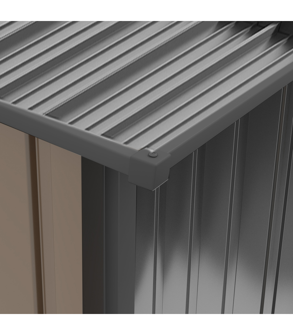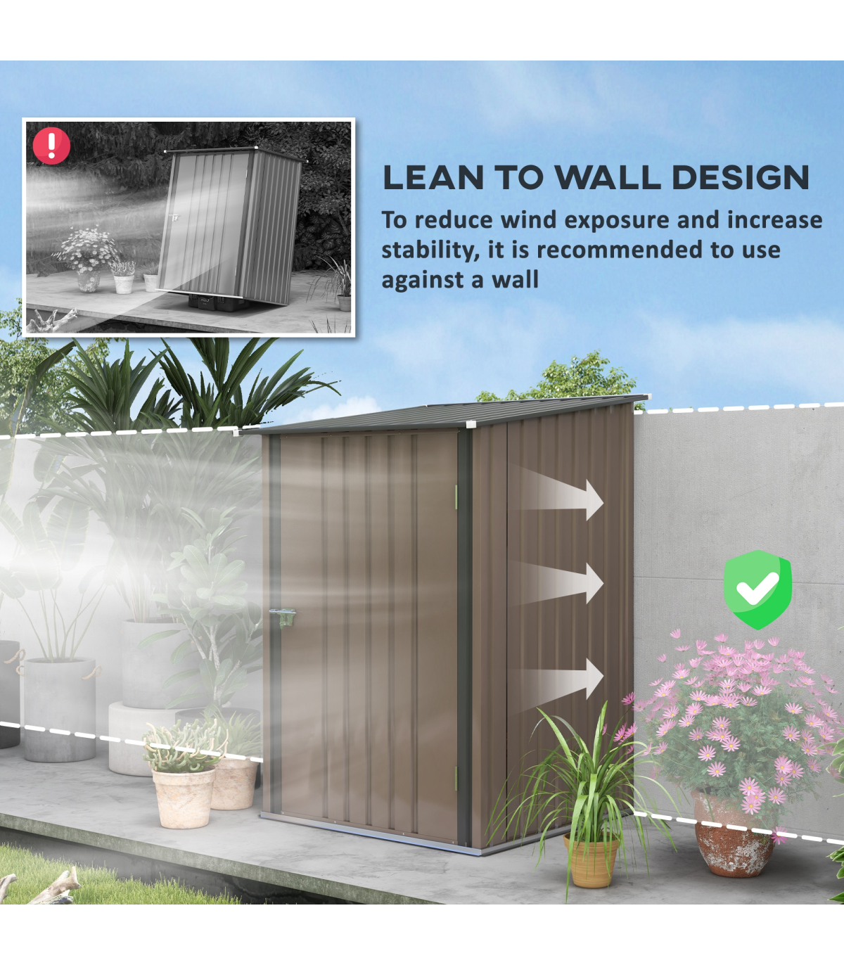 - Foundation kit is not included; - Suitable for garden/outdoor tools, equipment and more; - Corrugated steel structure with galvanised finish for a strong shell; - Sloped roof means no rainwater buildup; - Latched door to keep safely shut; - Assembly required; - Colour: Brown, Dark Grey; - Materials: Steel; - Overall Dimension: 100W x 103D x 146/160Hcm; - Inner Dimension: 83W x 86Dcm; - Bottom Size: 94W x 98Dcm (0.92m²); - Door Size: 63.5W x 142Hcm; - Item Label: 845-530V00BN; - Note: Three people required for installation in approx. two hours - ALWAYS wear gloves. Do not build during windy weather conditions.