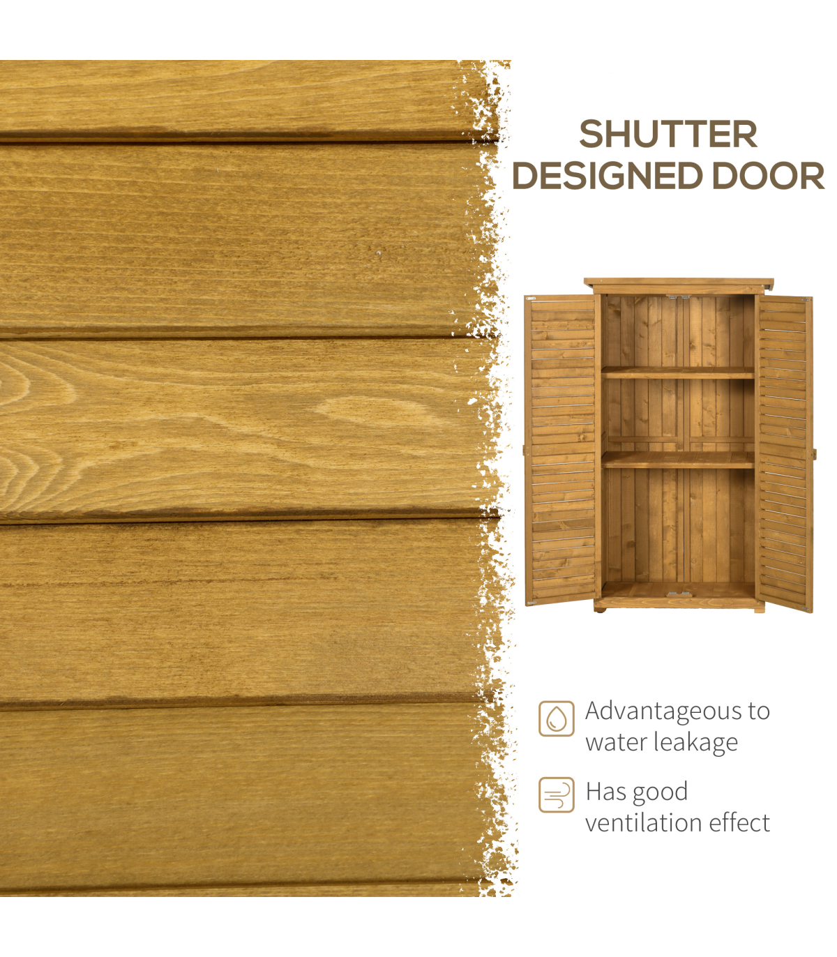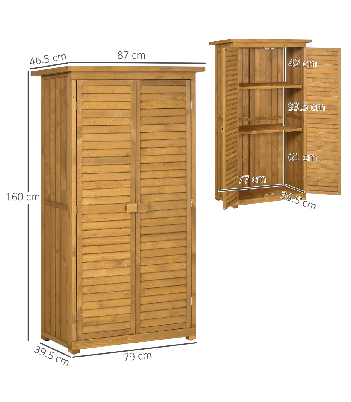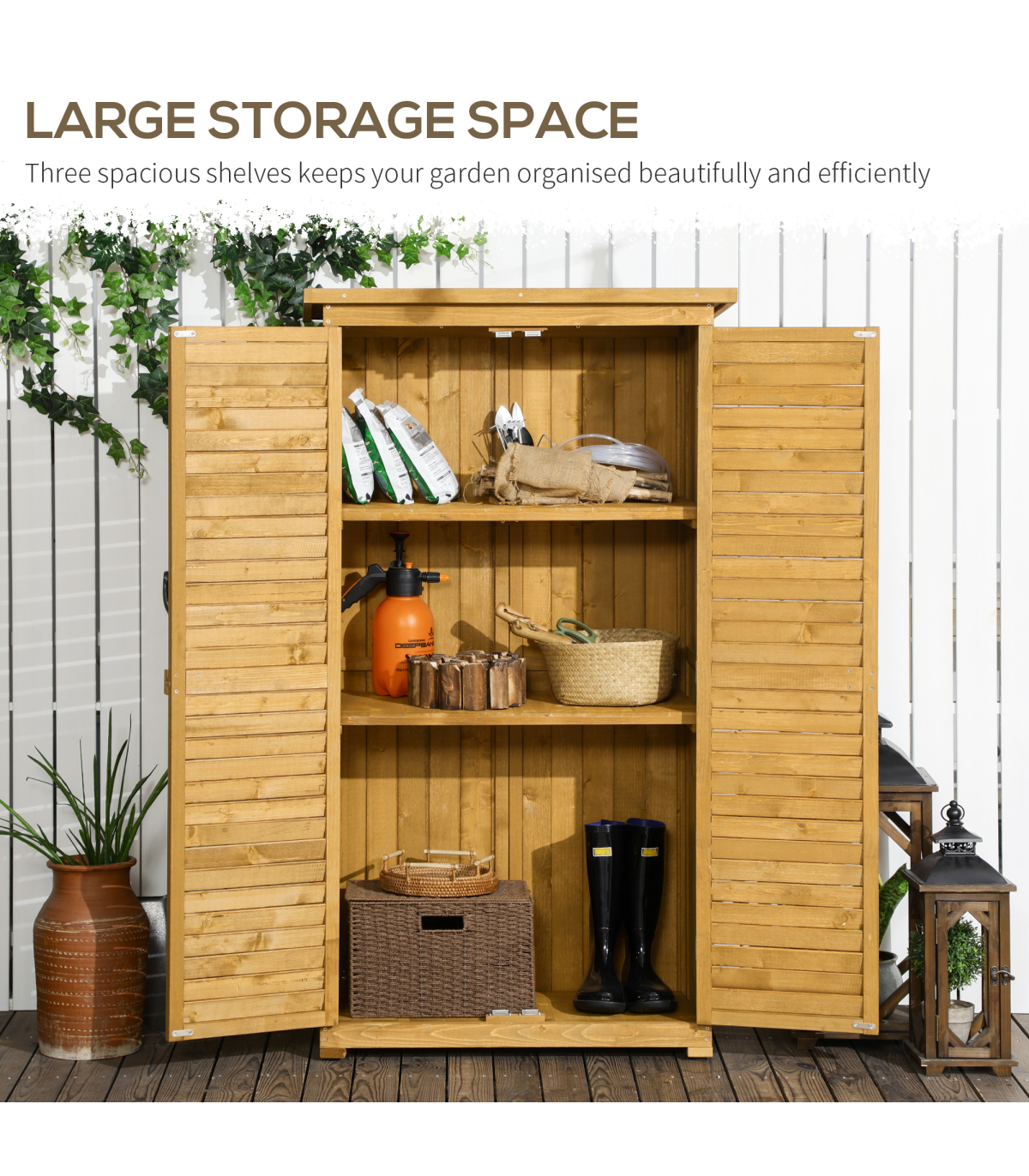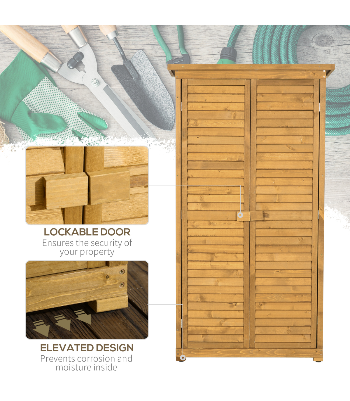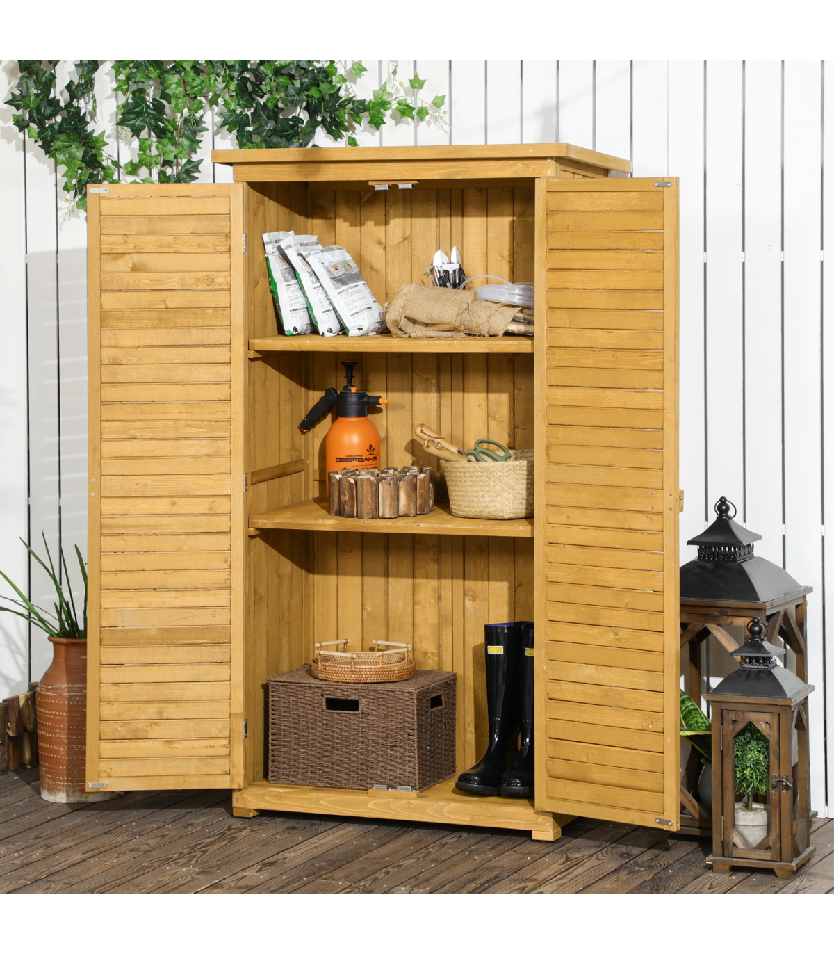 Installing our tool cabinet in your own backyard is a great way to reclaim your outdoor space for your tools and accessories. The garden storage utility is divided into 3 shelves and provides spacious room for storing different tools and keeping them neat and tidy. Furthermore, the garage storage cabinet with floor features solid wood, asphalt felt roof, exterior painting, and a lock. This tall shed can stand up to bad weather and is super handy to use.