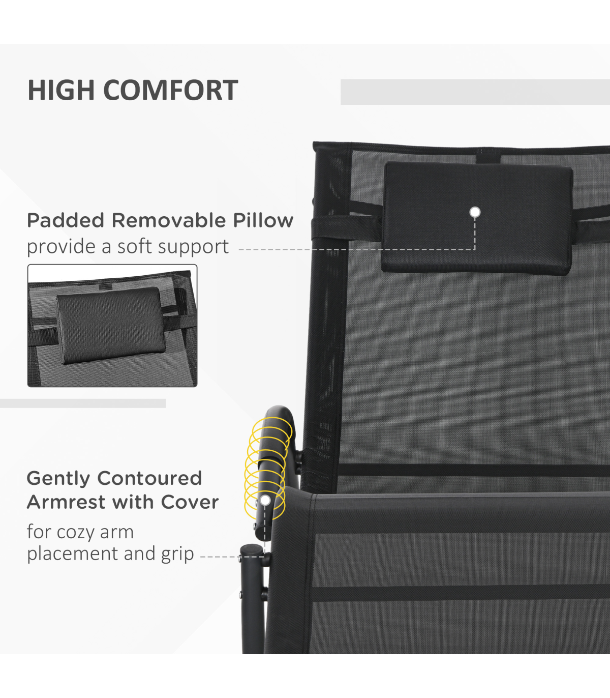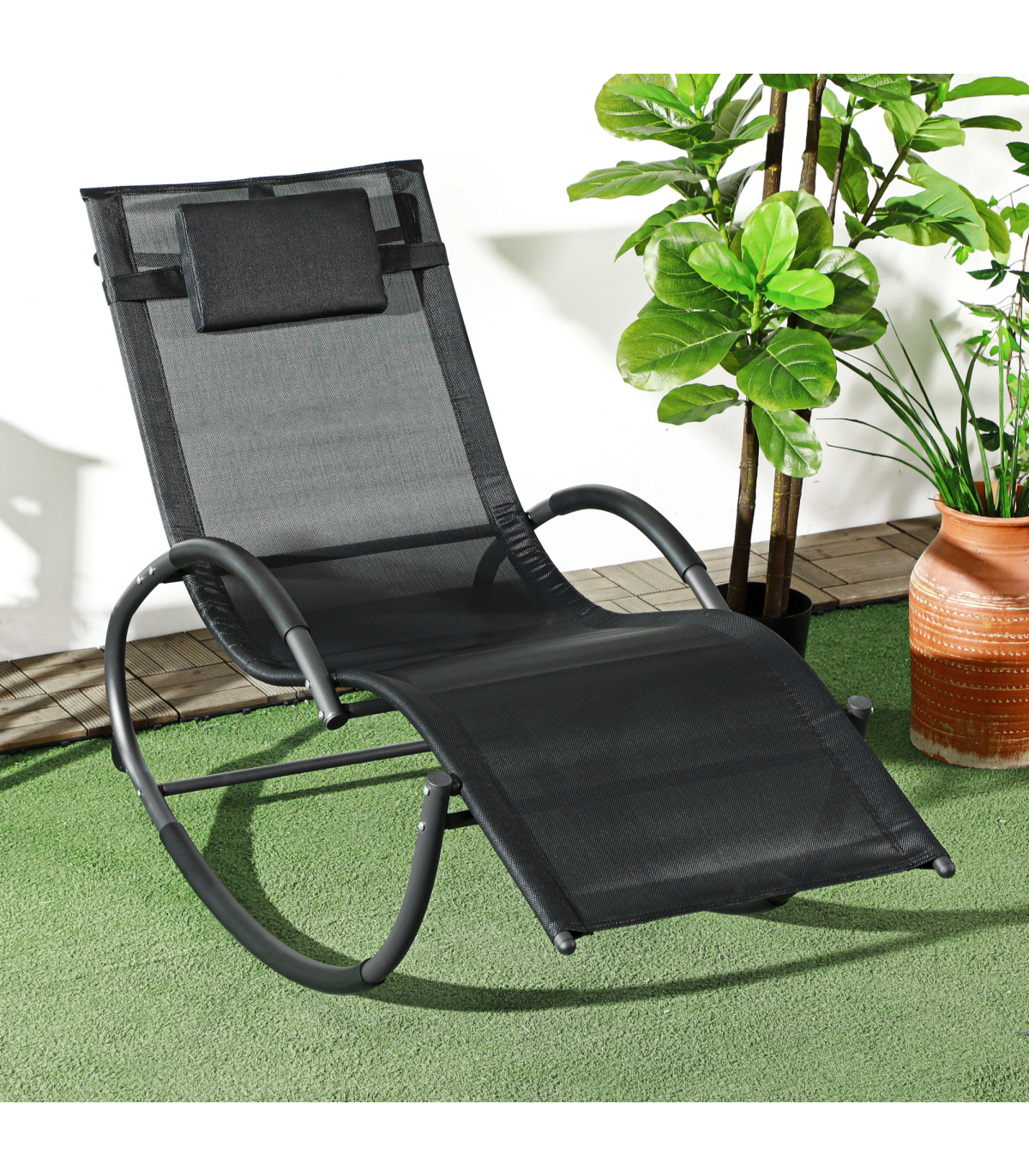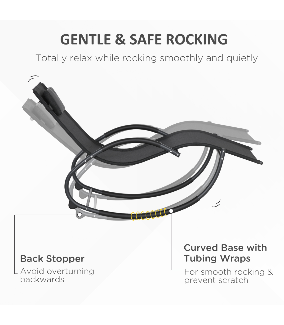 Designed with complete relaxation in mind, this Outsunny rocking sun lounger is ideal for enjoying the outdoors. The steel frame is crafted into a unique design which will let you rock forwards and backwards smoothly and gently, with a breathable texteline fabric covering the whole of the waved seat for maximum comfort in hot weather. Patio rocking chair is complete with a removable pillow for head and neck support.