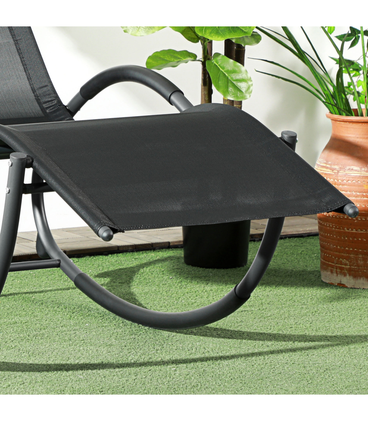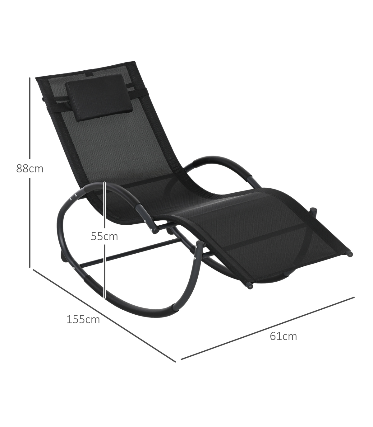 - Zero gravity steel frame, rocks forwards and backwards smoothly and gently; - Texteline fabric seat, comfortable and allows your skin to breathe; - Removable pillow for a place to rest and support your head and neck; - Pads on the armrests to prevent burning your skin on the metal when hot; - Perfect for the garden, balcony and outdoors areas; - Maximum load 120kg, assembly required; - Colour: Black and Grey; - Material: Steel Frame, Texteline; - Overall Dimension: 61W x 155D x 88H cm; - Seat Size: 52W x 40D cm; - Seat Height: 33cm; - Armrest Height: 55cm; - Pillow Size: 29L x 19W x 3H cm; - Weight Capacity: 120kg; - Item Label: 84A-120V71BK;