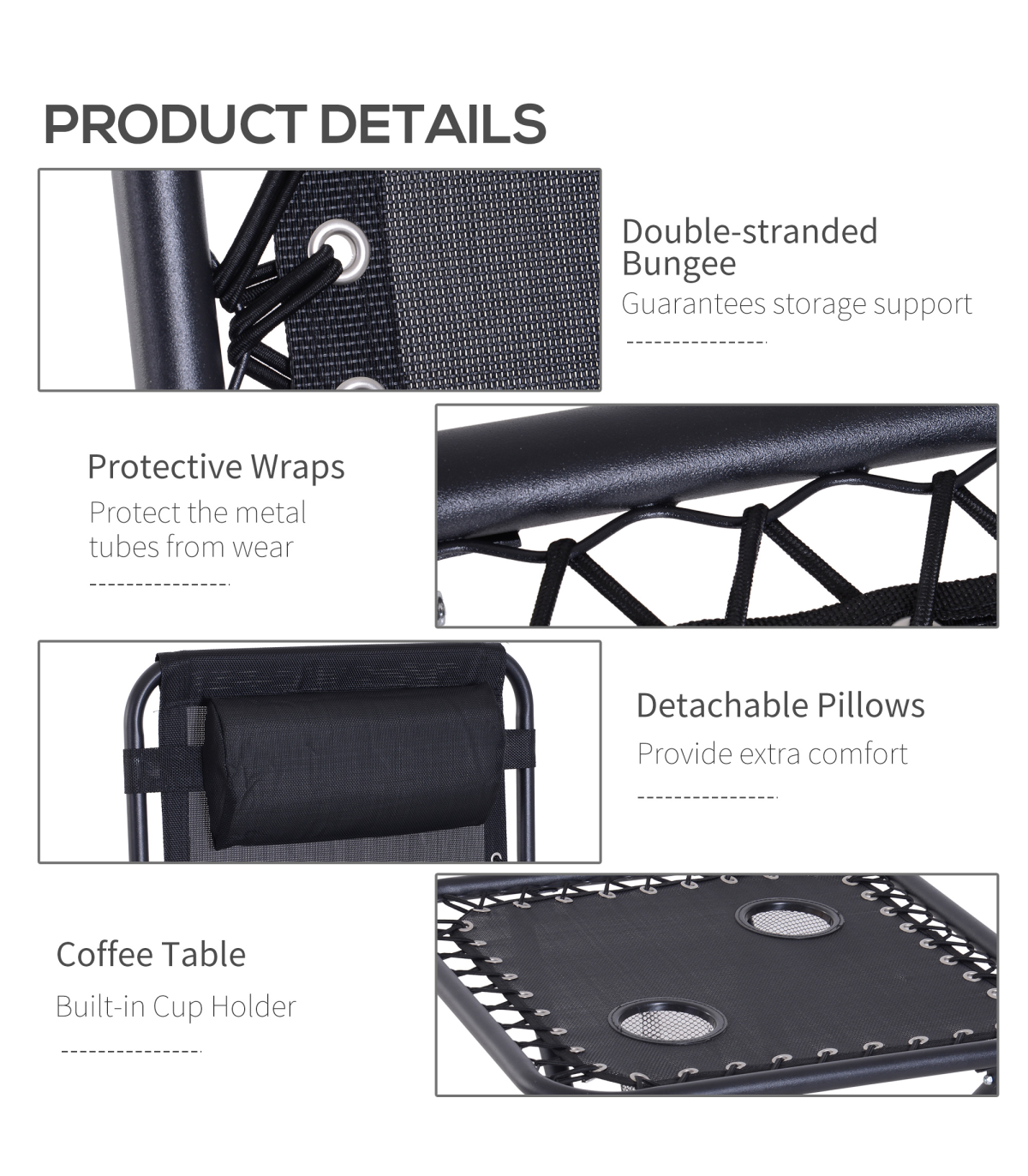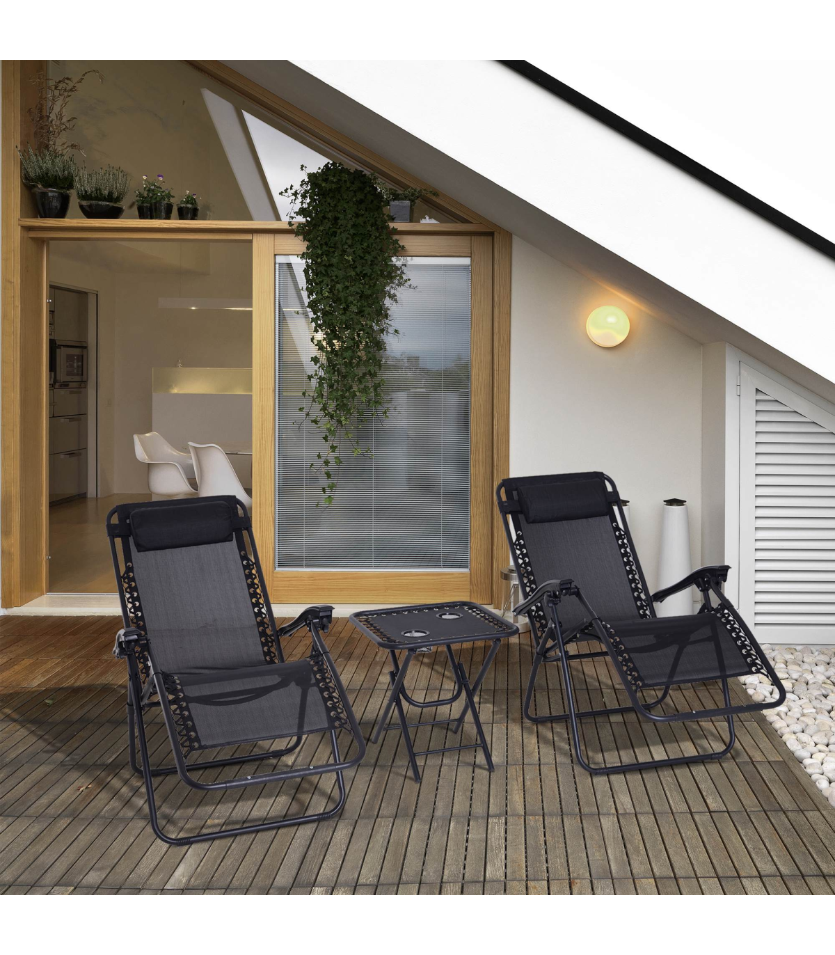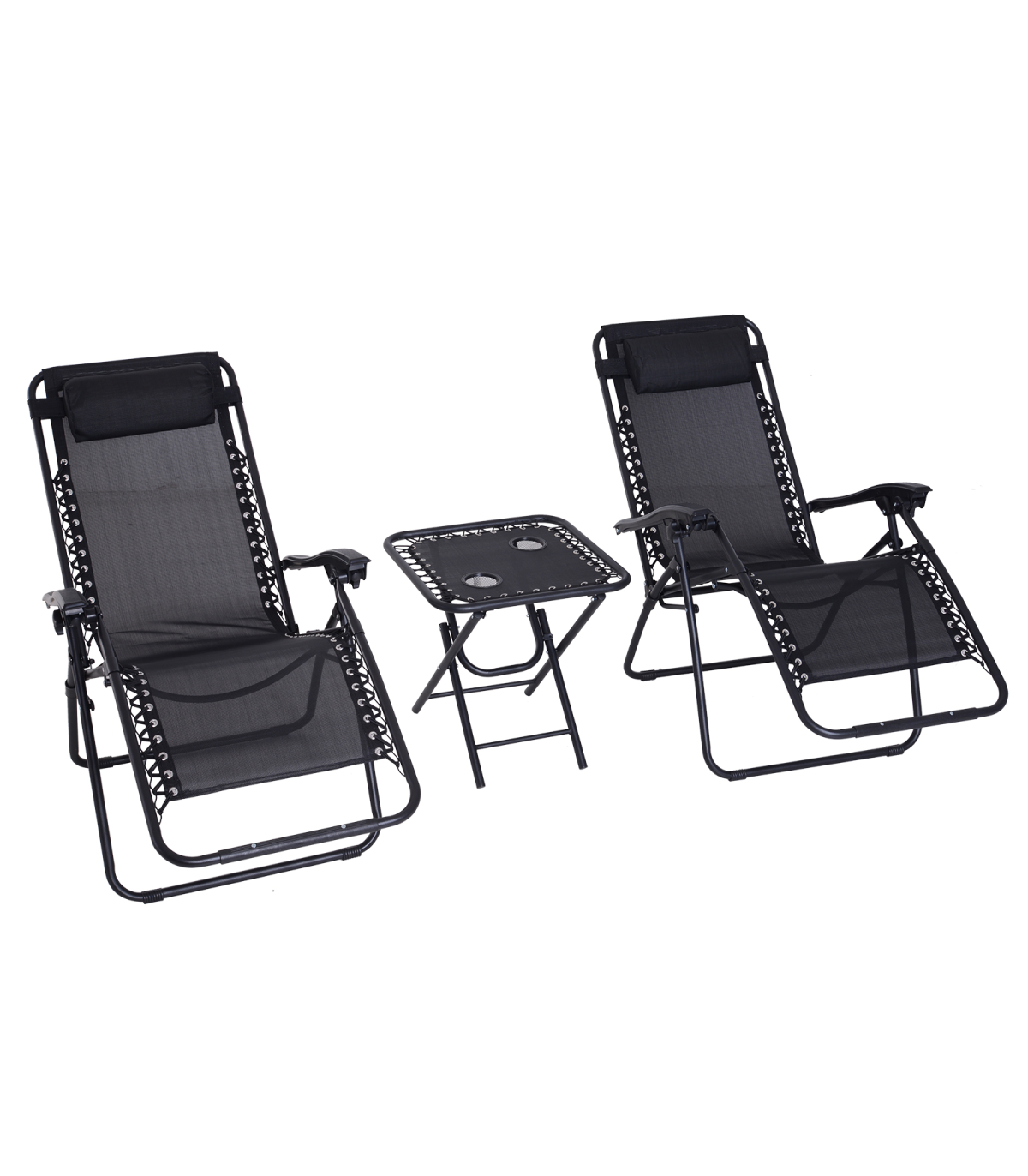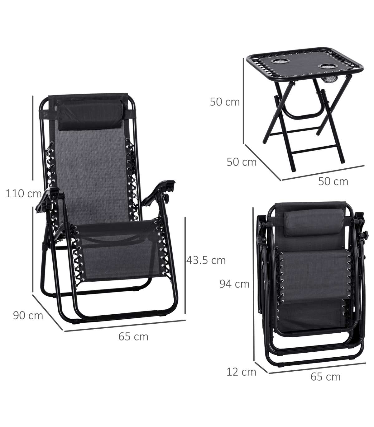 3PC Zero Gravity Chairs Sun Lounger Table Set w/ Cup Holders, Black Outsunny" Description: - THREE-PIECE GARDEN SET: Includes two sun lounger chairs and one side table. - ZERO GRAVITY CHAIRS: Provides unrivalled support, taking the weight off your body and relieving any pressure. Padded headrest ensures complete comfort. - ADJUSTABLE RECLINING POSITION: Locks into any position of foldable sun loungers for full control. - BUILT IN TABLE CUP HOLDERS: No need to move - perfect for when relaxing hours on end. - FOLDABLE: Easy to carry and store when not in use. - GARDEN RECLINER SET DIMENSIONS: - Chair: 110H x 65W x 90Lcm - Table: 50H x 50L x 50Wcm - Weight Capacity: - Chair: 150kg - Table: 40kg