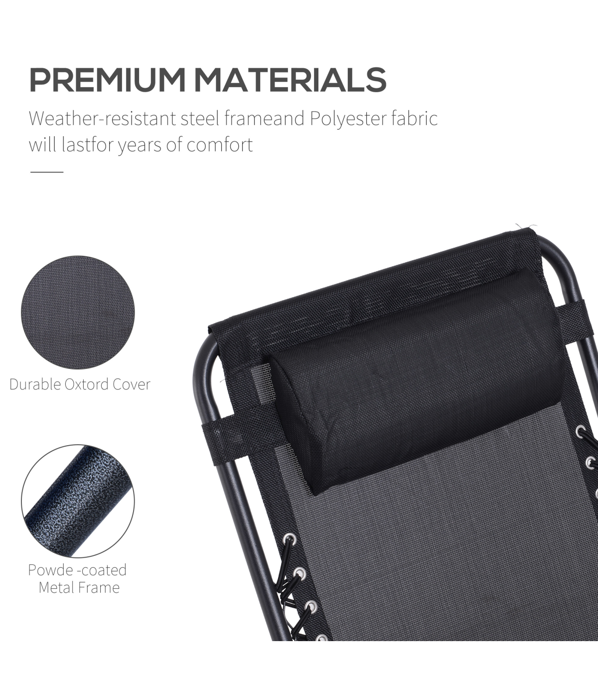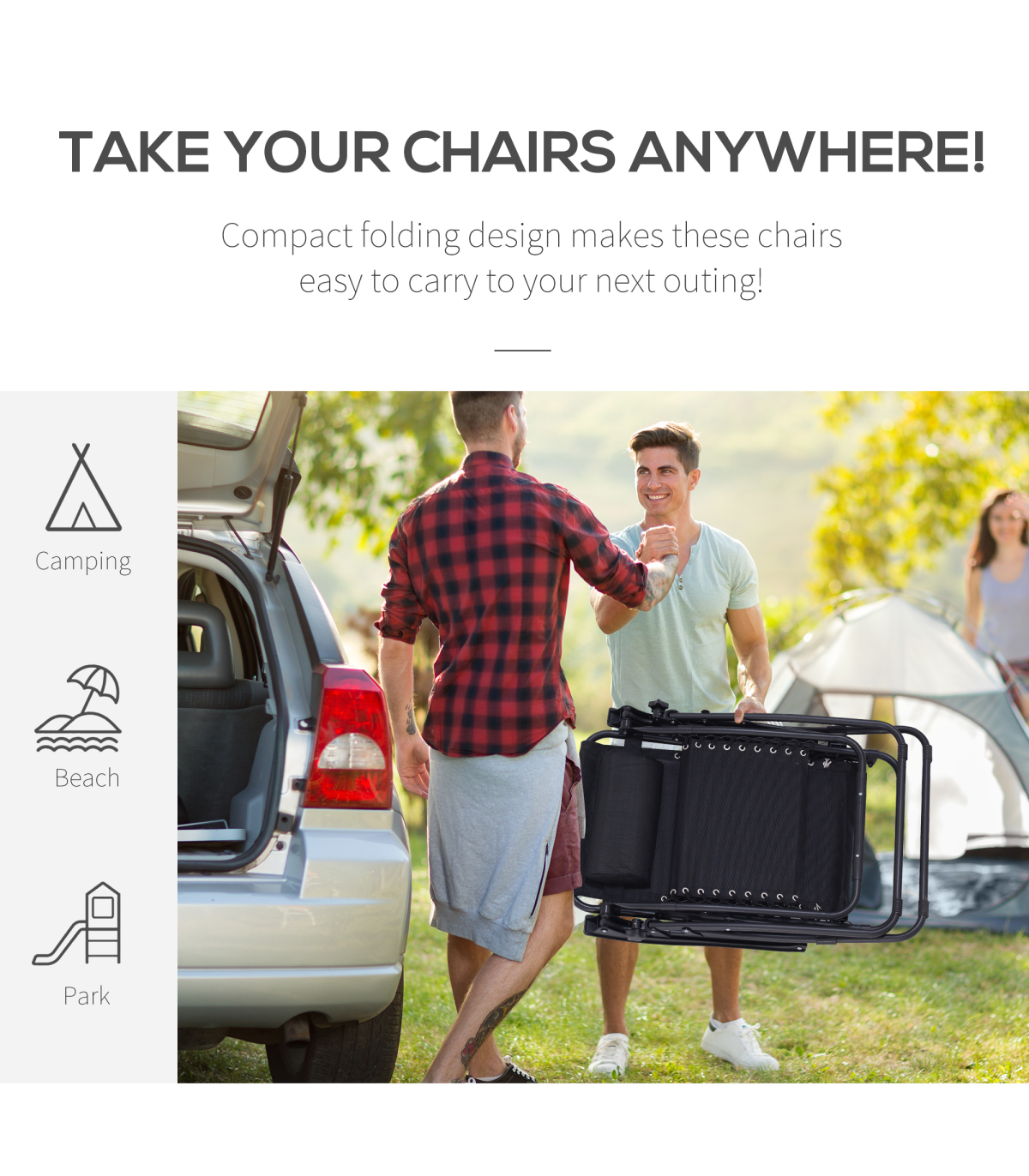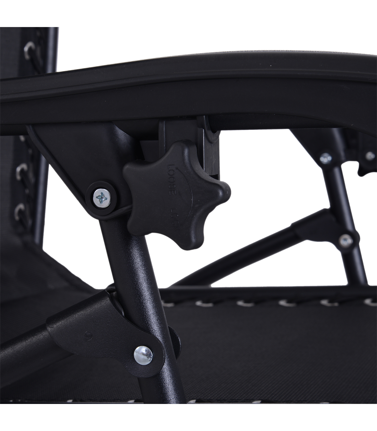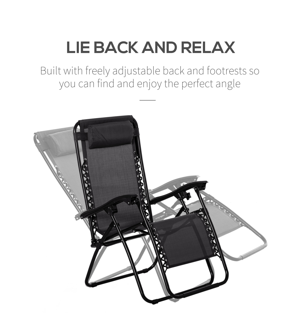3PC Zero Gravity Chairs Sun Lounger Table Set w/ Cup Holders, Black Outsunny" Description: - THREE-PIECE GARDEN SET: Includes two sun lounger chairs and one side table. - ZERO GRAVITY CHAIRS: Provides unrivalled support, taking the weight off your body and relieving any pressure. Padded headrest ensures complete comfort. - ADJUSTABLE RECLINING POSITION: Locks into any position of foldable sun loungers for full control. - BUILT IN TABLE CUP HOLDERS: No need to move - perfect for when relaxing hours on end. - FOLDABLE: Easy to carry and store when not in use. - GARDEN RECLINER SET DIMENSIONS: - Chair: 110H x 65W x 90Lcm - Table: 50H x 50L x 50Wcm - Weight Capacity: - Chair: 150kg - Table: 40kg