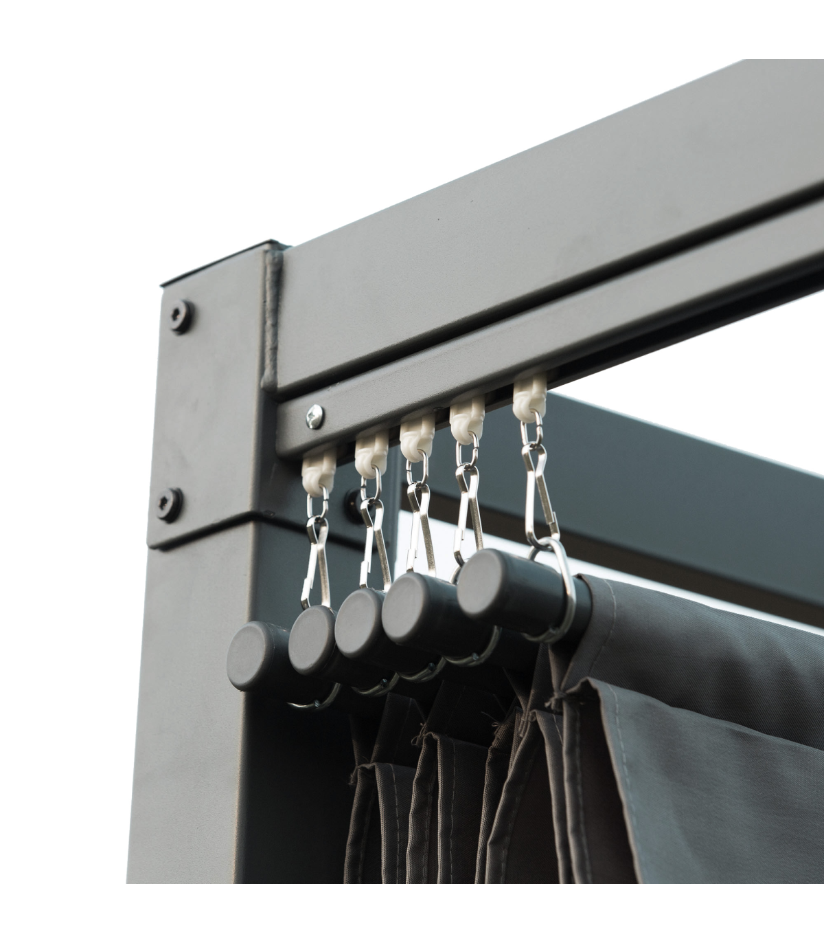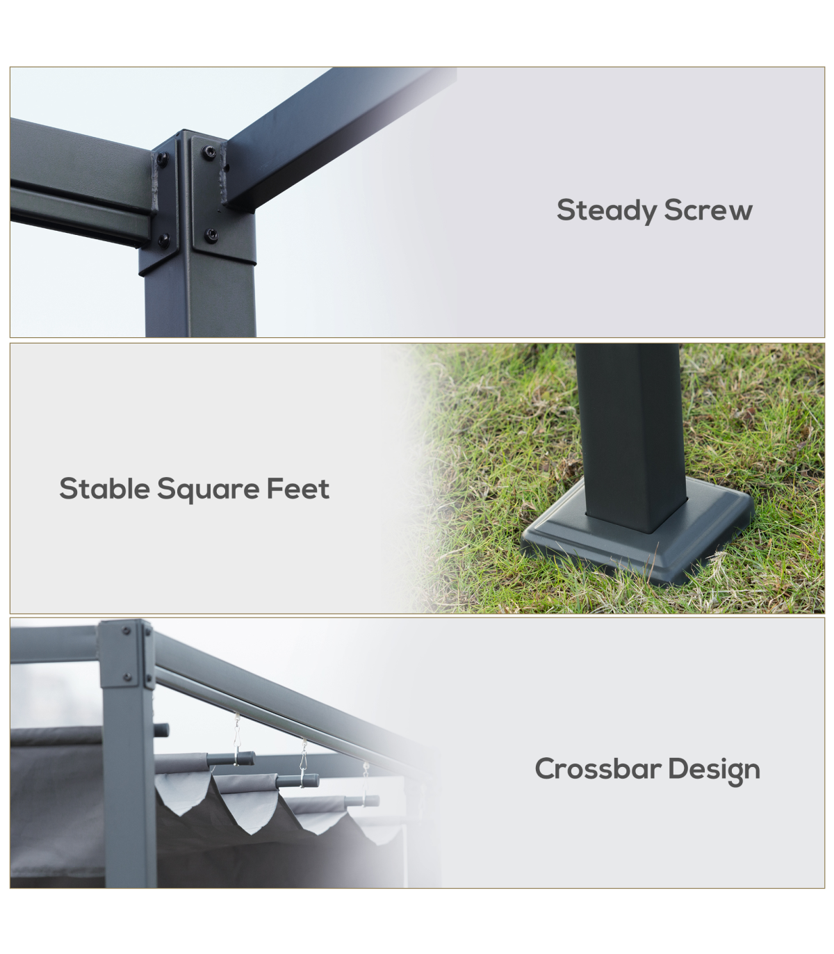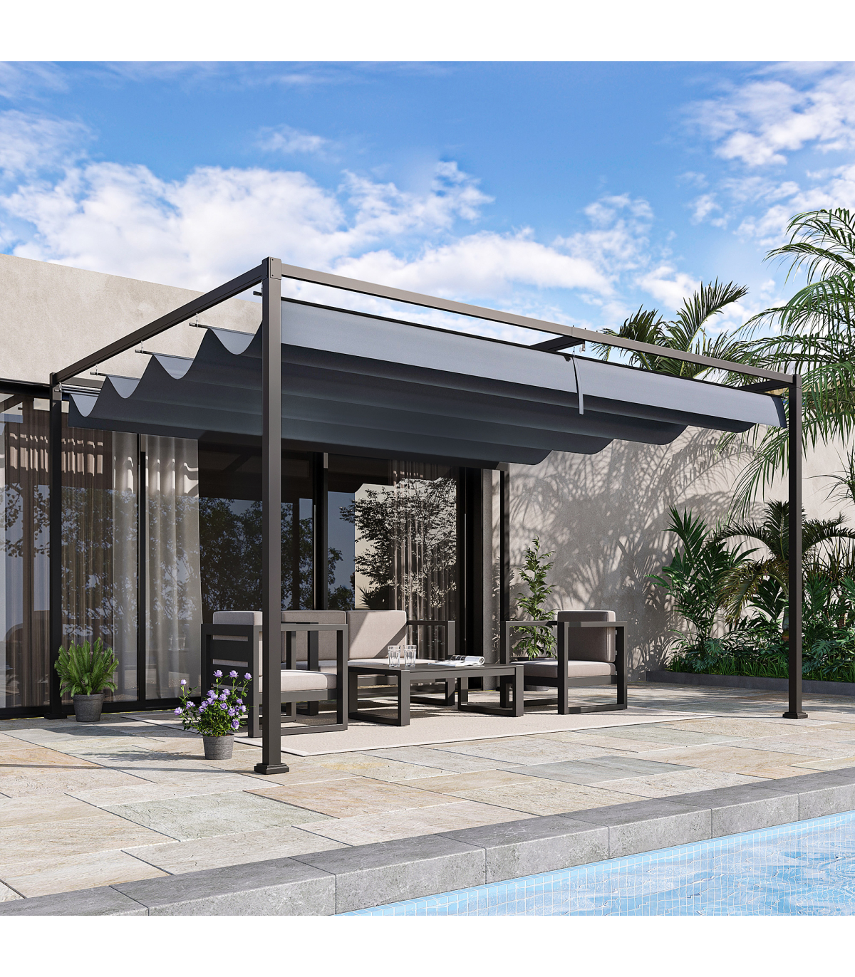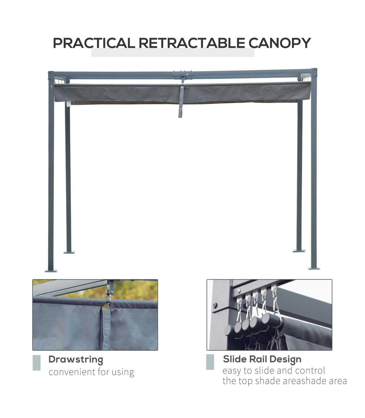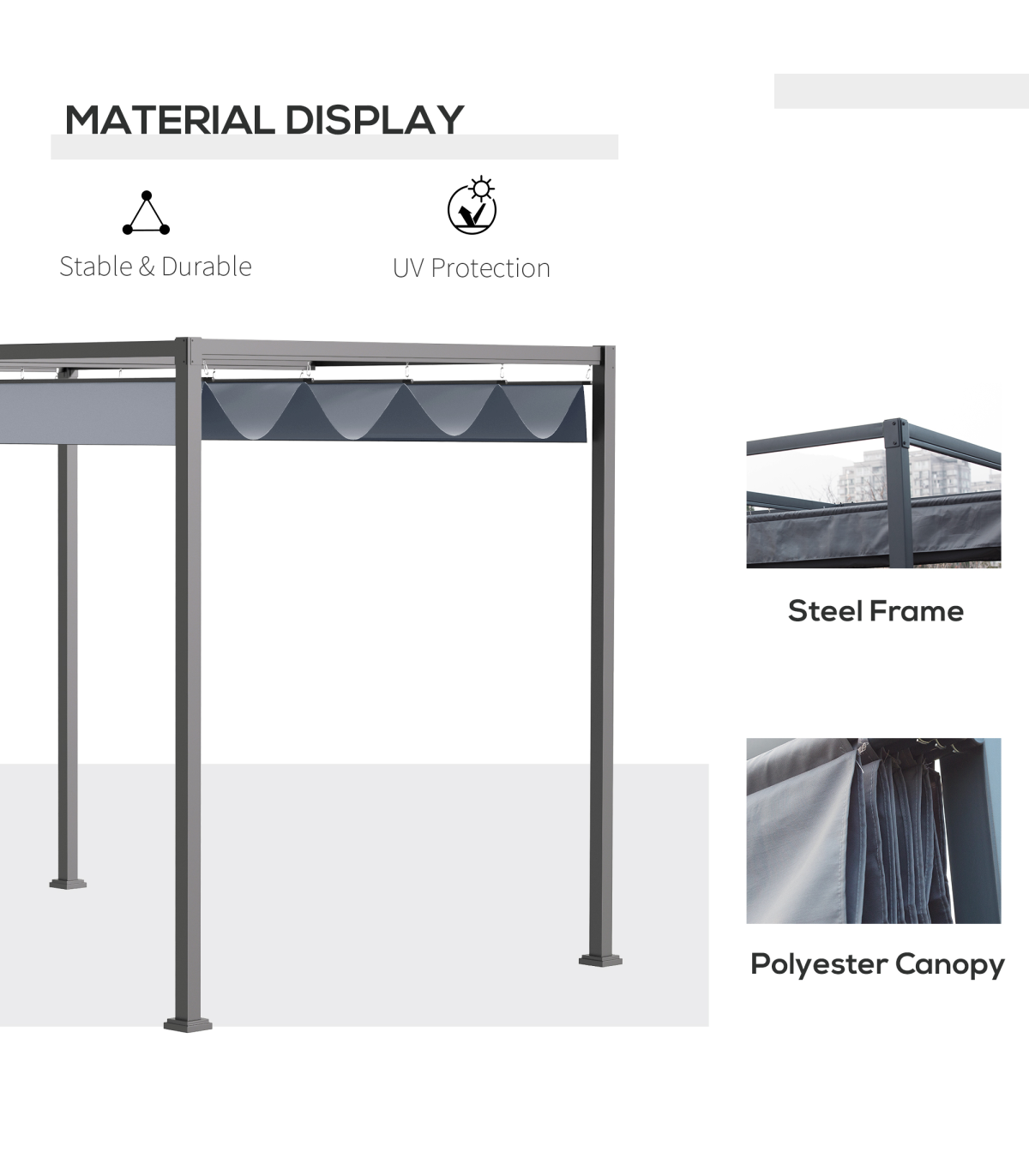 RETRACTABLE CANOPY: The pergola with retractable roof allows you to create shade at a specific spot when needed. Suitable for shielding yourself from the sun any time of day. Beautiful and functional piece - will impress guests at your outdoor gatherings.METAL FRAME: A tough structure which stands steadily, powder coated for extra strength. Rust-resistant means the pergola kit is suitable for outdoor use.UV-RESISTANT CANOPY: Top coating of the garden pergola helps protect you from sun damage for safety outdoors.EASY TO ASSEMBLE: Will be up in no time, with eight anchor bolts to fix to the floor - keeping the metal pergola stable where possible.DIMENSIONS: 222H x 400L x 300Wcm. Canopy: 384L x 300Wcm.