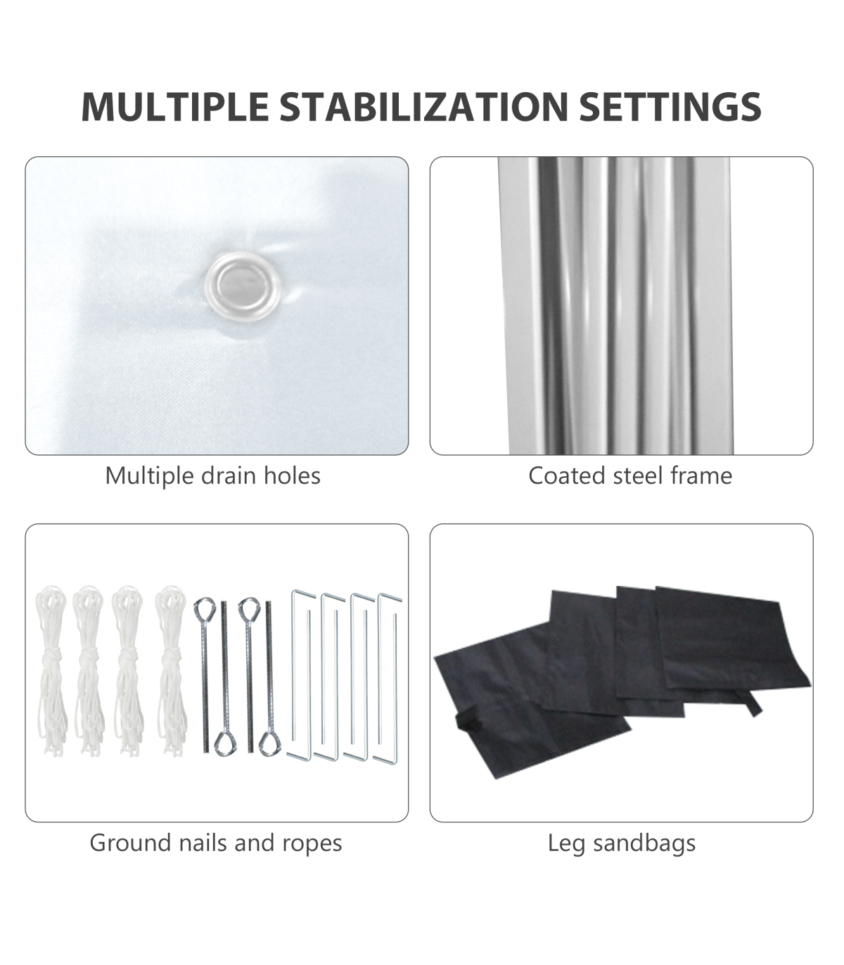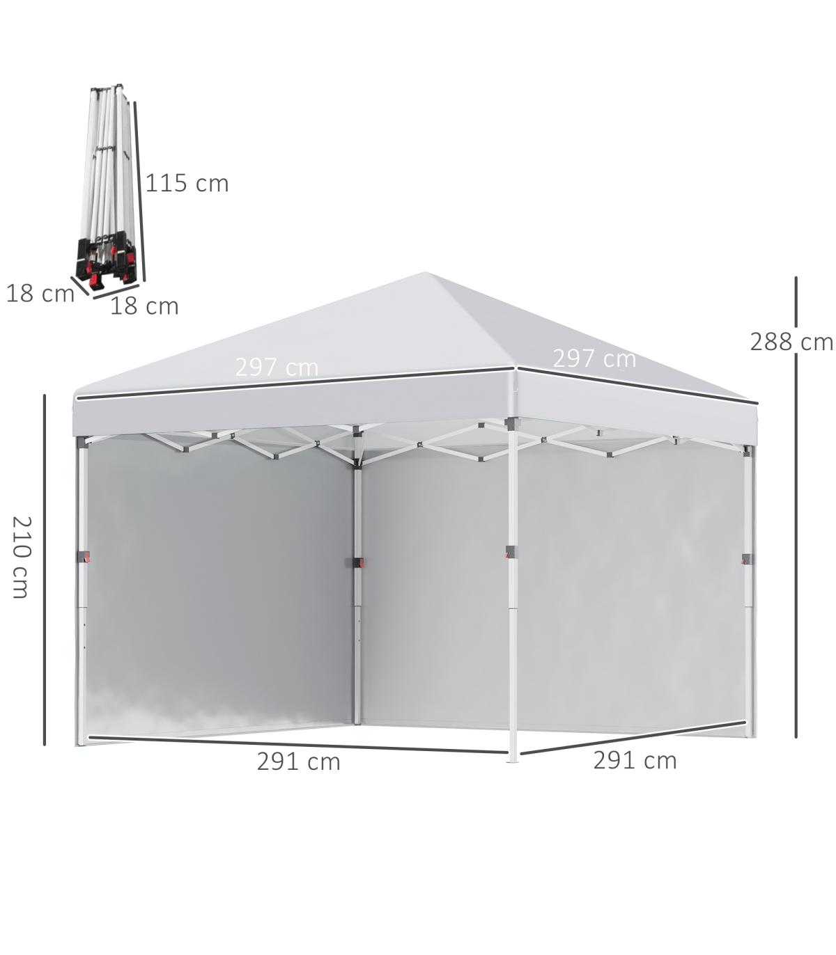 Two wall design: Garden gazebo is a mix of an open and closed design - creating a safe shelter that doesn't feel too cramped with all your guests standing altogether. Walls are also removable.Easy to set up & portable: Pull the garden tent upward, pull the fabric over the frame, stretch the legs, and you're done. The foldable steel frame makes the pop-up tent easy to carry and store in the included storage bag.Custom height canopy: Easily customize the height of your canopy to fit the occasion. Our marquee gazebo with sides has height-adjustable legs that lock in place at the push of a button. Raise or lower your pop-up canopy between three height settings: 274/264/254cm.Accessories included: Four guy ropes, four sandbags and eight ground stakes to secure the garden shelter to the ground.Dimensions: 274H x 297L x 297Wcm. Folded: 18H x 115L x 18Wcm. Do not leave gazebo up in heavy weather conditions. Always use both the included stakes and the guy ropes when using your pop-up gazebo.
