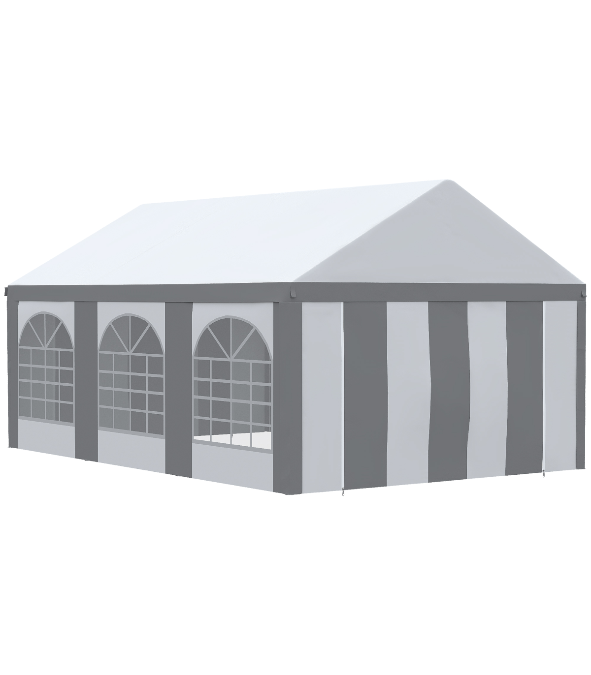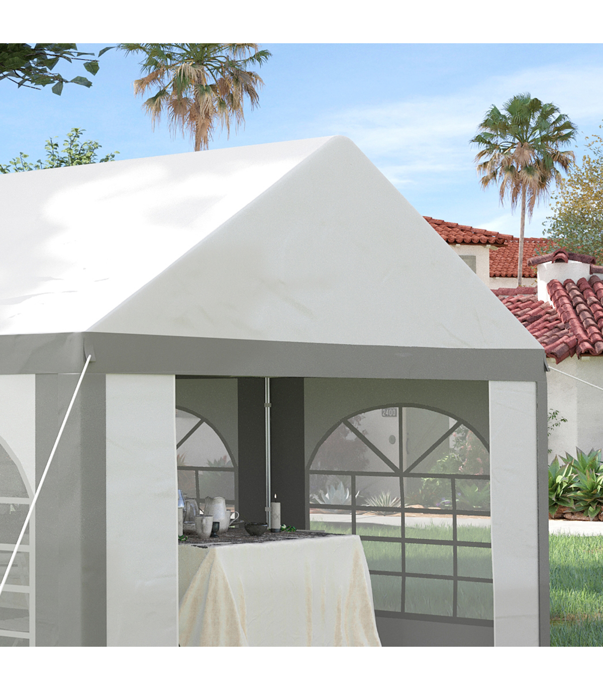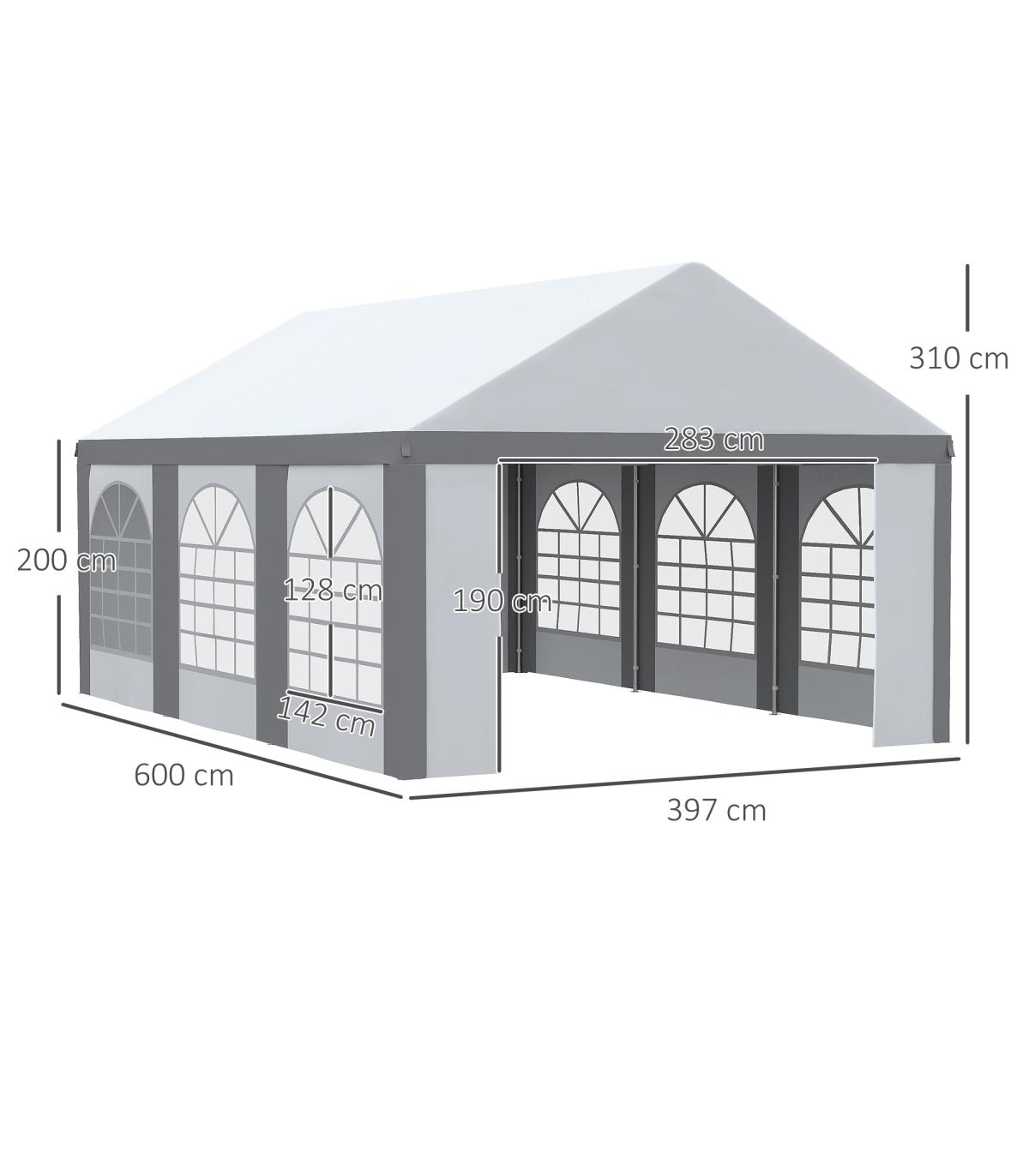 6 x 4m Party Canopy: Party tent holds up to 24 guests - great for gathering your nearest and dearest. Wedding receptions, birthdays, graduation parties, BBQ - and so much more.Six windows and two doors: There's plenty of light allowance in this garden shelter, so it doesn't feel too dark when everyone is inside. The walls of this marquee gazebo with sides can be removed - for a more open feel on hotter days. Two zipped doors for easy entry.Protective roof: Top of this garden tent protects you from direct sunlight and light weather when you're inside this event shelter.Galvanised steel frame: A strong and sturdy structure for this party gazebo. Four guy ropes, four spiral stakes and 16 ground stakes included to pin to the ground.Dimensions: 310H x 600L x 397W cm. Eaves height: 200H cm. Do not leave gazebo up at night or in heavy rain, wind or snow conditions.