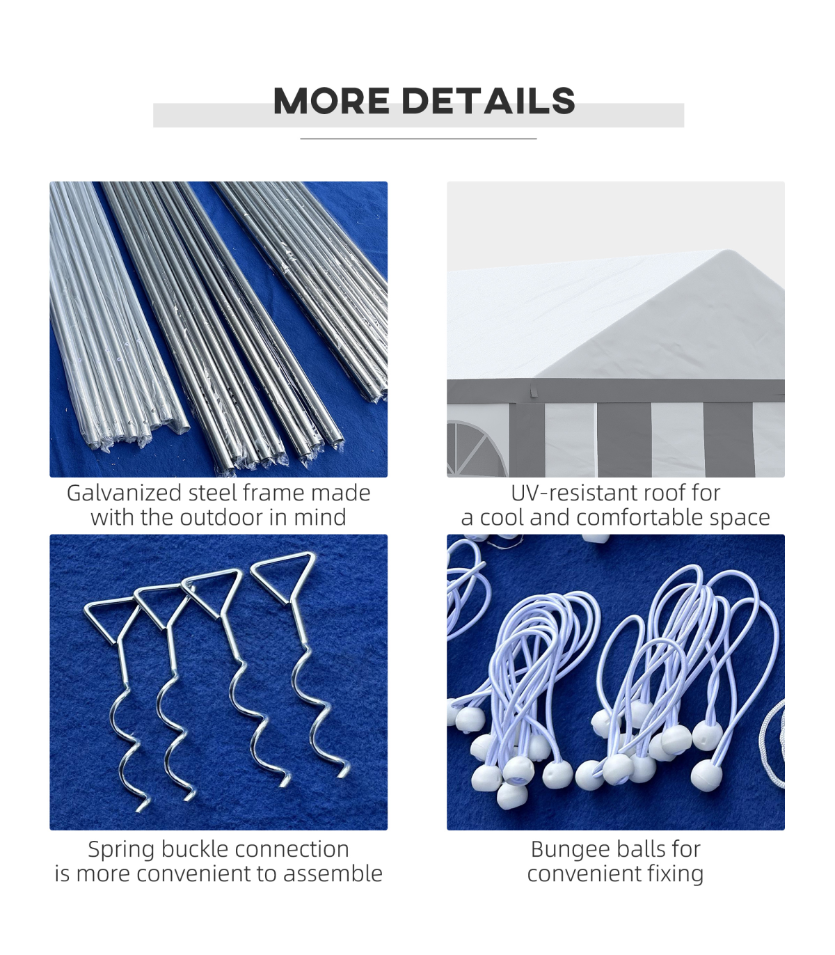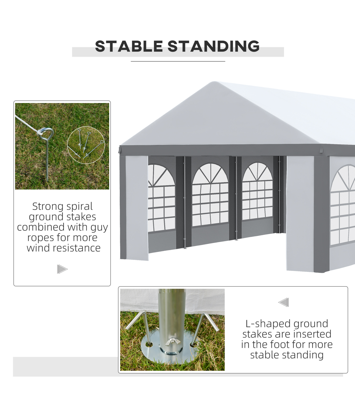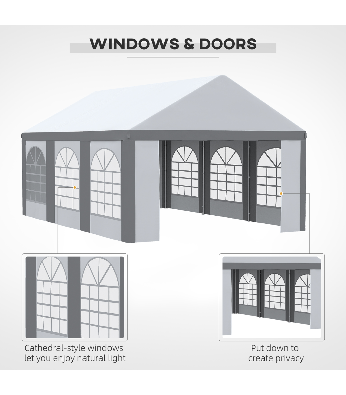 6 x 4m Party Canopy: Party tent holds up to 24 guests - great for gathering your nearest and dearest. Wedding receptions, birthdays, graduation parties, BBQ - and so much more.Six windows and two doors: There's plenty of light allowance in this garden shelter, so it doesn't feel too dark when everyone is inside. The walls of this marquee gazebo with sides can be removed - for a more open feel on hotter days. Two zipped doors for easy entry.Protective roof: Top of this garden tent protects you from direct sunlight and light weather when you're inside this event shelter.Galvanised steel frame: A strong and sturdy structure for this party gazebo. Four guy ropes, four spiral stakes and 16 ground stakes included to pin to the ground.Dimensions: 310H x 600L x 397W cm. Eaves height: 200H cm. Do not leave gazebo up at night or in heavy rain, wind or snow conditions.