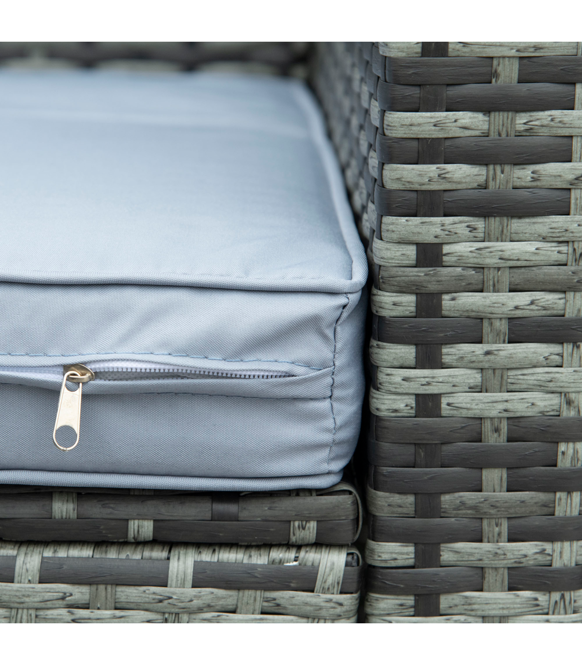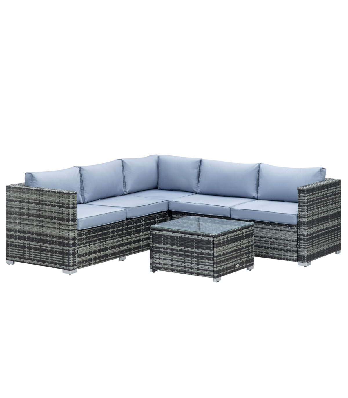 Four-piece garden sofa set: Comes with two loveseats, corner chair and table.11 cushions: Sink in comfortably into this rattan garden furniture set. Removable and washable covers.Steel frame, wrapped in rattan: Each piece in this rattan furniture set has a strong core: plastic wicker over the top for extra protection and double the durability.Glass-top coffee table: Keep things close as you relax on this outdoor corner sofa set. Sleek and solid top.Dimensions: Chair: 66W x 66D x 62Hcm. Loveseat: 124W x 66D x 62Hcm. Table: 58L x 58W x 36Hcm. Assembly required.