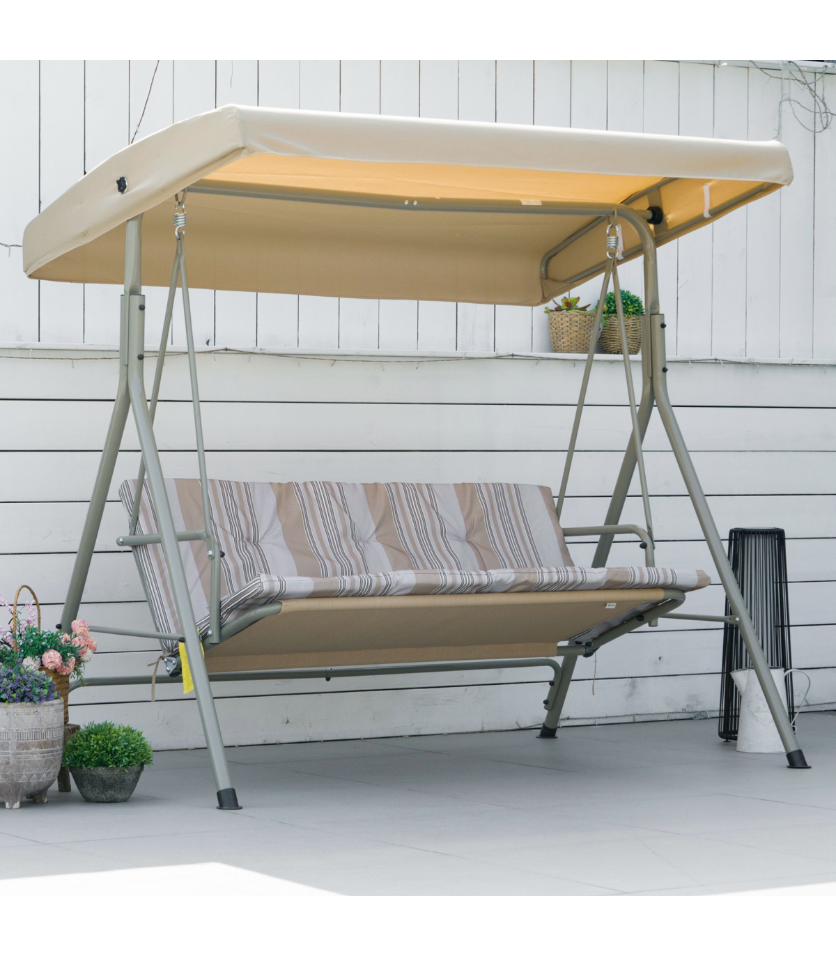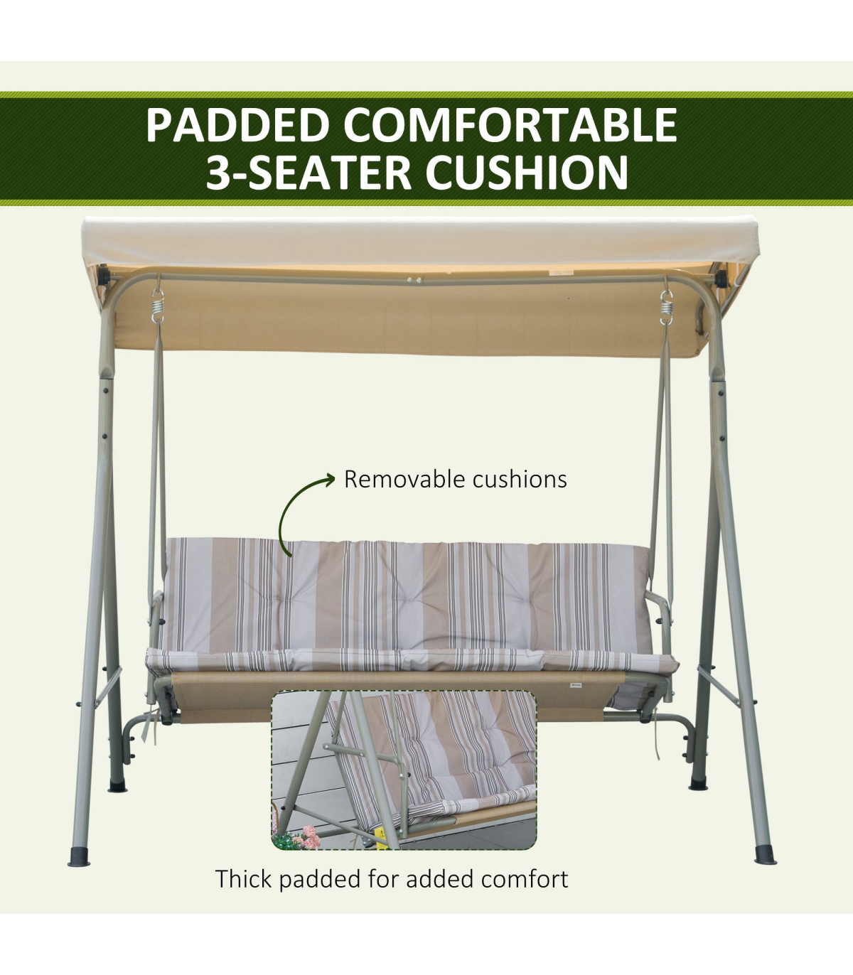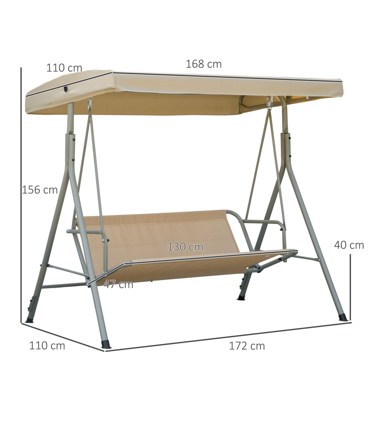 Three person swing seat: Relax with your kids or even on your own with this swing chair with a canopy.Comfortable: For all-day comfort, the garden swing seat comes with a removable padded cushion.Overhead canopy: Adjustable angle, our swinging chair with canopy will protect you from the sun, UV and light rain and wind.Steel frame: Metal swinging garden chair offer stability and strength over the long term.Anti-skid feet pads: Stops 3 seater garden swing moving for safety. Dimensions: 172L x 110W x 156H cm. Seat Dimensions: 130L x 47W cm. Maximum Weight Capacity 300kg. Assembly required.