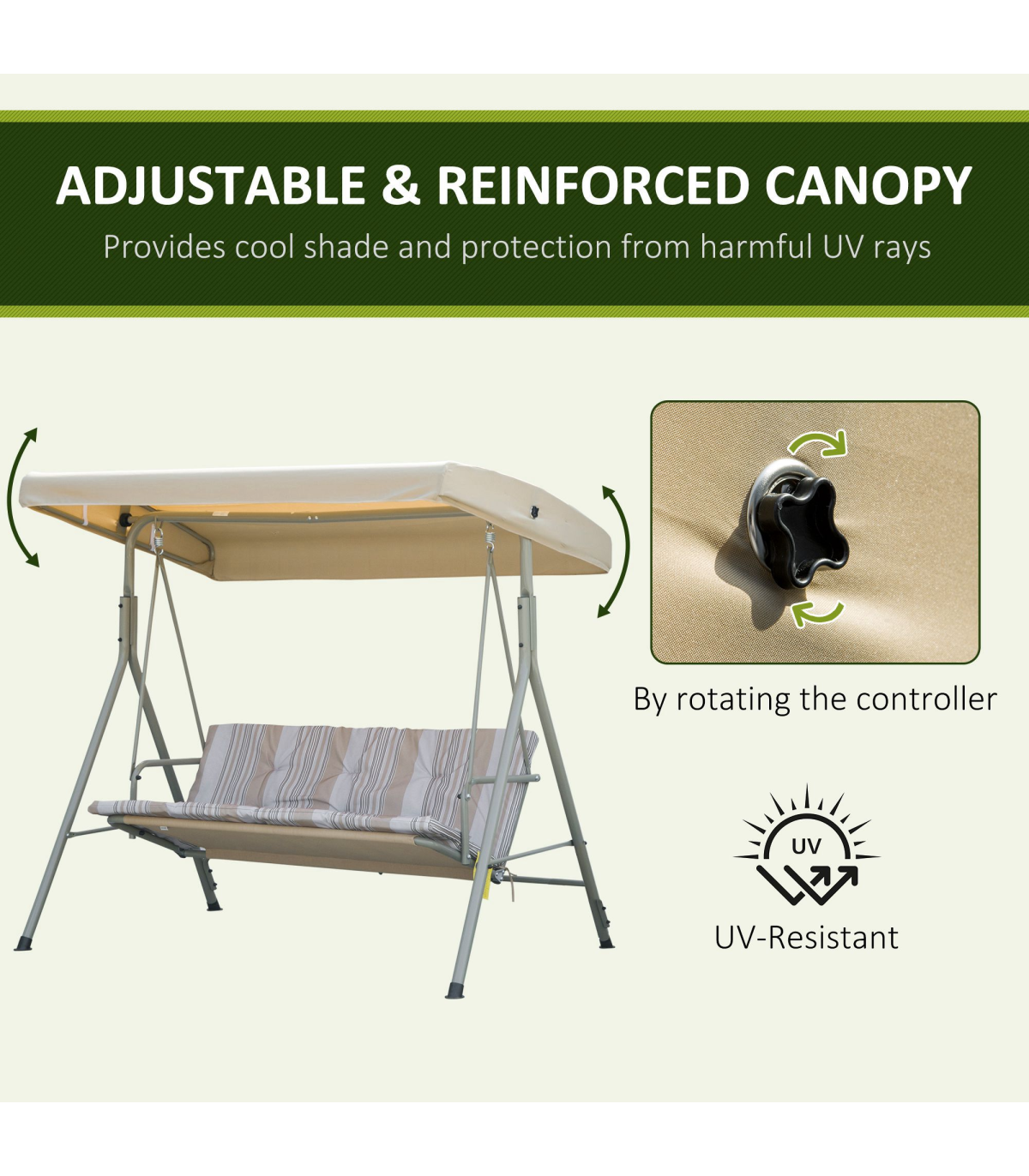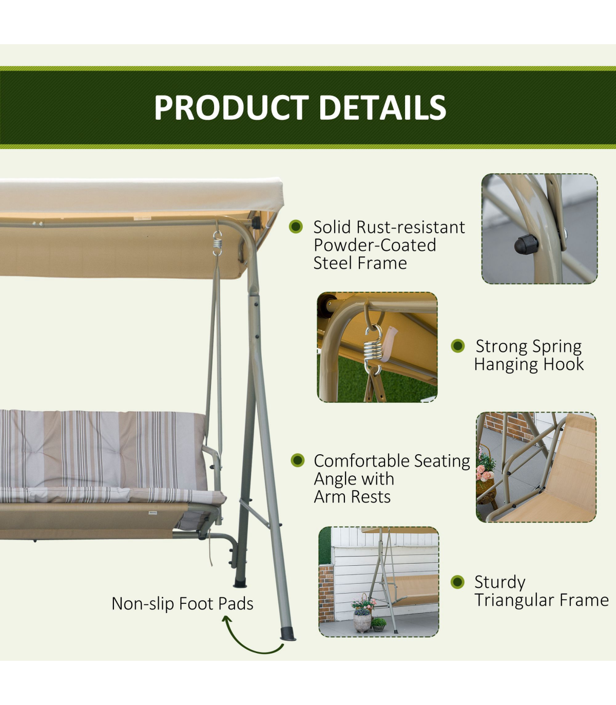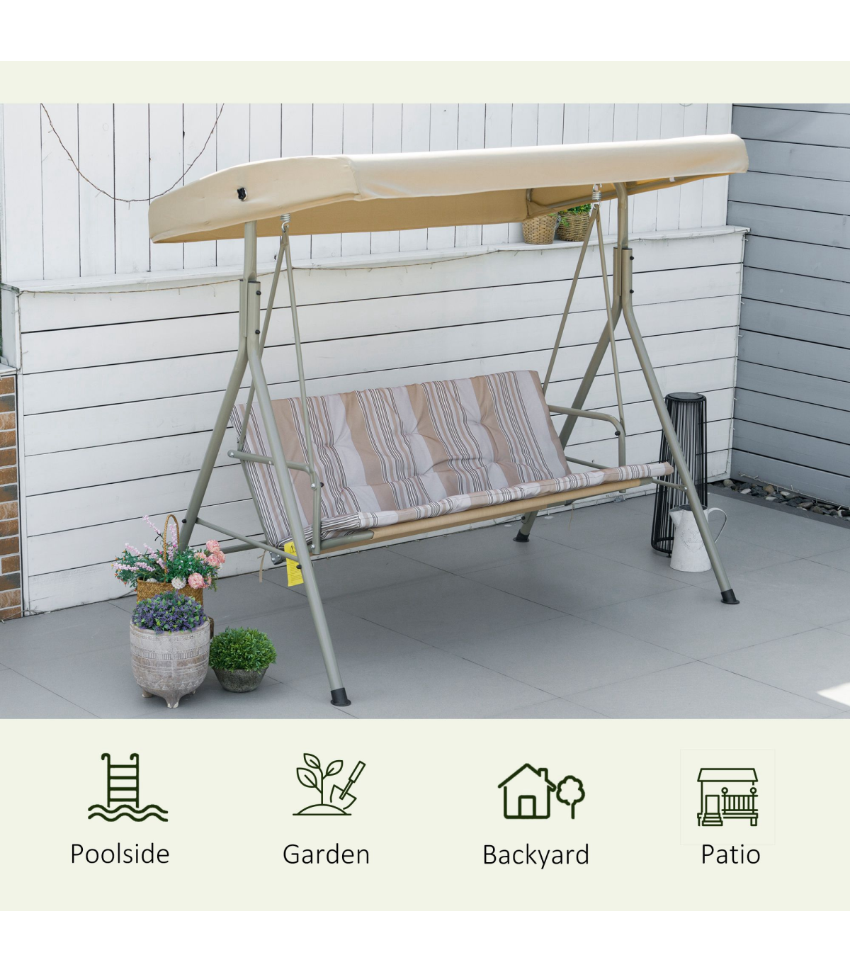 Three person swing seat: Relax with your kids or even on your own with this swing chair with a canopy.Comfortable: For all-day comfort, the garden swing seat comes with a removable padded cushion.Overhead canopy: Adjustable angle, our swinging chair with canopy will protect you from the sun, UV and light rain and wind.Steel frame: Metal swinging garden chair offer stability and strength over the long term.Anti-skid feet pads: Stops 3 seater garden swing moving for safety. Dimensions: 172L x 110W x 156H cm. Seat Dimensions: 130L x 47W cm. Maximum Weight Capacity 300kg. Assembly required.