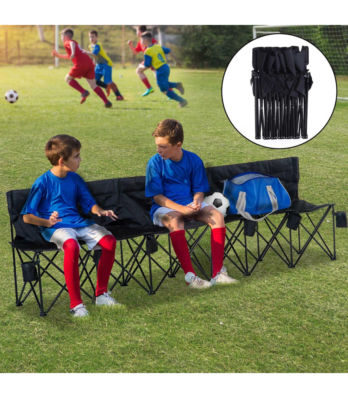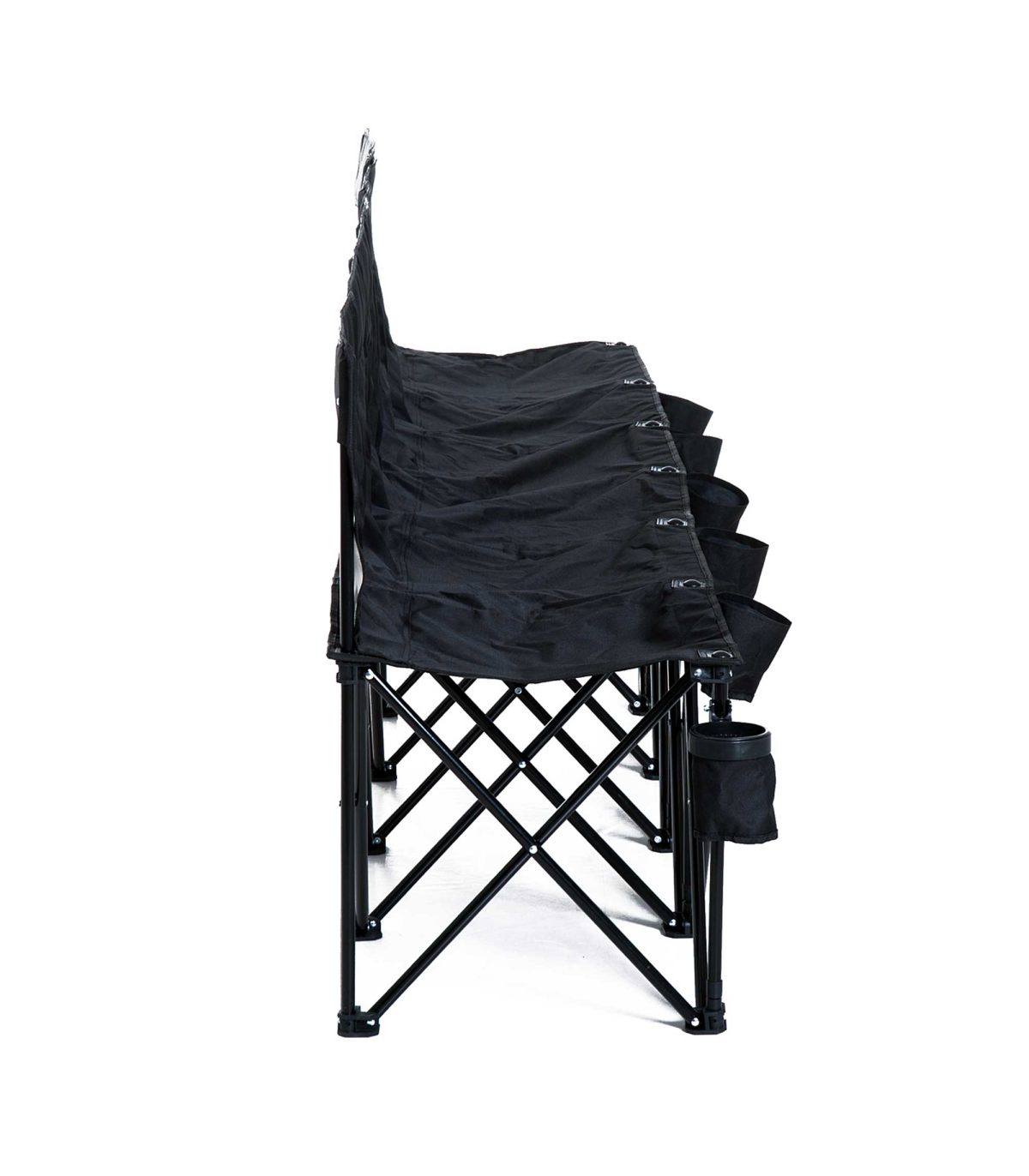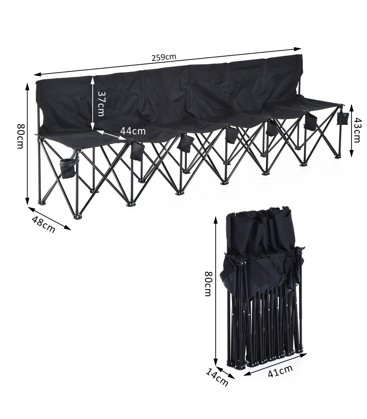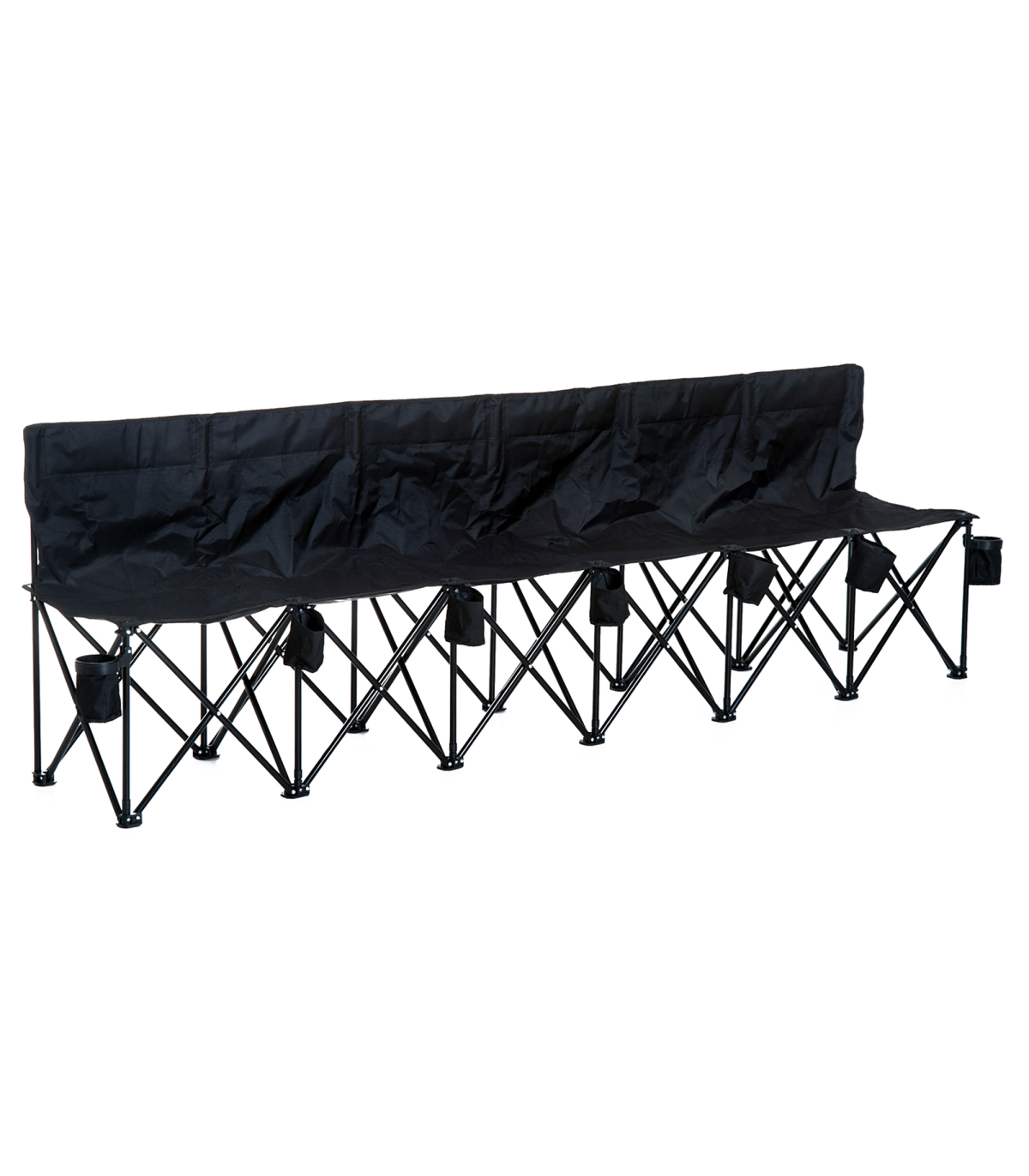 - Comes in 6 seater combination - Folds up easily, neatly and conveniently - Connected nylon seats with collapsible steel frames - Each seat has 114kg weight capacity - Including a carry case made from durable 600D nylon - Perfect for outdoor team activities, such as soccer, camping, baseball, etc - The left and right cup holders can be removable, while the middle five can not