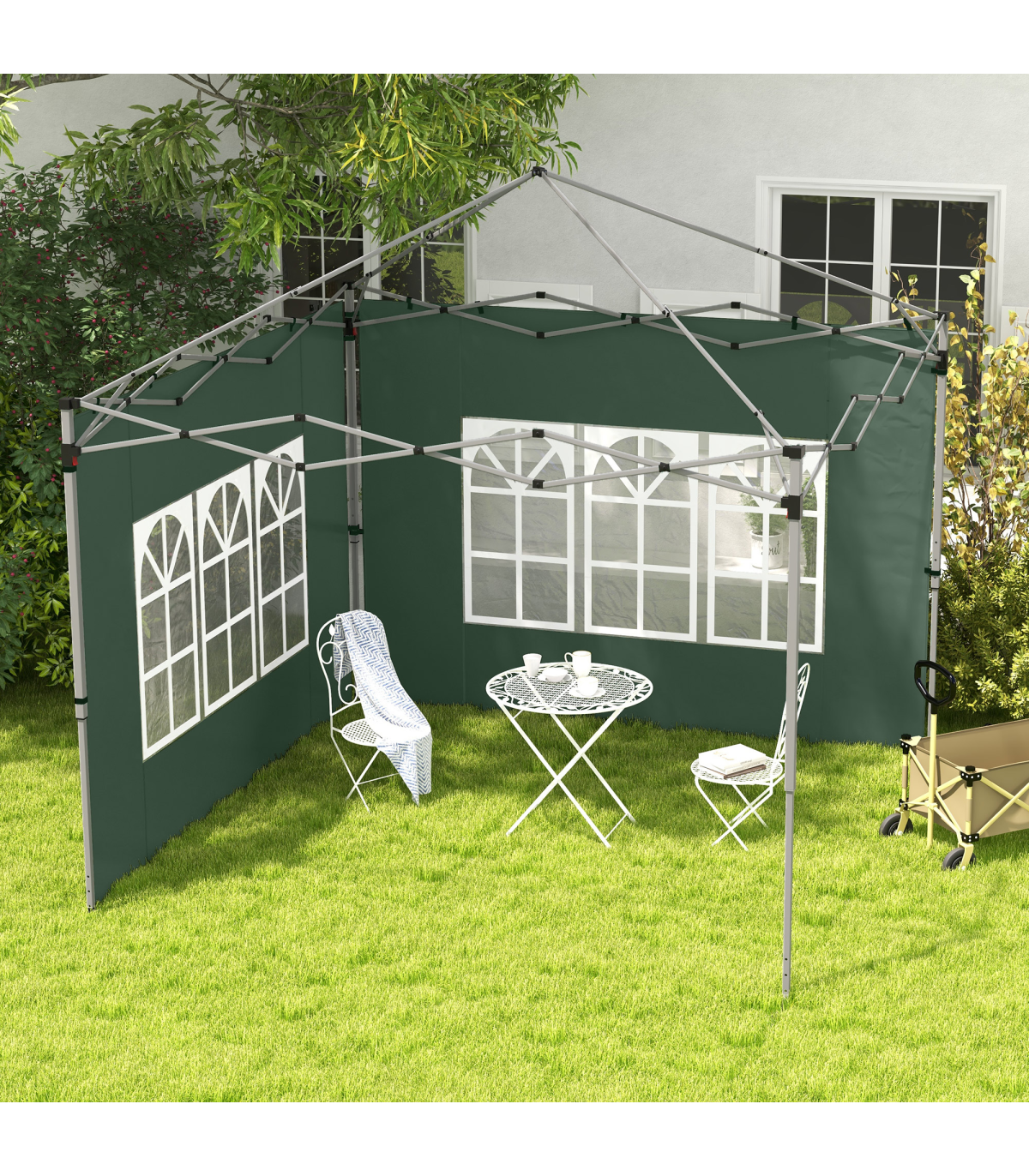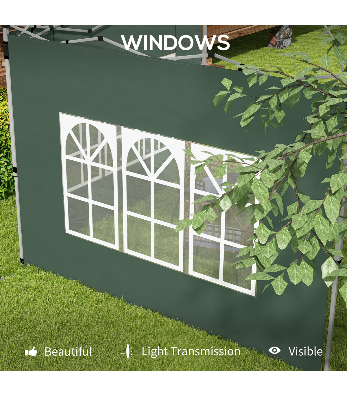Designed to fit a 3x3(m) or 3x4m pop up canopy tent Windows let in lots of light and provide unobstructed views Oxford cloth ensures durability Straps for easy installation Colour: Green Materials: Oxford, Plastic Single Panel Dimensions: 295W x 195Hcm Window Size: 180L x 102Wcm Designed to fit a 3x3(m) or 3x4m pop up canopy tent Item Label: 84C-458V00GN