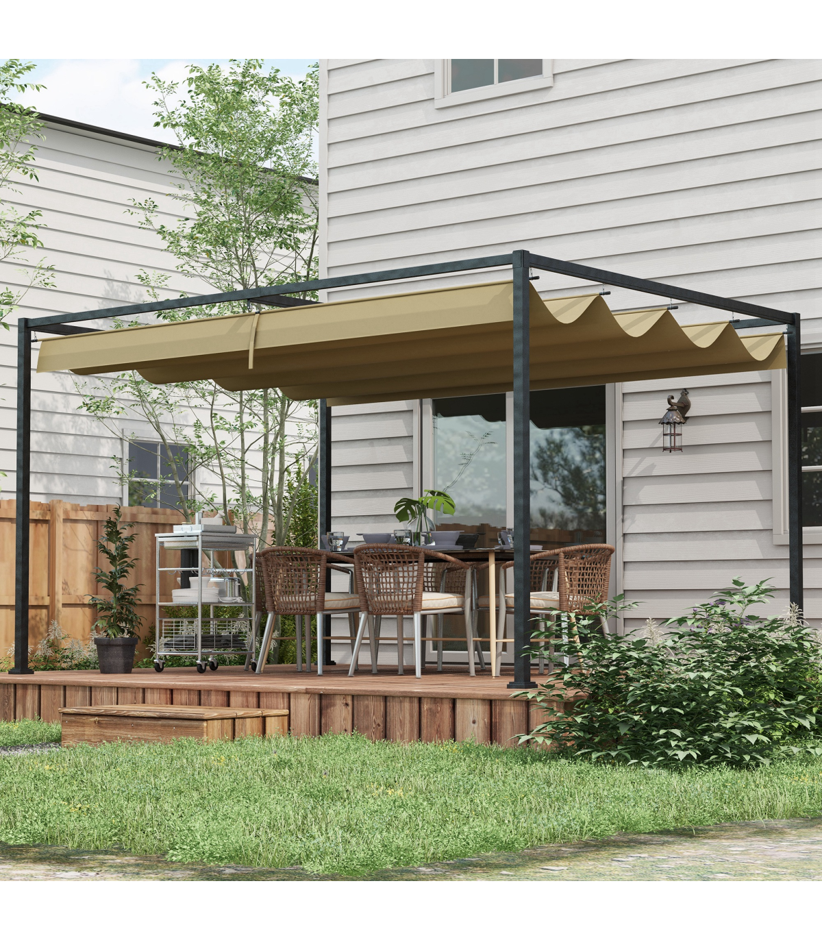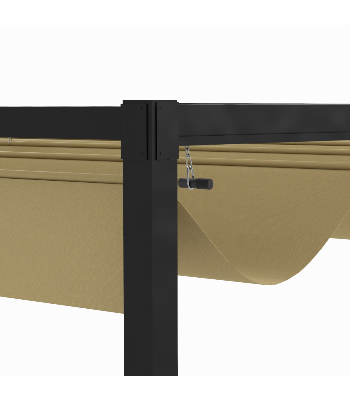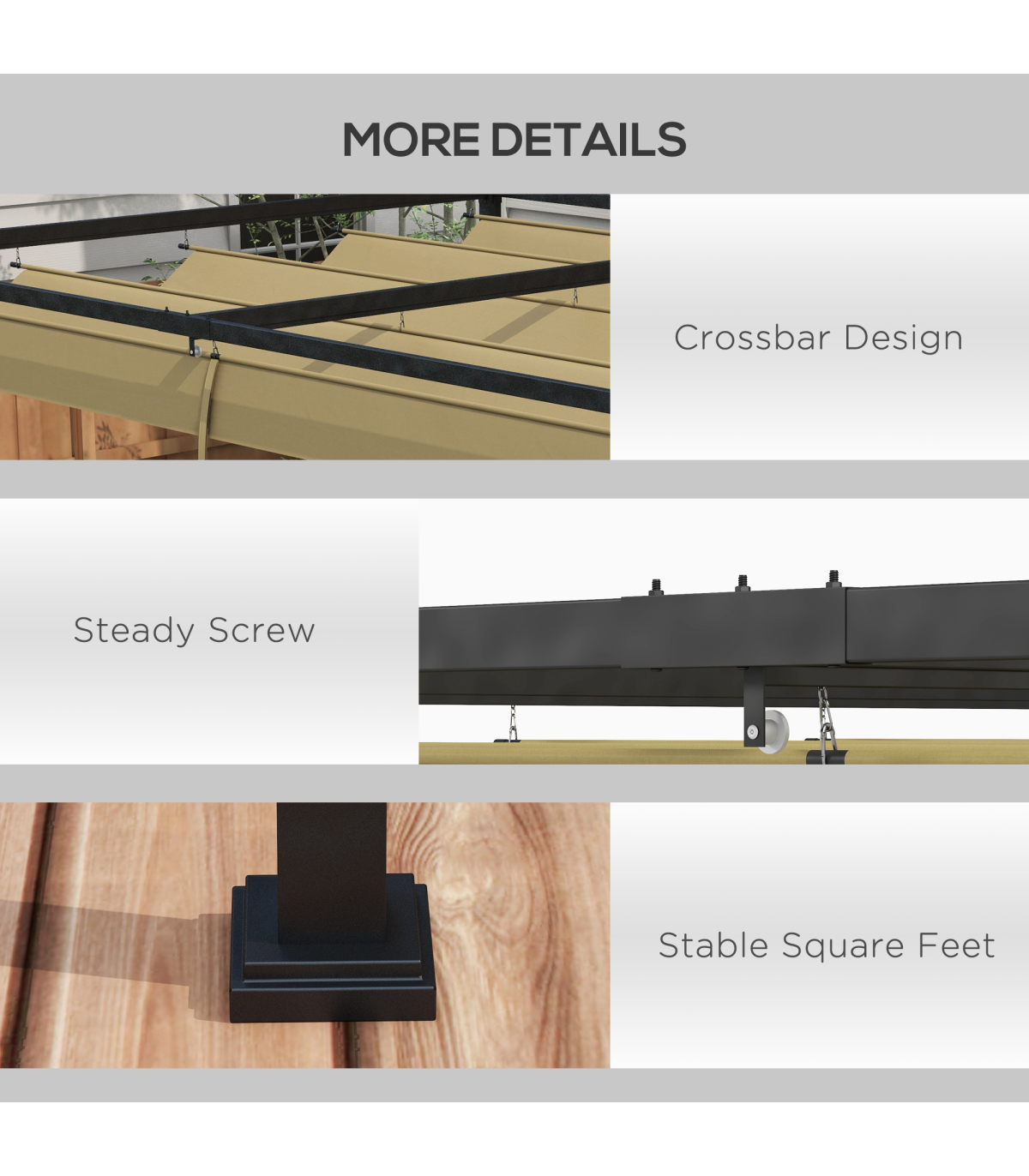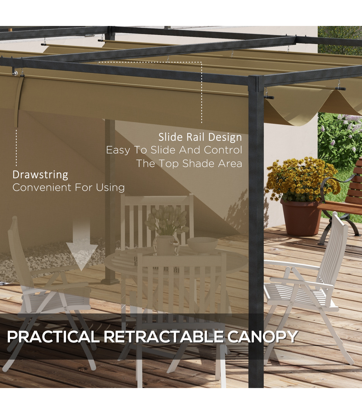 ● Adjustable canopy top blocks sunlight and light rain underneath at any point