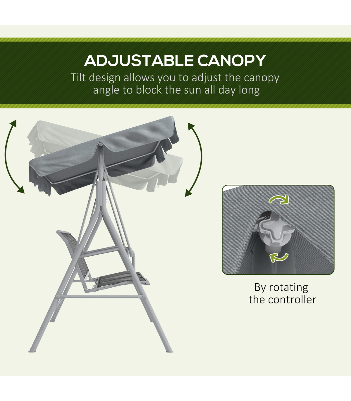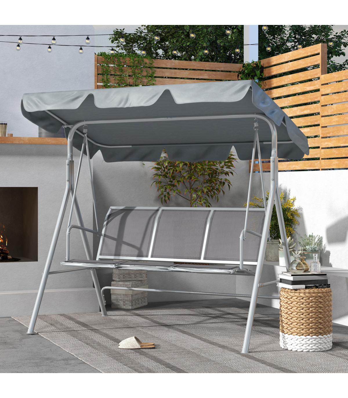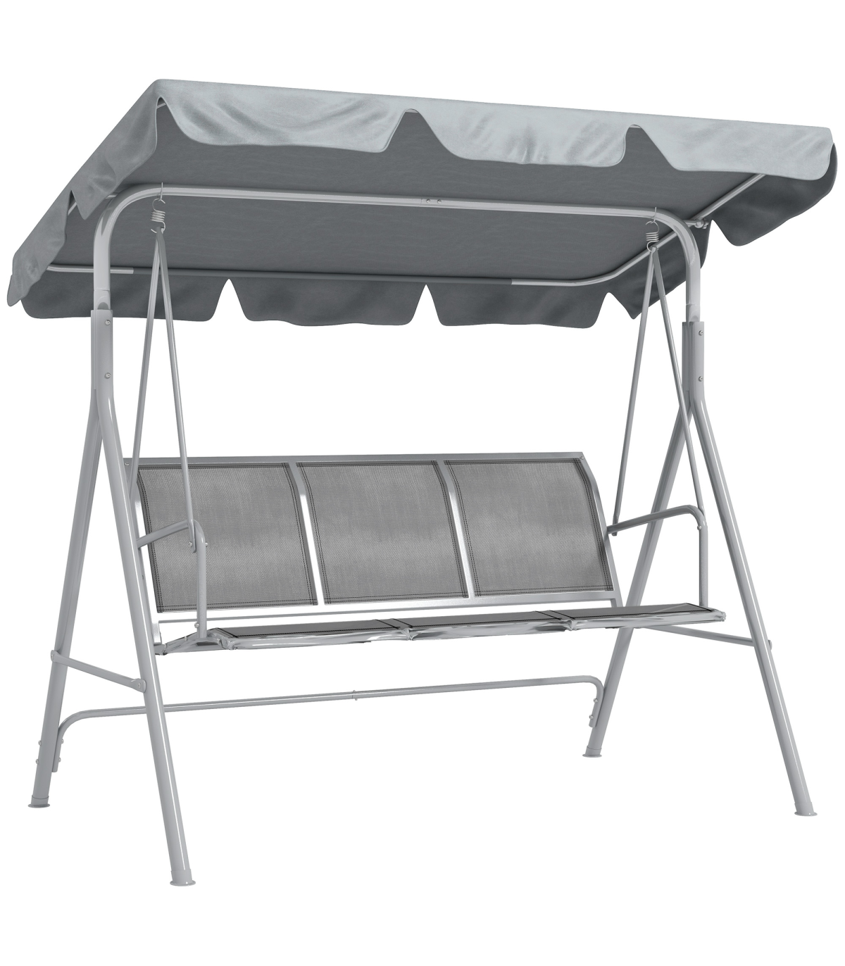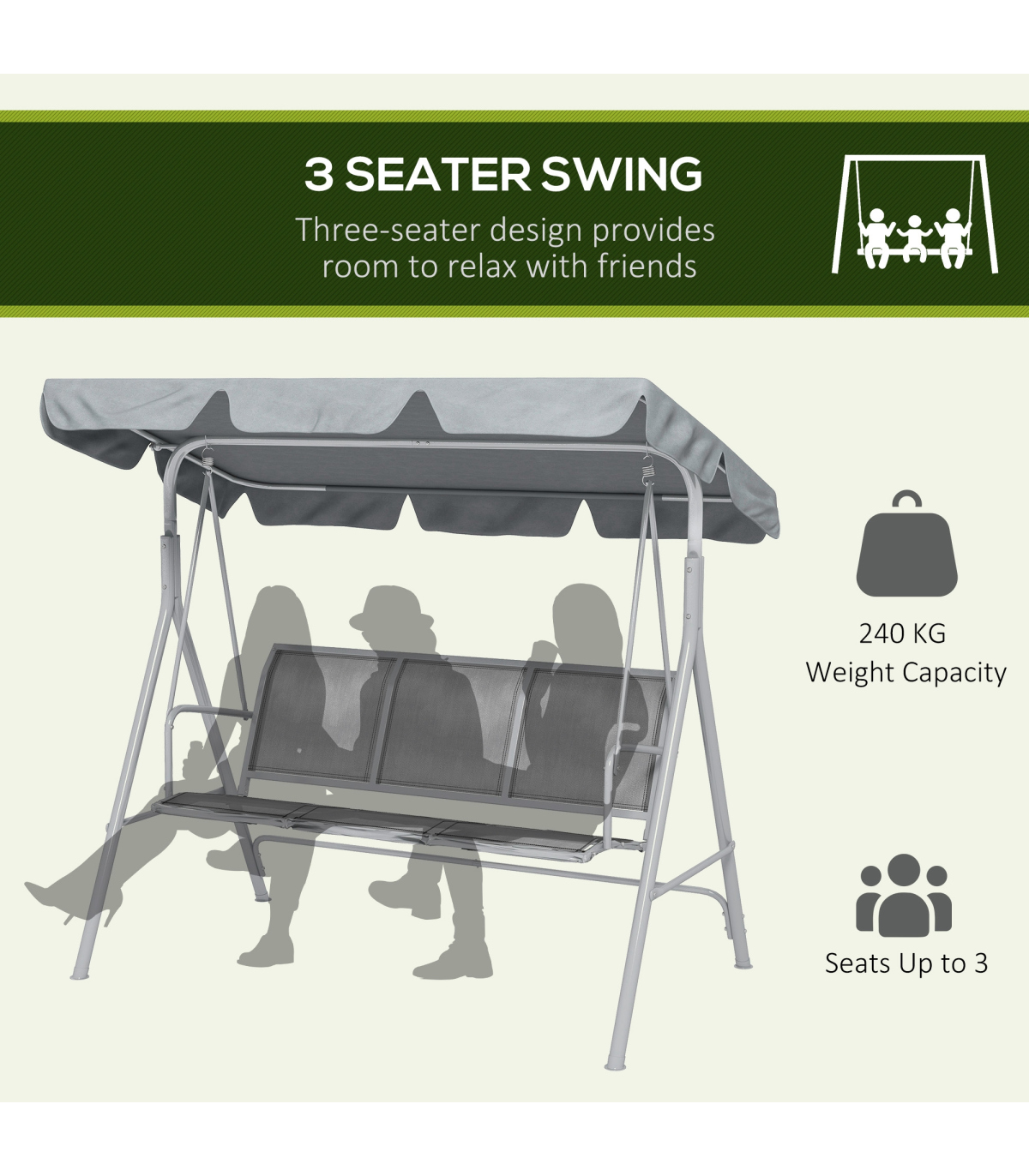 - "Outsunny Metal Swing Chair Garden Hammock 3 Seater Patio Bench with Canopy, Grey" - Description: - Made from rust-resistant metal for optimum durability - Features a UV-protected polyester canopy to provide shelter - Sling fabric seating for up to 3 people with a maximum load capacity of 240kg - Adds a soothing swing motion to your patio or garden decor - Low maintenance with a removable cover for easy washing - Assembly required - Colour: Light Grey, Silver - Material: Metal, Polyester, Texteline - Overall Size: 171L x 108W x 154Hcm - Canopy Size: 166L x 111Wcm - Seat Size: 131W x 47.5D x 42Hcm - Weight Capacity: 240kg - Item Label: 84A-059LG