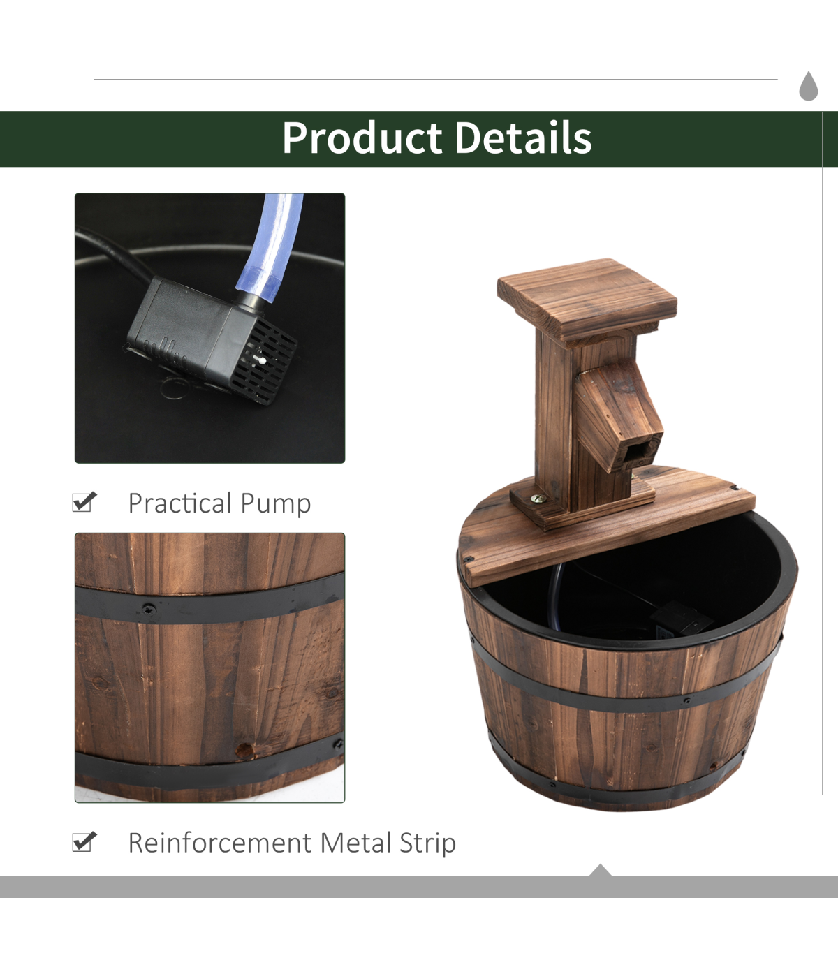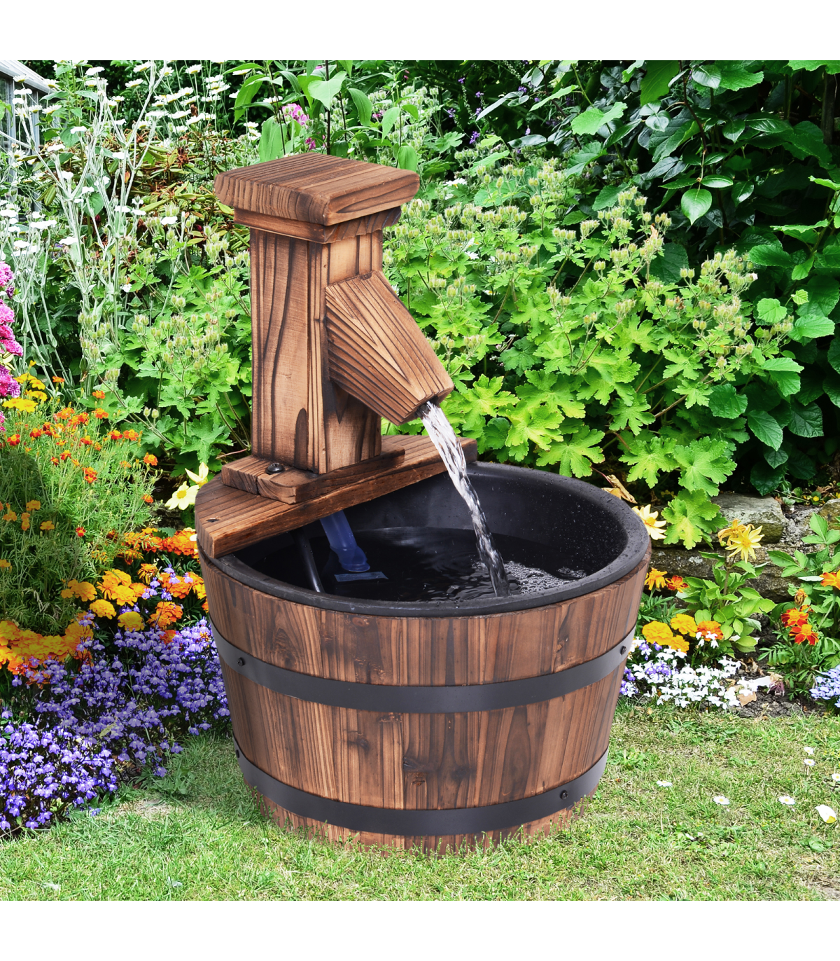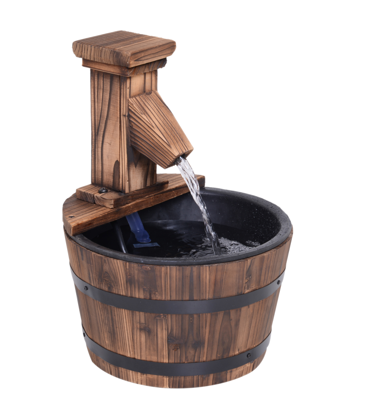 - Retro styled wood barrel fountain pump adds a unique touch to your garden and outdoor areas