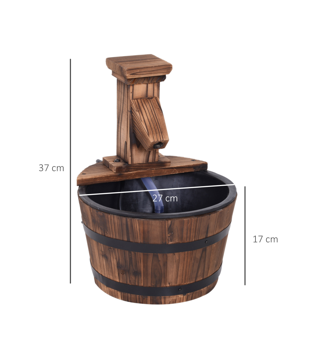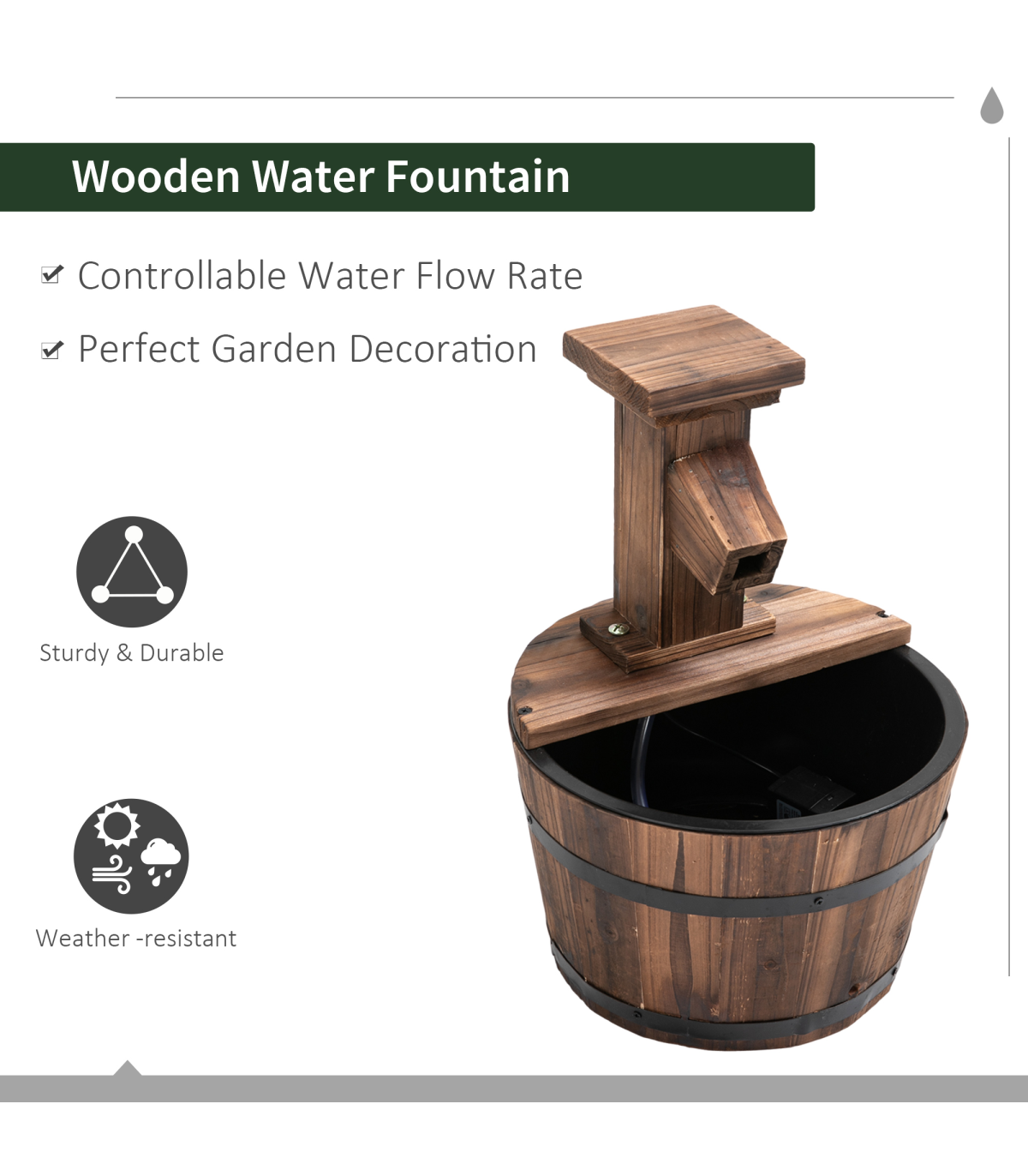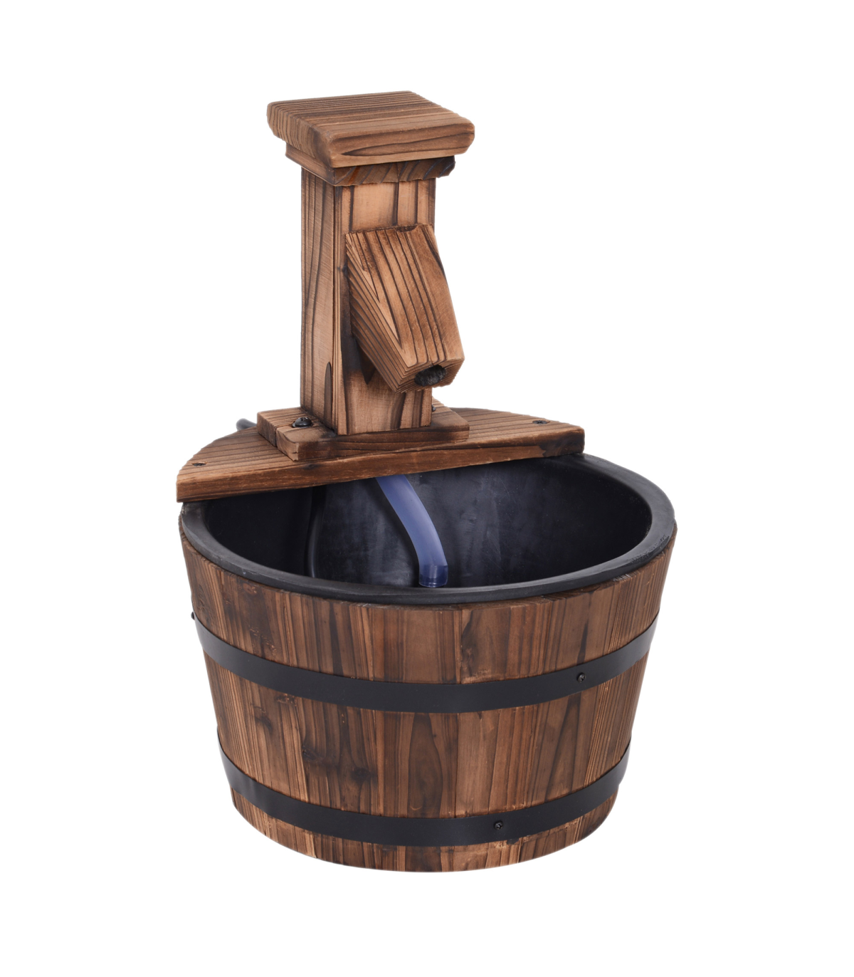 - Retro styled wood barrel fountain pump adds a unique touch to your garden and outdoor areas