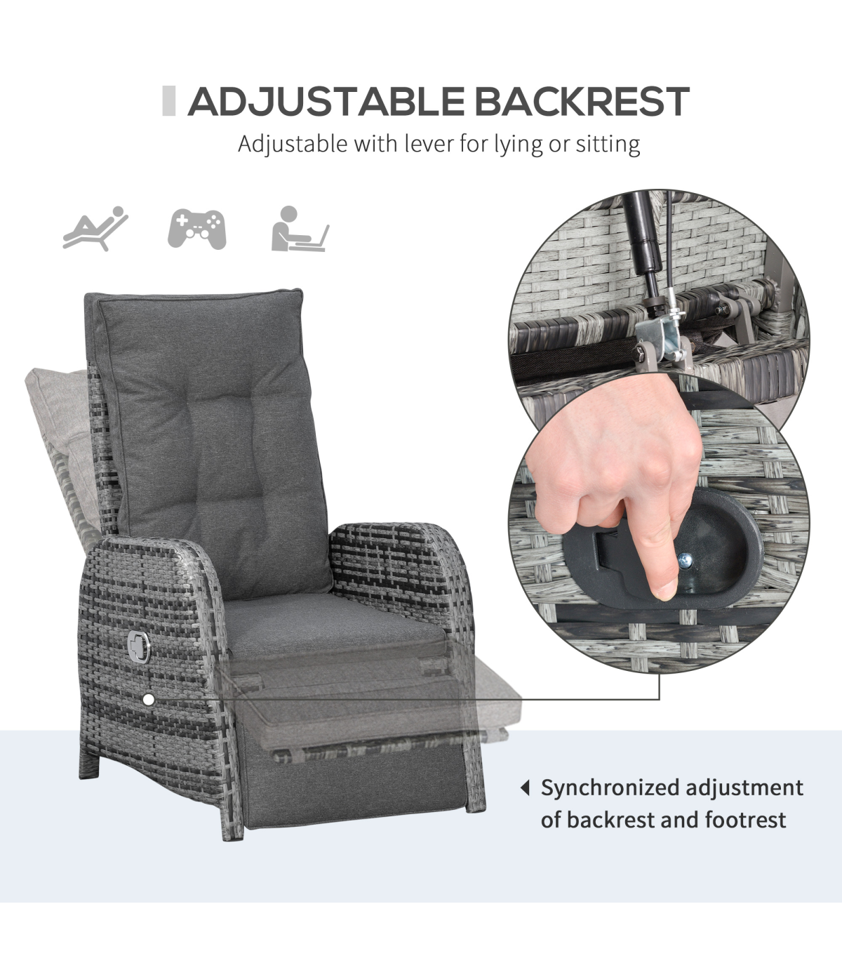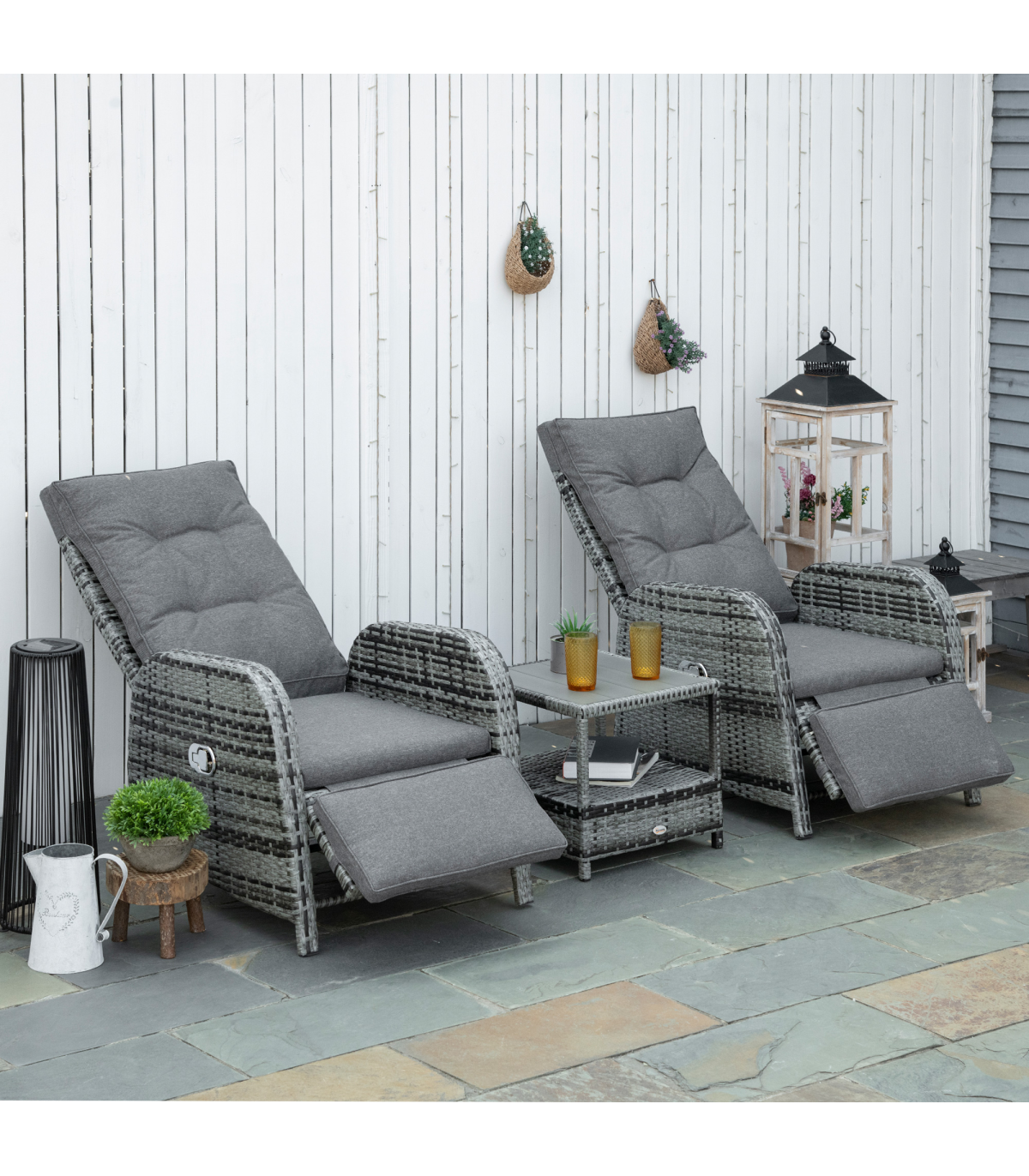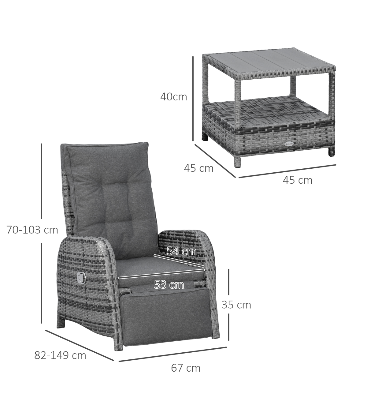 Your time spent relaxing outdoors just got so much better. Bring this seating set from Outsunny into the garden and beyond for unrivaled comfort. Formed of three pieces two large reclining armchairs and a matching table. The main frame is made from aluminium so it's tough and supportive, with each piece wrapped in PE rattan to ensure strength and protection against the elements. Each chair reclines back to a maximum angle, and the footrest lifts up too. Both chairs come with seat and back cushions for comfort. A must-have set now the warmer days are fast approaching.