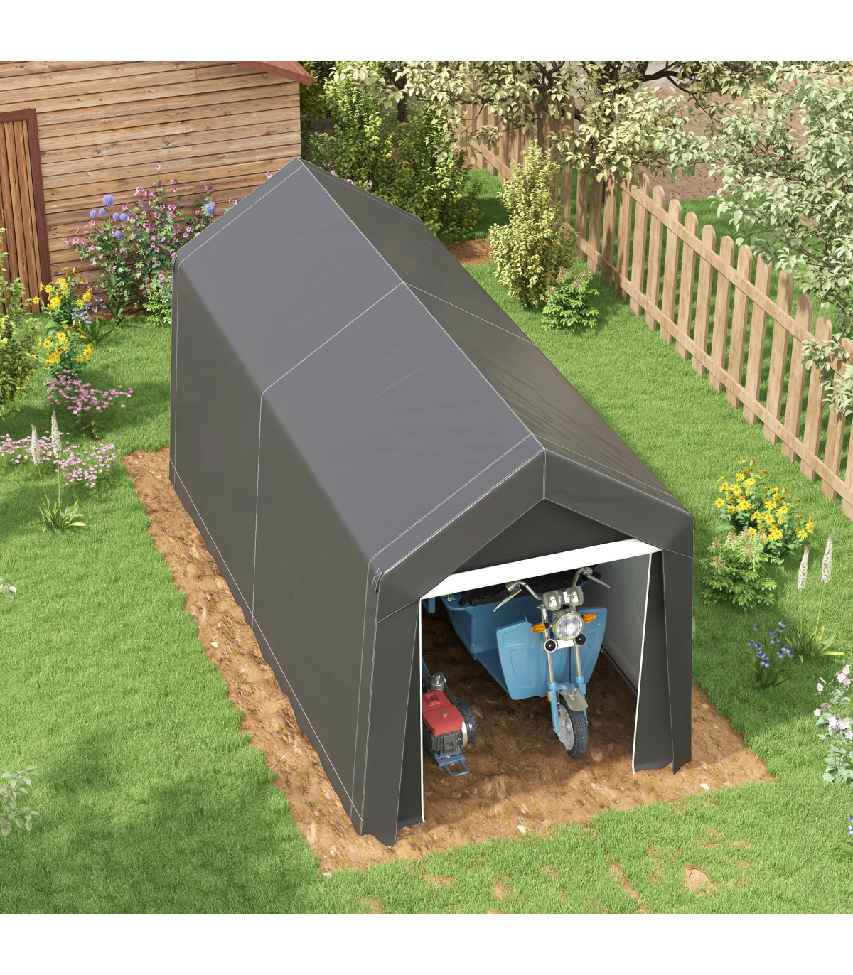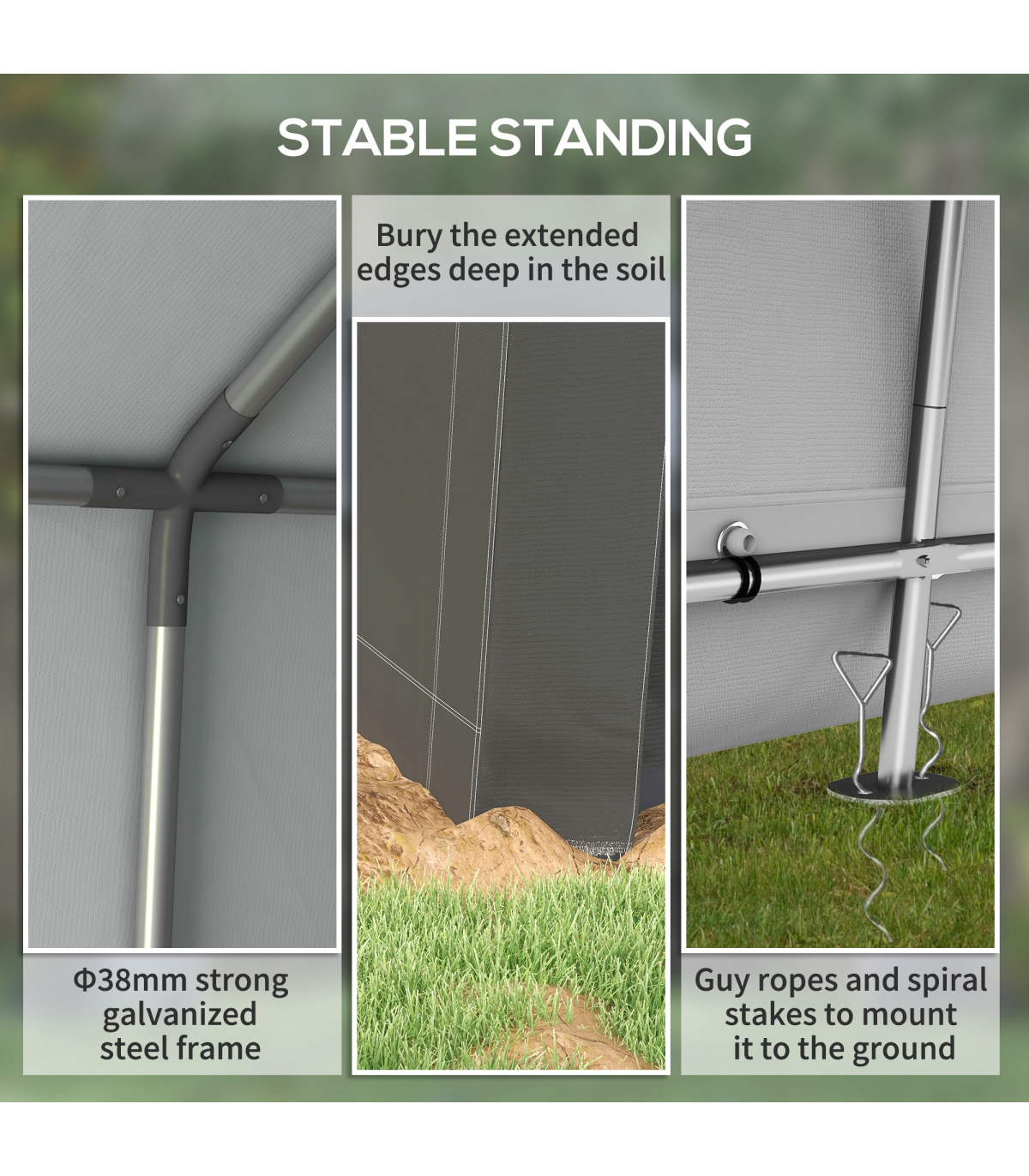 ● Extended edges and stakes mount to ground