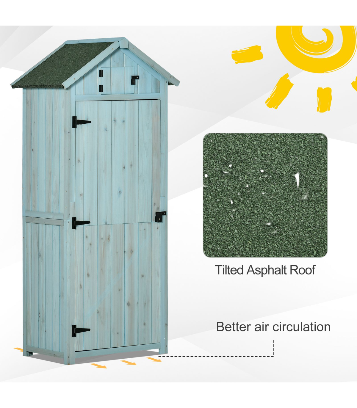 The backyard storage shed from Outsunny is an ideal solution for organizing all your garden tools and equipment. You can place small items on 3 shelves and store bigger tools in the larger area. This vertical storage shed is made of durable solid wood for sturdy and strong construction. The wooden surface covered with waterproof paint and the roof with asphalt help provide added protection outdoors. The tool cabinet is designed to be an elegant and practical addition to your garden.