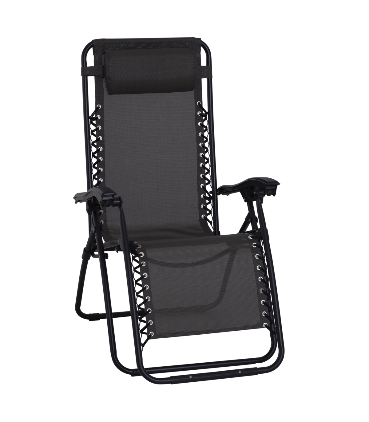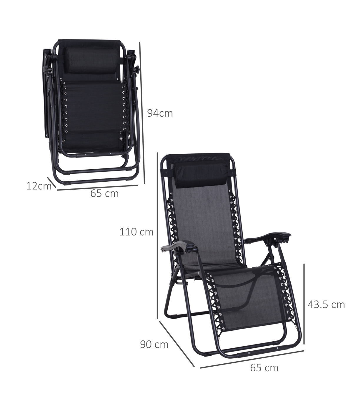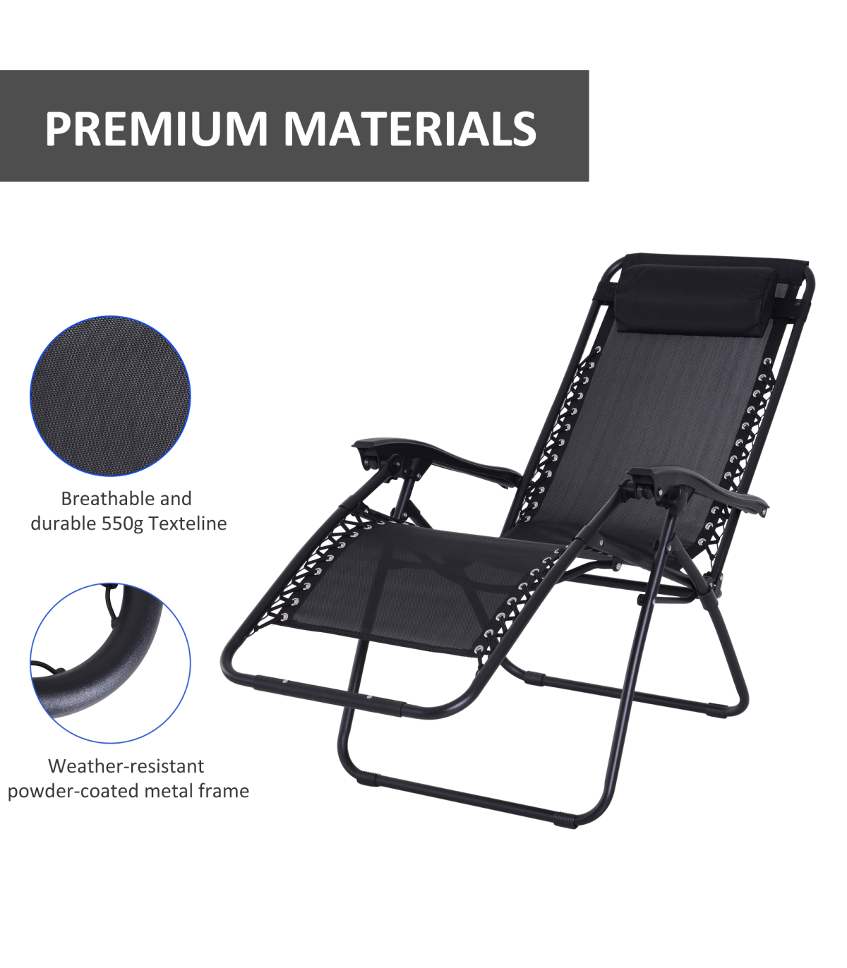 Zero Gravity Chair Adjustable Patio Lounge Chair Reclining Seat" Description: "Take your sun relaxation time to the next level with this zero gravity outdoor chair from Outsunny. Evenly distributing your weight, it helps to relieve all aches and pains whilst providing your body with all the support it may need. Made from sturdy steel in a powder coated finish, the frame has been built to last for years to come as it won't peel or rust. It also can recline and lock into any position, meaning this is a chair that truly suits your needs and it is finished with a texteline cover, padded headrest, and contoured armrest. It’s the perfect gateway to total relaxation in your garden, patio or balcony." Features: - Powder-coated steel frame for strength and durability - Texteline fabric cover allows your body to breathe in the heat - Lockable reclining system to adjust to any position - Padded headrest and contoured armrests for added support and comfort - Foldable design, making it easy to carry and store when not in use - Zero-gravity design for stress-free and weightless relaxation experience every time Specification: - Item Name: Sun Lounger - Brand Name: Outsunny - Material: Steel Frame, Texteline - Net Weight: 7.2kg - Colour: Black - Overall Dimension (upright): 90L x 65W x 110Hcm - Reclining Dimension: 160L x 65W x 79Hcm - Folded Dimension: 65L x 12W x 94Hcm - Seat Size: 52L x 43.5Wcm - Seat Height: 43.5cm - Pillow Size: 35L x 15W x 5T (cm) - Weight Capacity: 150kg - Flat Pack: NO - Assembly Required: NO - Custom Label: 84B-227BK