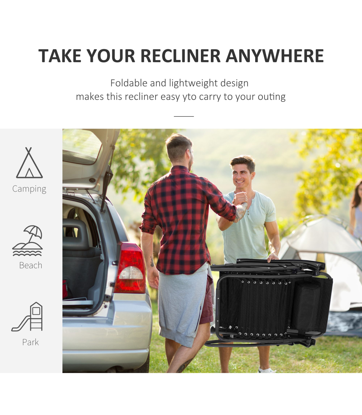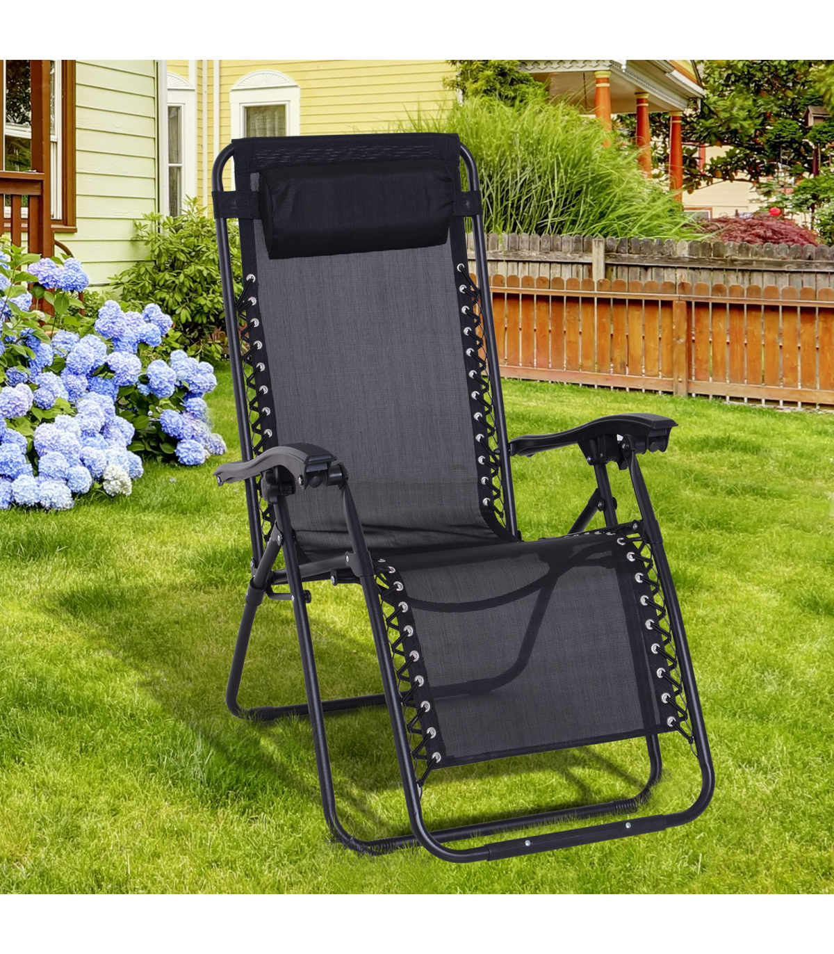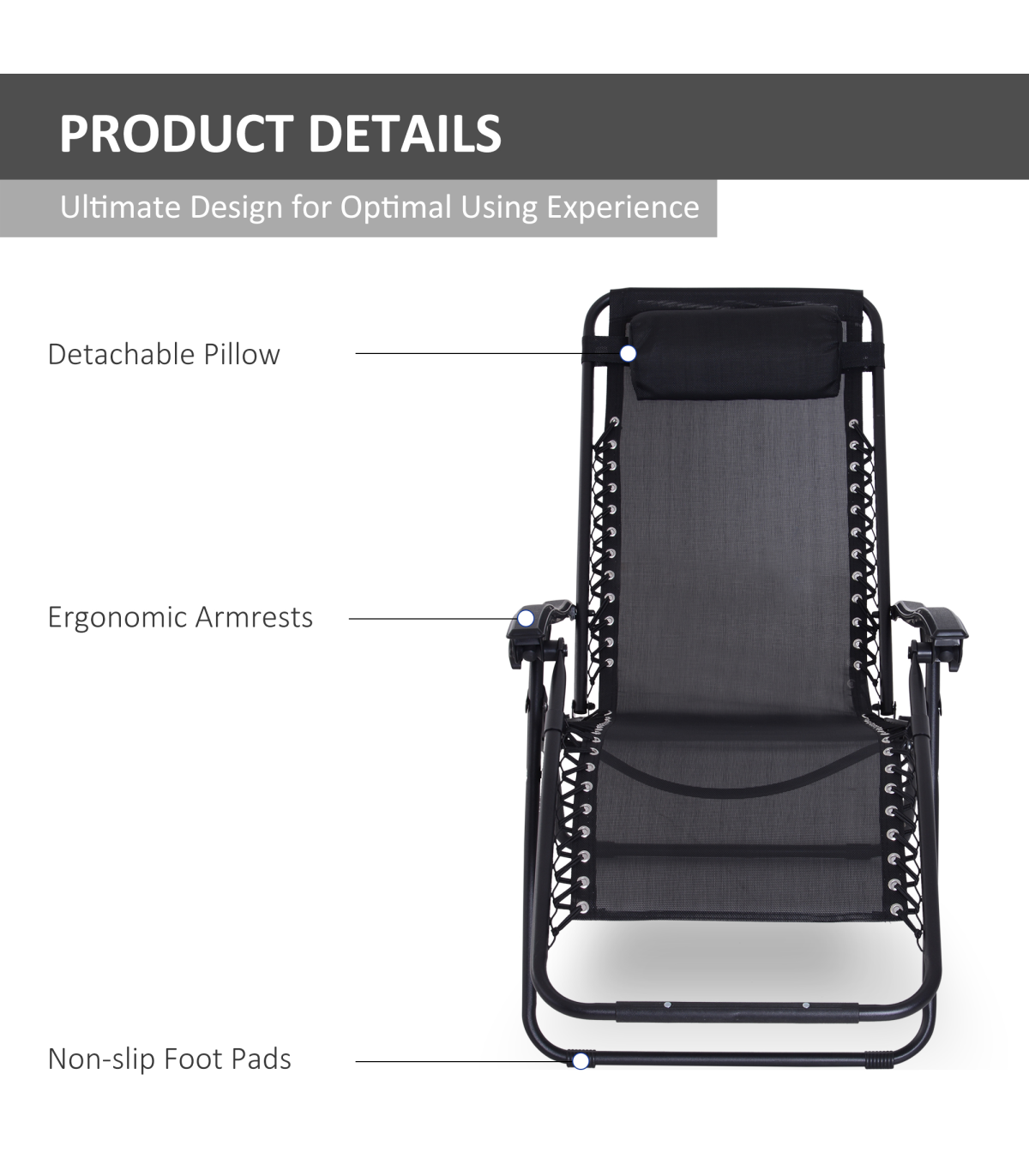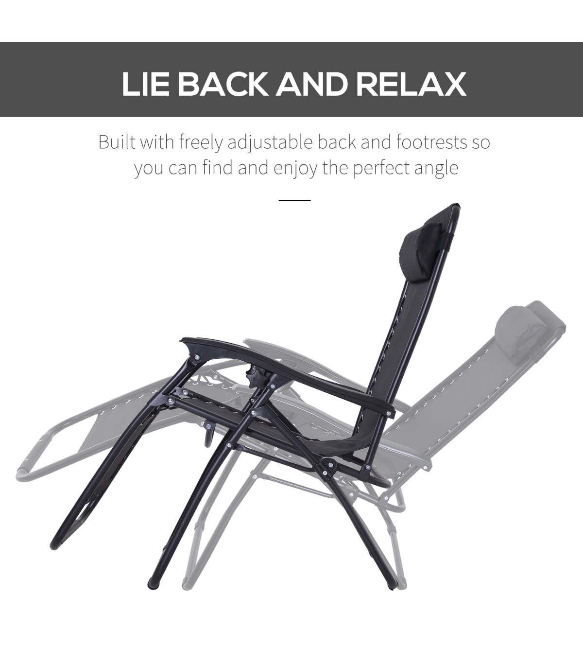 Zero Gravity Chair Adjustable Patio Lounge Chair Reclining Seat" Description: "Take your sun relaxation time to the next level with this zero gravity outdoor chair from Outsunny. Evenly distributing your weight, it helps to relieve all aches and pains whilst providing your body with all the support it may need. Made from sturdy steel in a powder coated finish, the frame has been built to last for years to come as it won't peel or rust. It also can recline and lock into any position, meaning this is a chair that truly suits your needs and it is finished with a texteline cover, padded headrest, and contoured armrest. It’s the perfect gateway to total relaxation in your garden, patio or balcony." Features: - Powder-coated steel frame for strength and durability - Texteline fabric cover allows your body to breathe in the heat - Lockable reclining system to adjust to any position - Padded headrest and contoured armrests for added support and comfort - Foldable design, making it easy to carry and store when not in use - Zero-gravity design for stress-free and weightless relaxation experience every time Specification: - Item Name: Sun Lounger - Brand Name: Outsunny - Material: Steel Frame, Texteline - Net Weight: 7.2kg - Colour: Black - Overall Dimension (upright): 90L x 65W x 110Hcm - Reclining Dimension: 160L x 65W x 79Hcm - Folded Dimension: 65L x 12W x 94Hcm - Seat Size: 52L x 43.5Wcm - Seat Height: 43.5cm - Pillow Size: 35L x 15W x 5T (cm) - Weight Capacity: 150kg - Flat Pack: NO - Assembly Required: NO - Custom Label: 84B-227BK