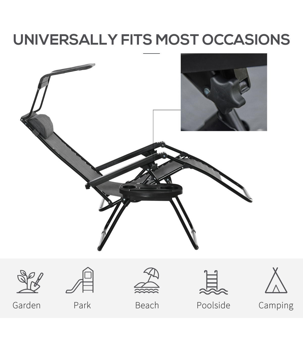 Take your time out in the sun to the next level with this beige zero gravity outdoor chair from Outsunny. Evenly distributing your weight, it helps to relieve all aches and pains whilst providing your body with all the support it may need. Made from sturdy steel in a powder coated finish for extra strength and resistance to rusting and peeling, the frame is fitted with a breathable texteline seat, a padded headrest for comfort and an overhead canopy to protect you from the glare of the sun. With a reclining back to pick an angle which suits you, this chair is finished with a detachable side tray to keep drinks, magazines and books etc. close to you. The gateway to total relaxation in your garden or on your patio or balcony.