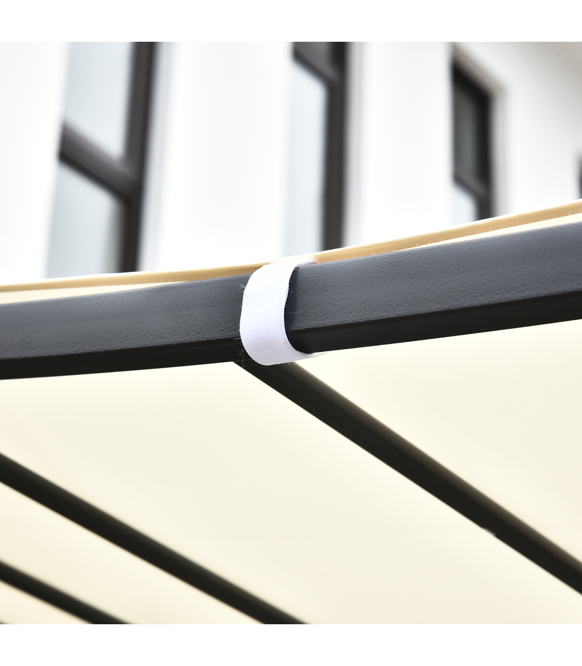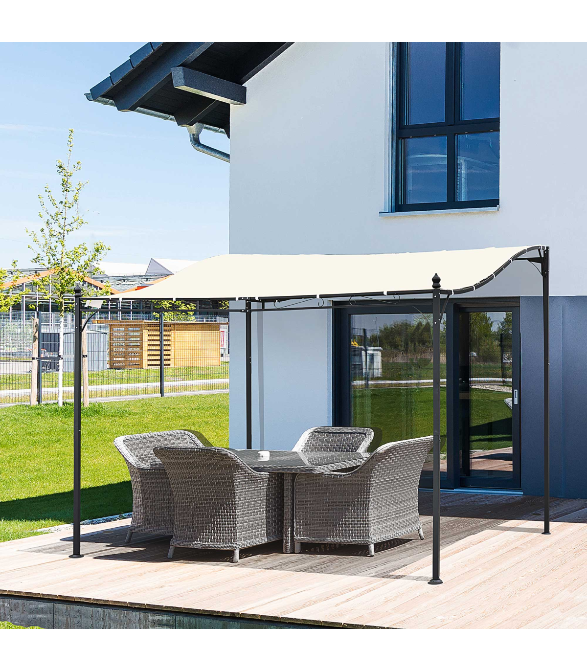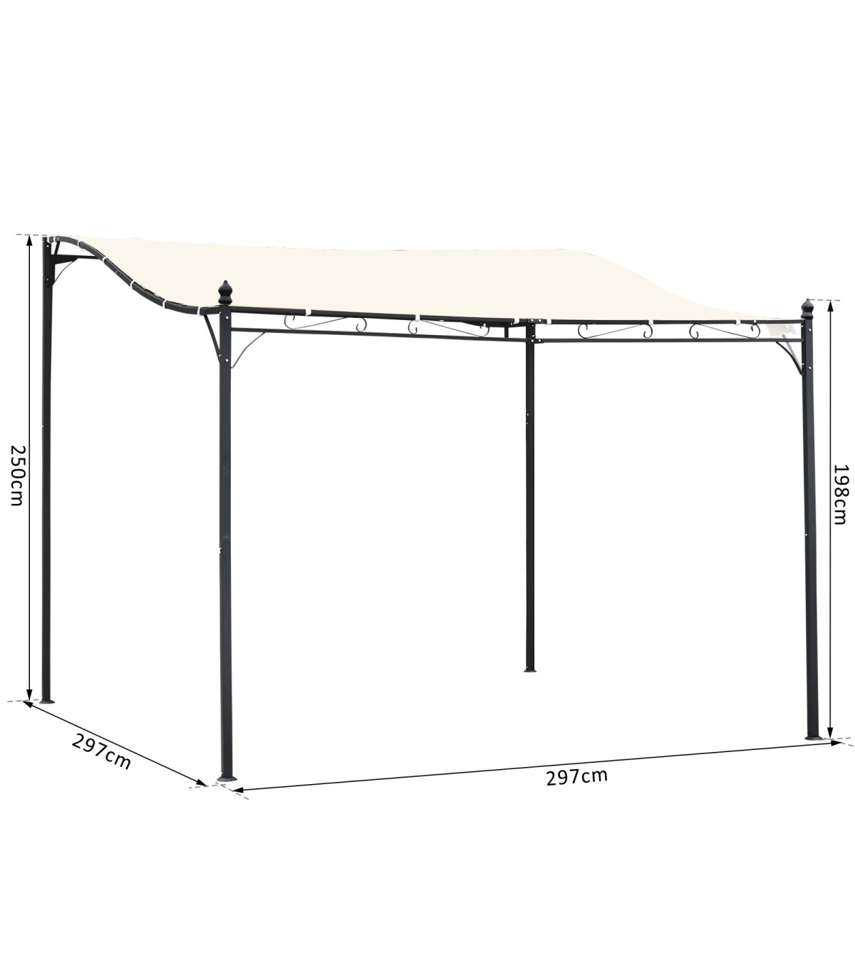 Give yourself a spot to take shade and shelter outdoors with this lean to pergola from Outsunny. It is crafted into a 250 x 297cm design, consisting of a taller back and short front, with a waved connecting frame covered with a top 180gsm polyester canopy, providing shelter against direct sunlight. With an elegant scroll design on the front, the wall mounted canopy is finished with eight drainage holes on the top to prevent water accumulation and with eight ground stakes to pin to the ground.