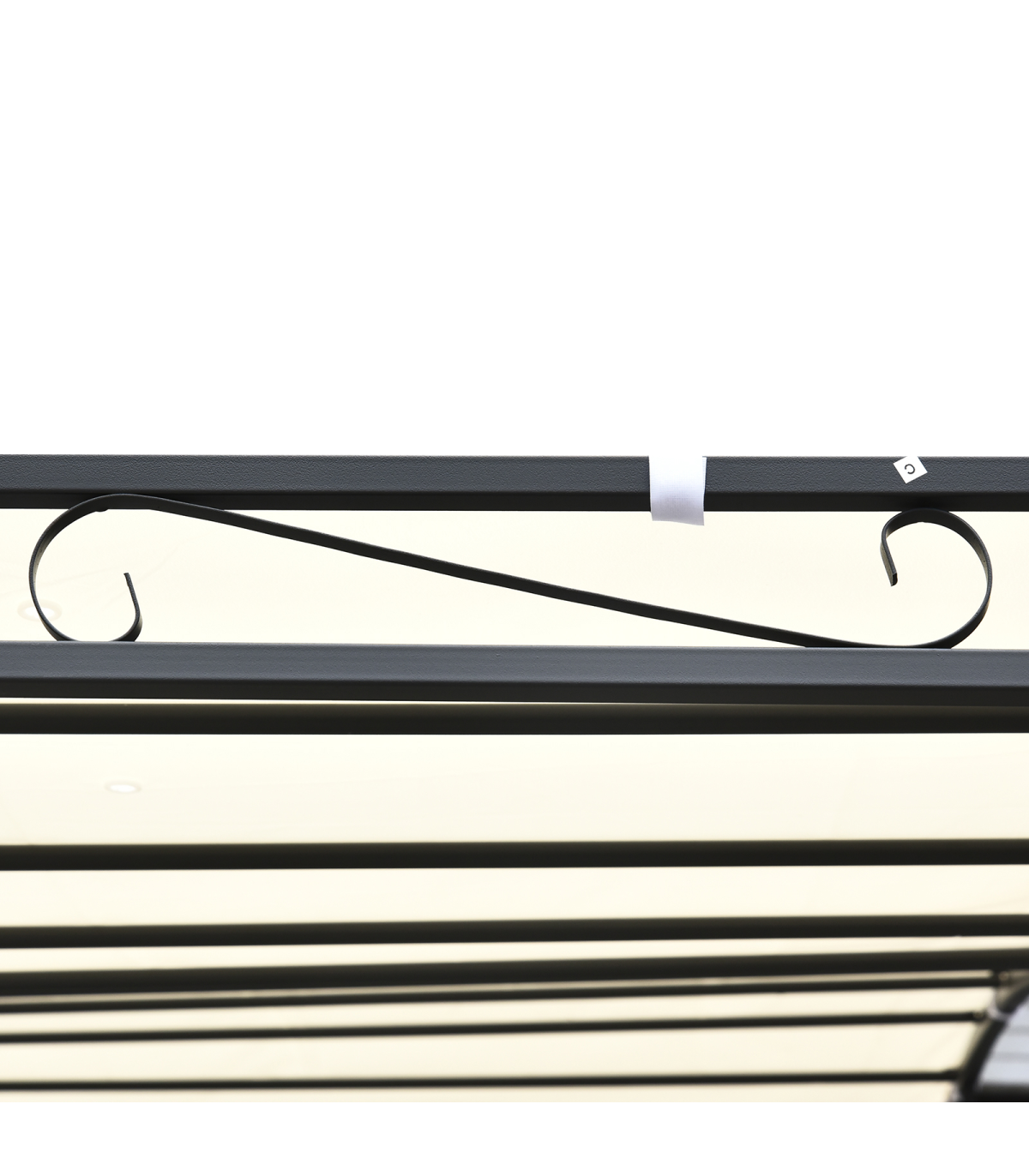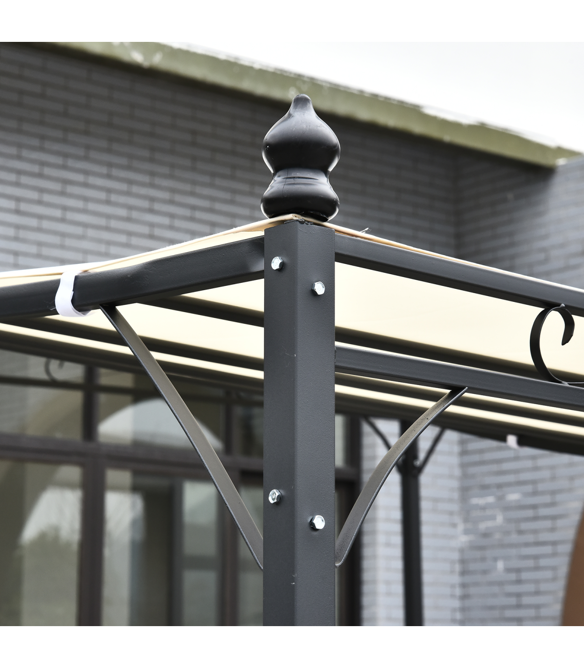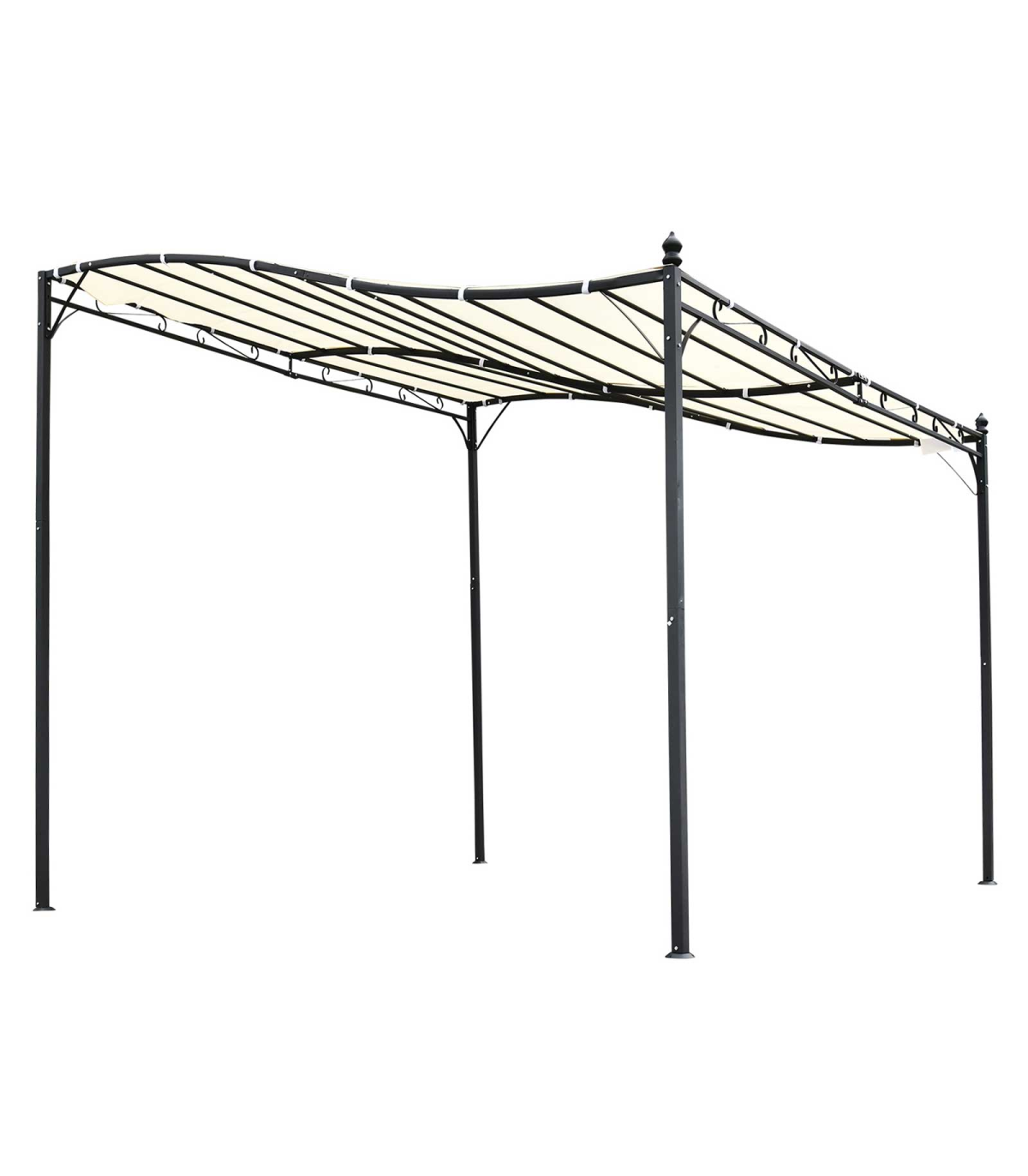 Give yourself a spot to take shade and shelter outdoors with this lean to pergola from Outsunny. It is crafted into a 250 x 297cm design, consisting of a taller back and short front, with a waved connecting frame covered with a top 180gsm polyester canopy, providing shelter against direct sunlight. With an elegant scroll design on the front, the wall mounted canopy is finished with eight drainage holes on the top to prevent water accumulation and with eight ground stakes to pin to the ground.