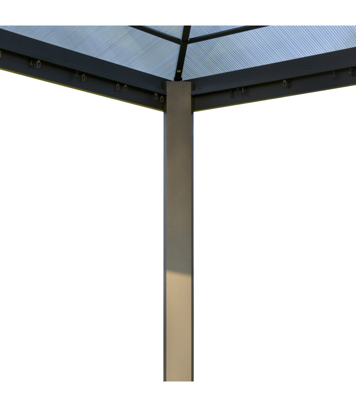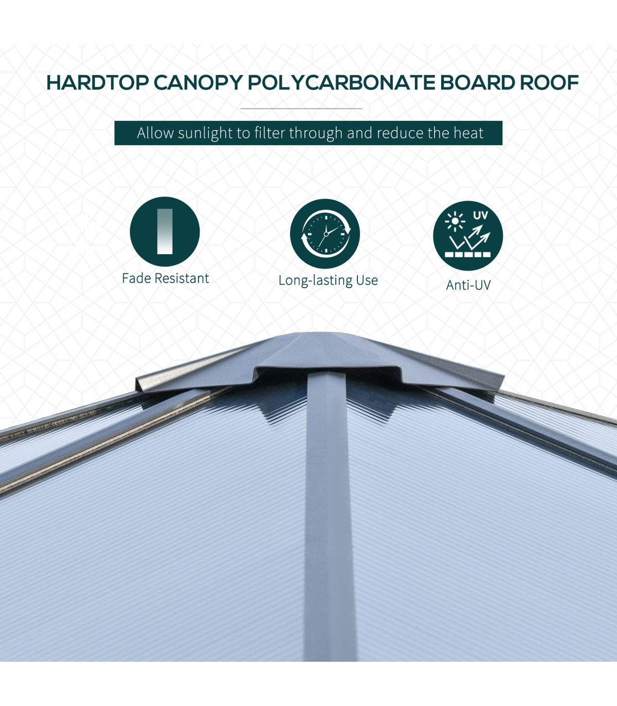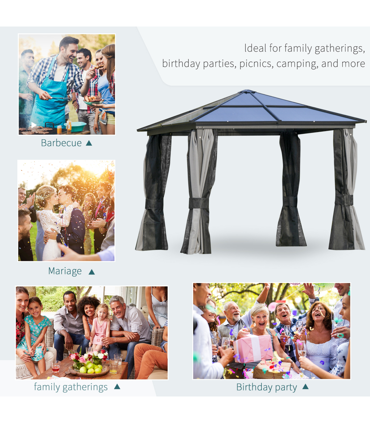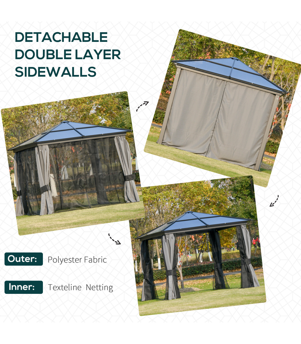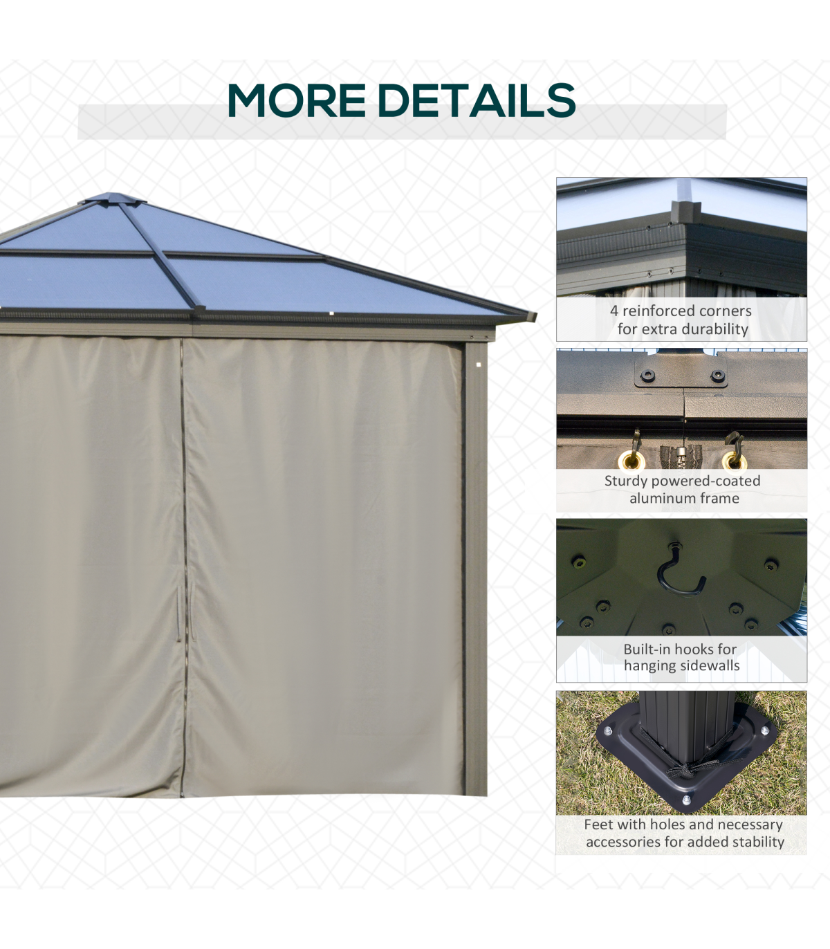 Powder coated aluminium frame for a tough core Inner mesh curtains to protect against bugs Eight ground stakes and 12 expansion screws included for extra stability Curtains for privacy, can be tied back to the structure Sloped hardtop roof prevents water build-up Bold and beautiful design metal gazebo will impress your guests