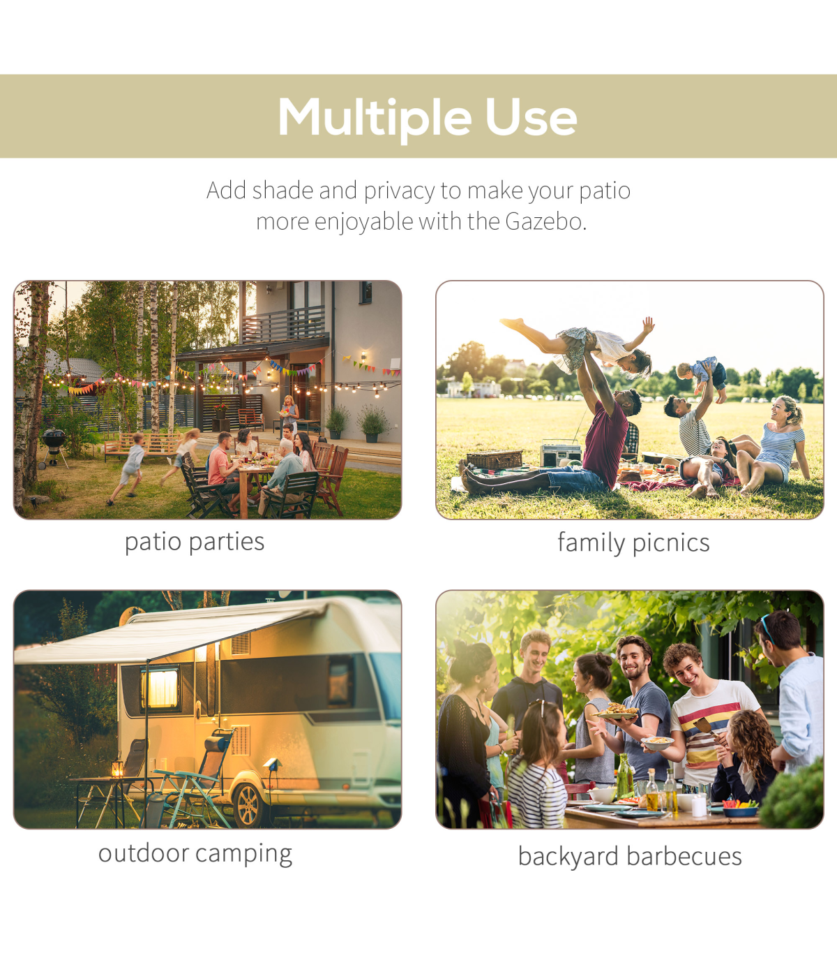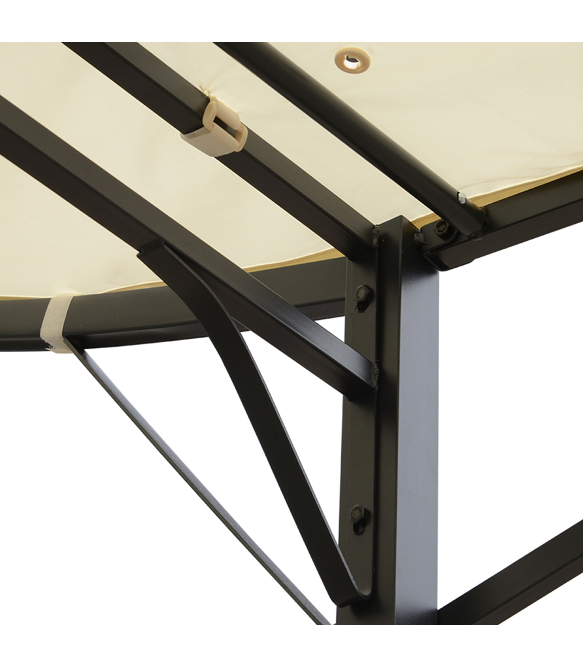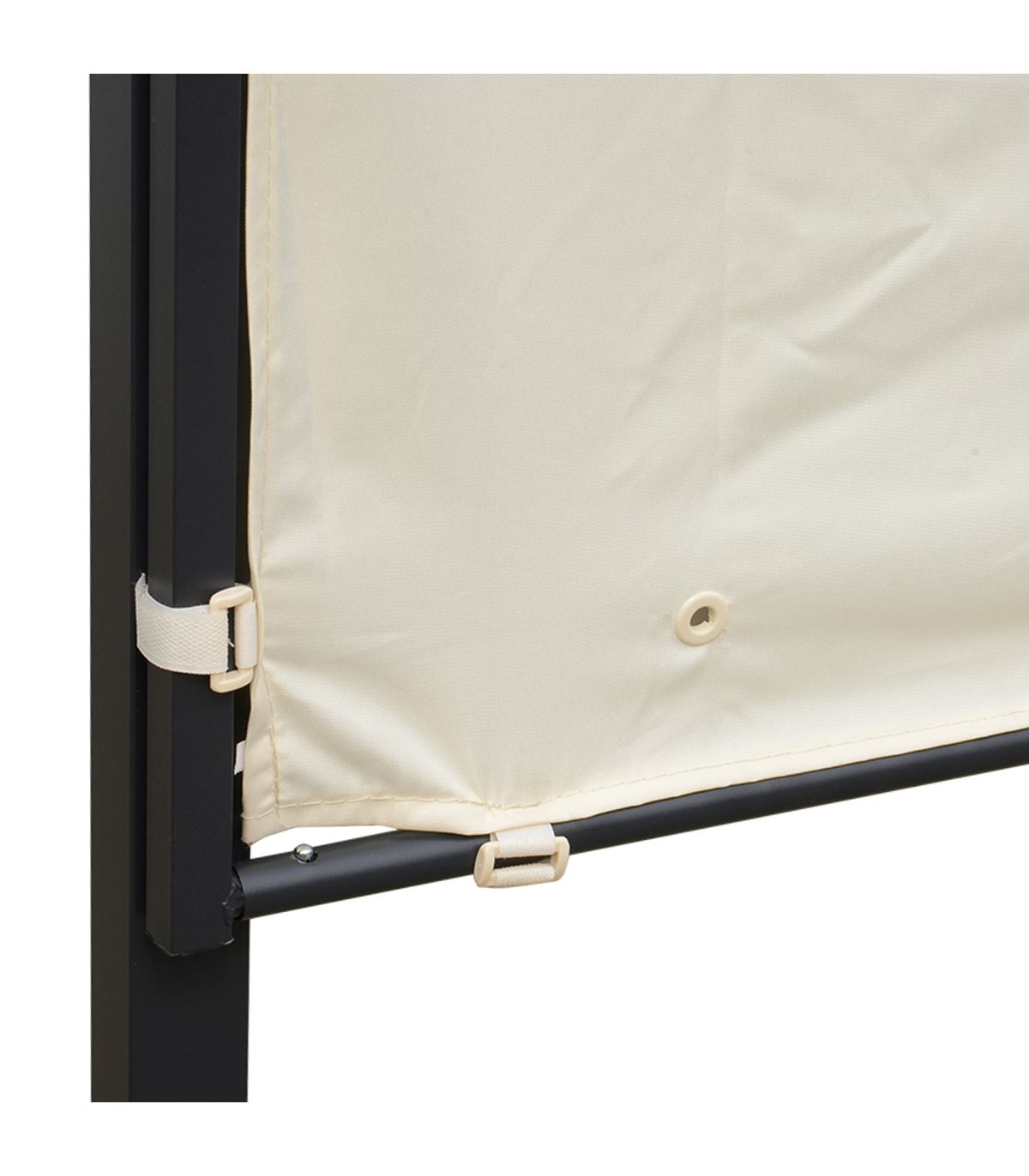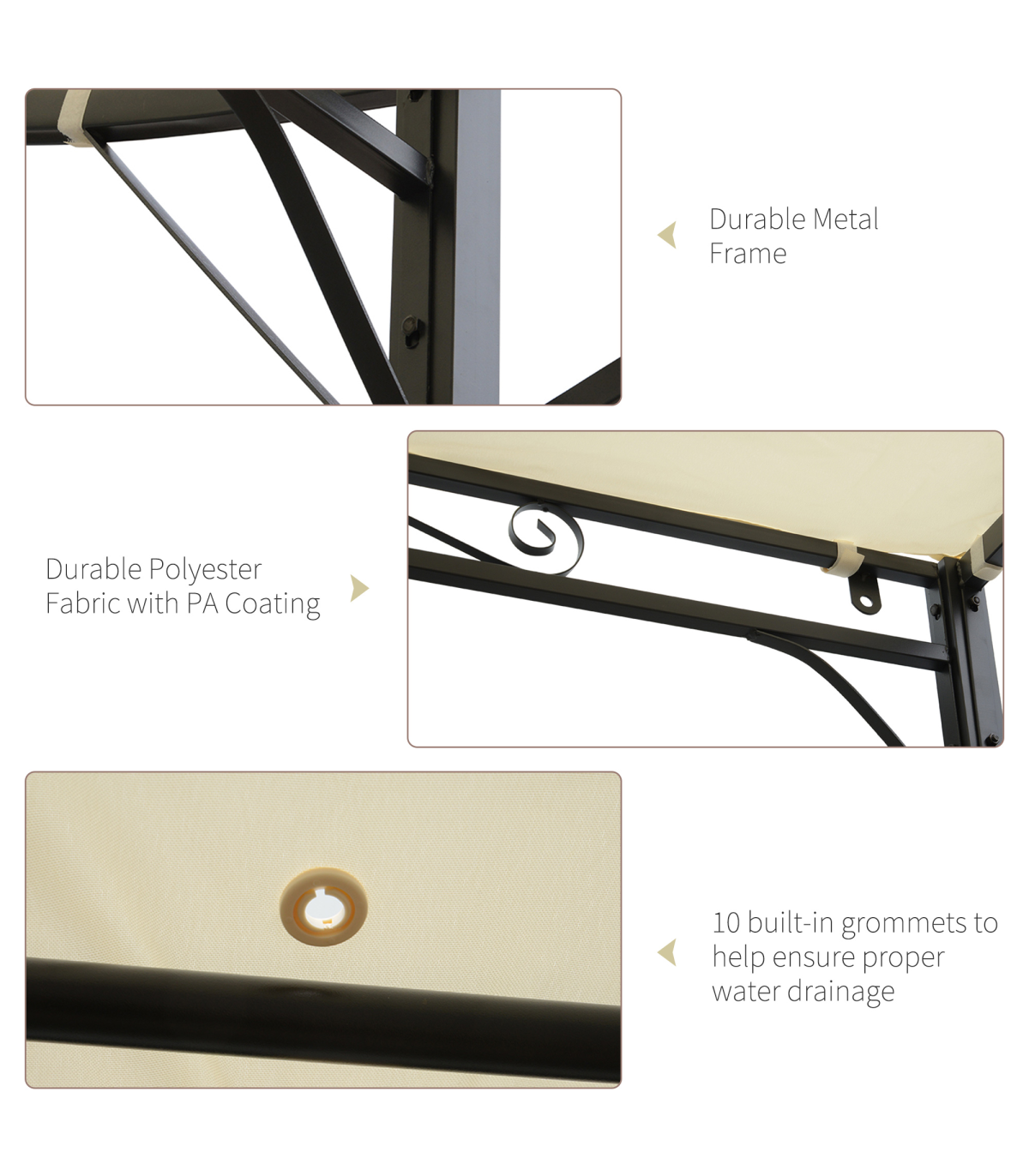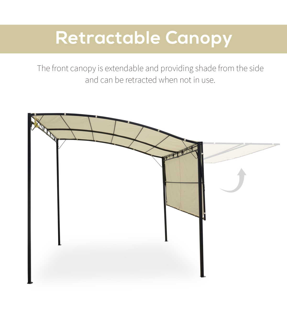 Sturdy powder coated metal frame for long lasting strength Spacious and open design UV and light rain-resistant polyester canopy with extendable front canopy Built-in water grommets to prevent liquid build-up Can be mounted to the wall as an awning Eight ground stakes included for added stability Assembly required