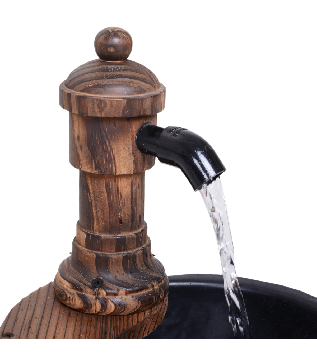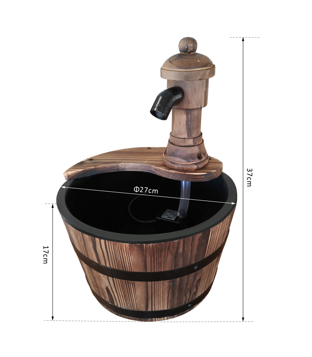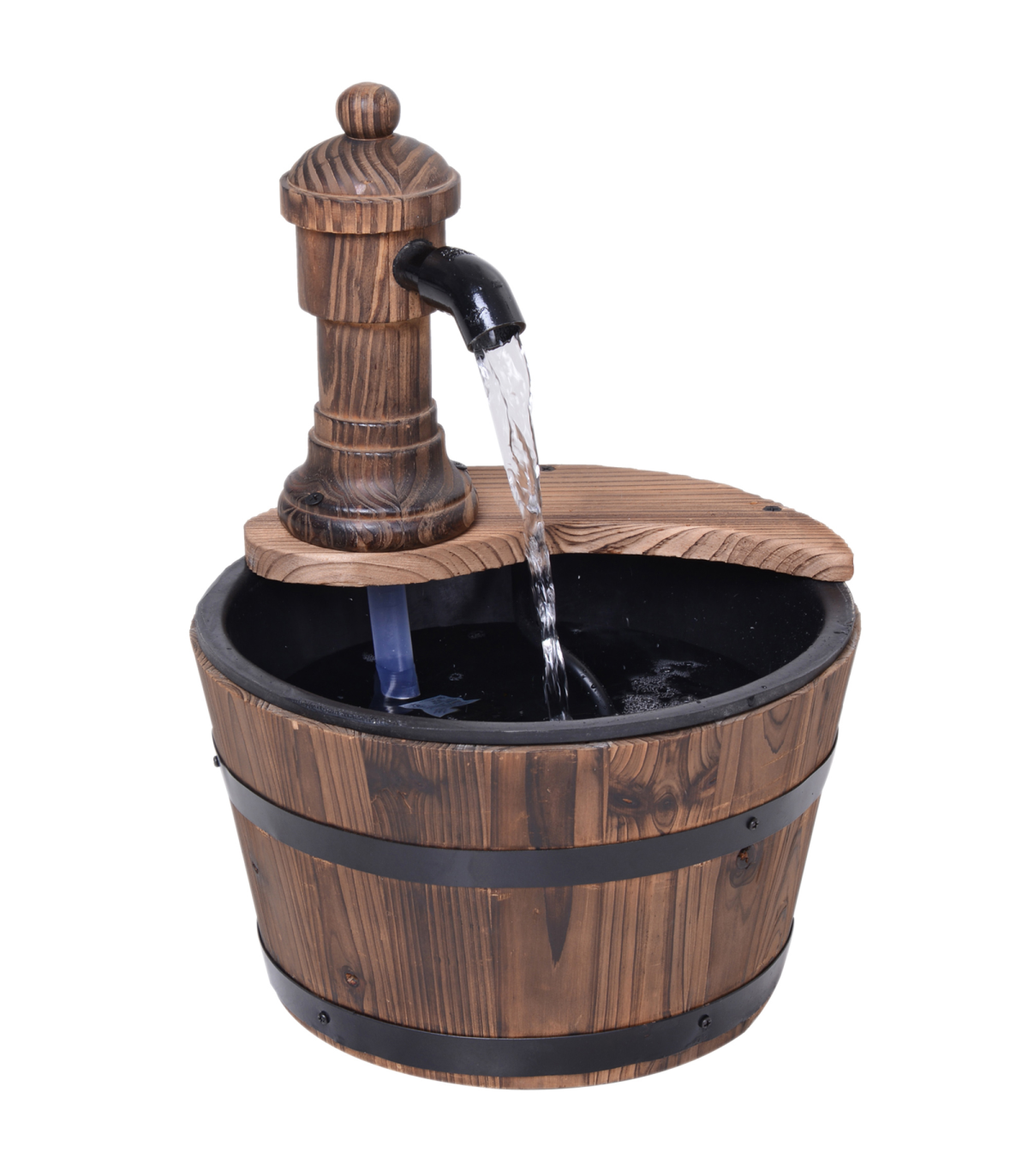 Features: Retro styled wood barrel fountain pump adds a unique touch to your garden and outdoor areas Crafted from solid fir wood construction with top treatment finish to withstand the weather Bottom round barrel with lining collects and releases the water Electric controlled pump simply plug in and go Adjustable knob to control water rate Also doubles as a planter, flower pot or simply as a garden ornament Assembles quickly and easily
