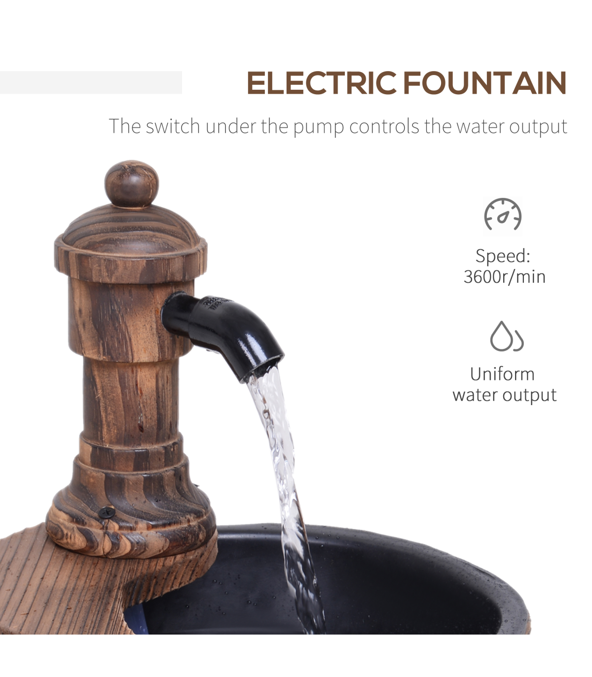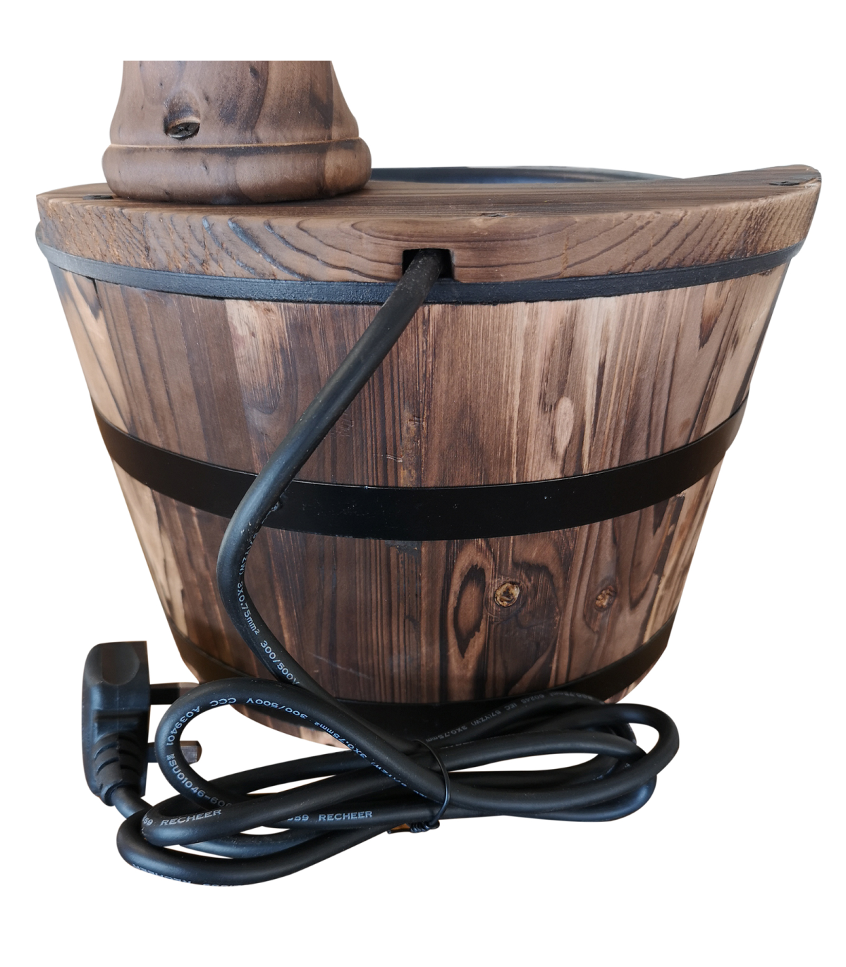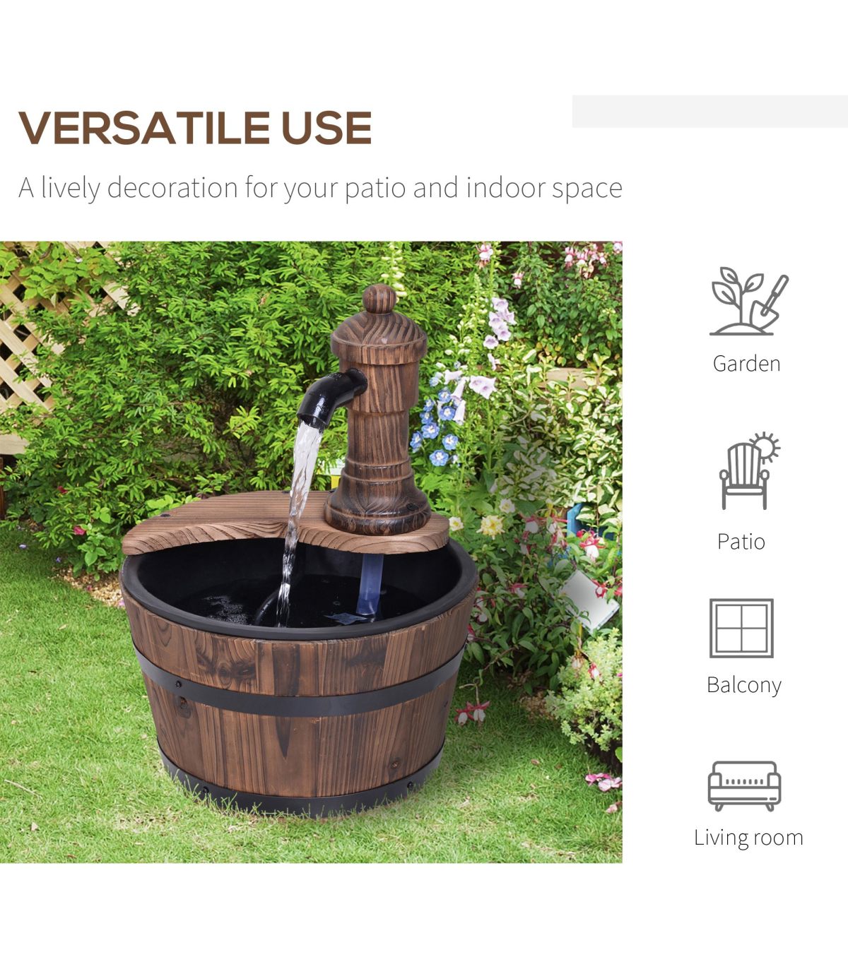 Features: Retro styled wood barrel fountain pump adds a unique touch to your garden and outdoor areas Crafted from solid fir wood construction with top treatment finish to withstand the weather Bottom round barrel with lining collects and releases the water Electric controlled pump simply plug in and go Adjustable knob to control water rate Also doubles as a planter, flower pot or simply as a garden ornament Assembles quickly and easily