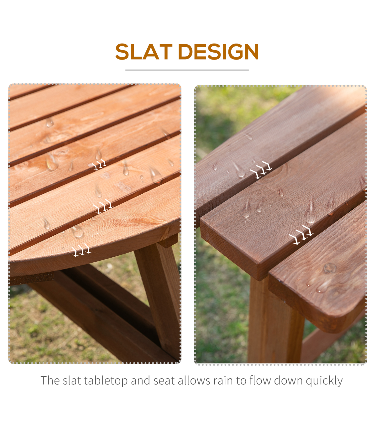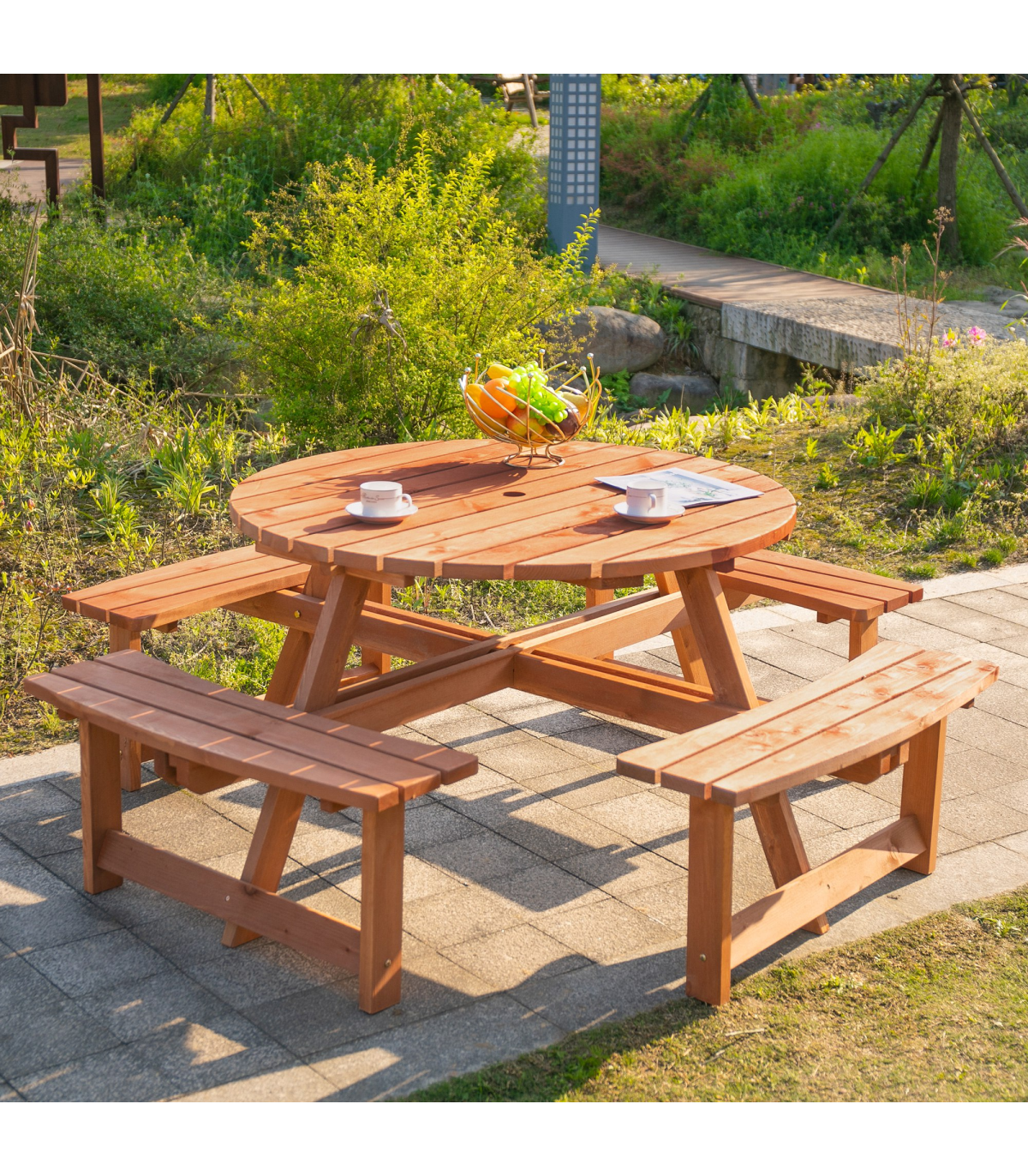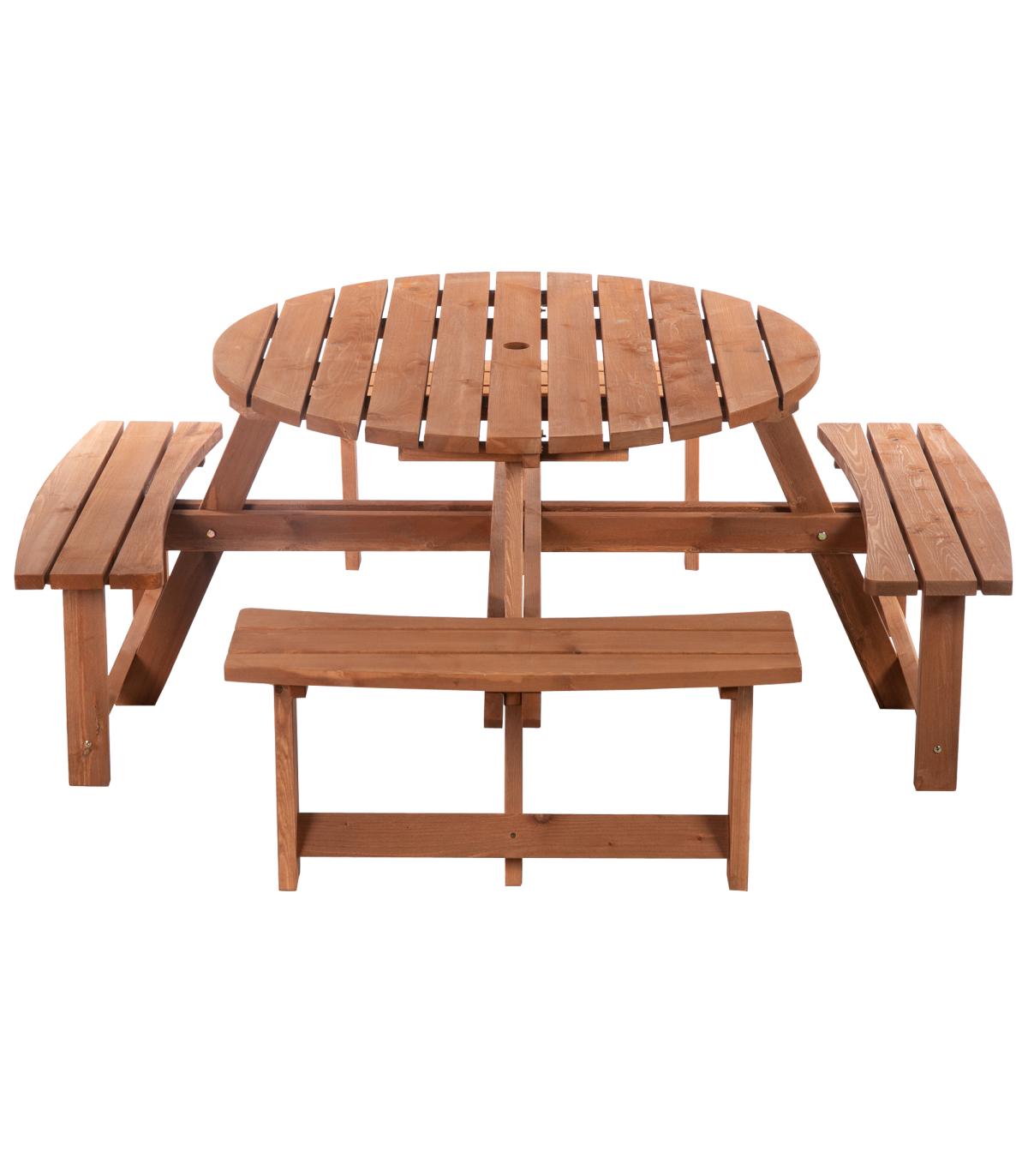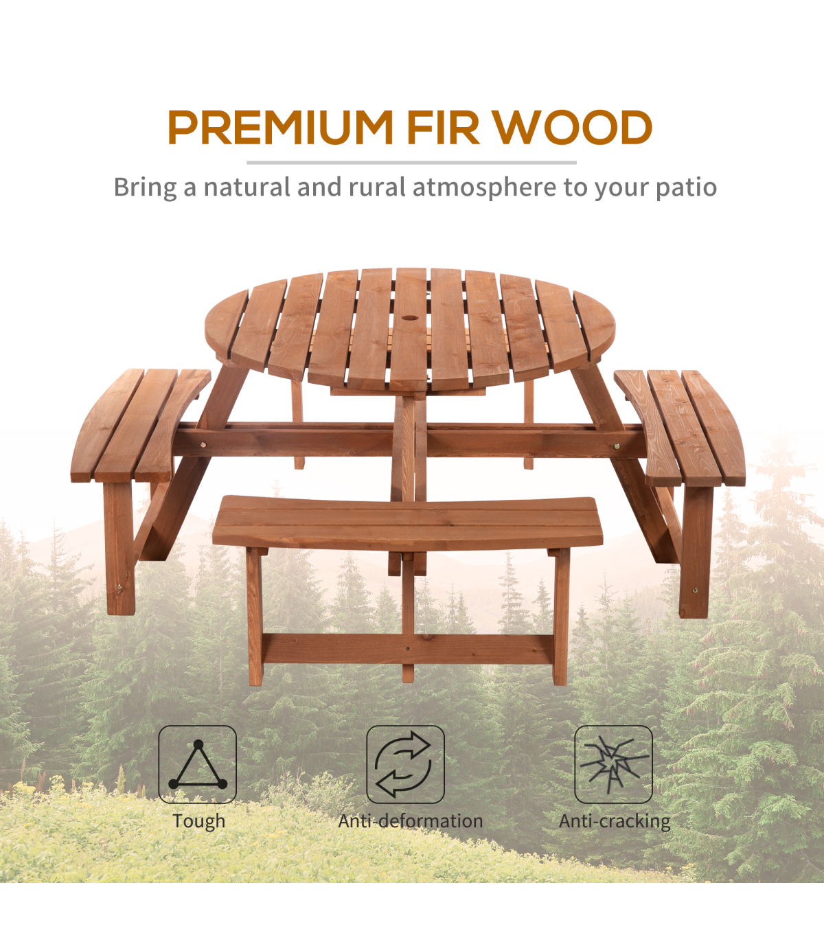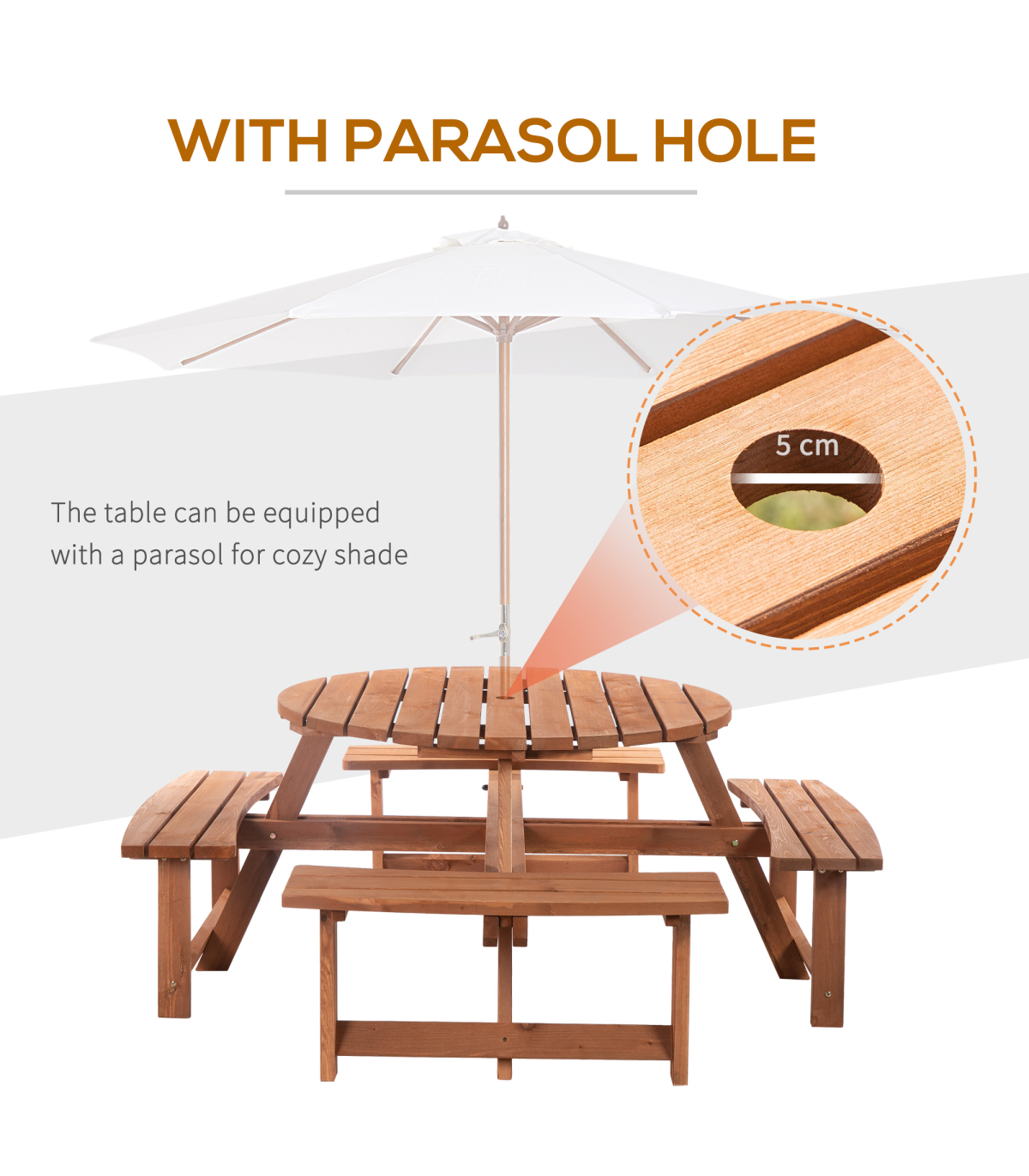 This Outsunny wooden bench set is an ideal addition to any outdoor setting offering the ability to accommodate up to 8 people. Circular design gives ample room for comfortable movement and enjoy the space. A precision cut hole in the middle for parasol enabling the shade options in summer time Fir wood construction for added strength and stability with smooth edges and weight capacity of 227 kg for table and 227 kg for bench.