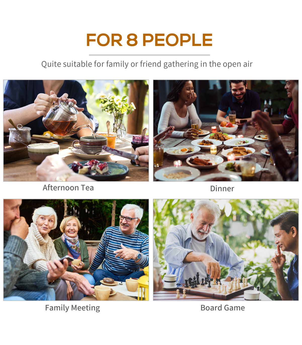 Finished edges ensuring not splinters or sharp edges for added safety and comfort Fir wood construction ensures stability and add years of life to the set Accommodates 8 people with comfort Precision cut hold for parasol attachment in the summer Assembly Required Parasol Not Included