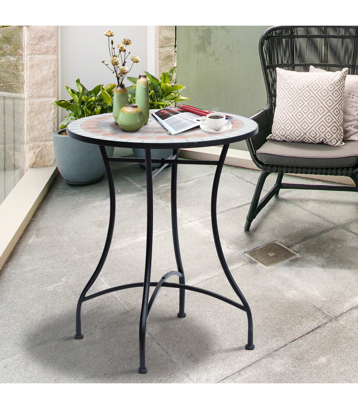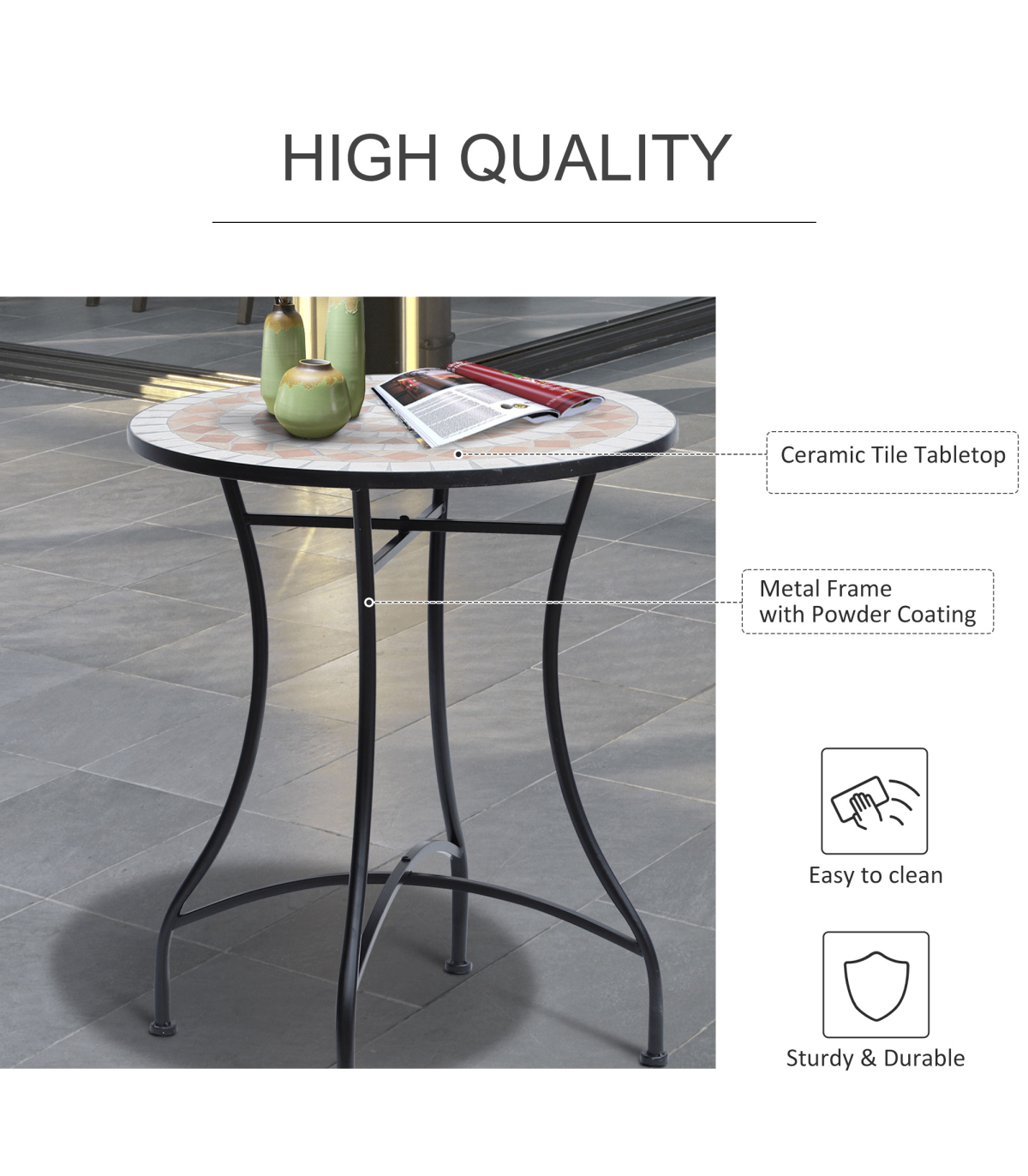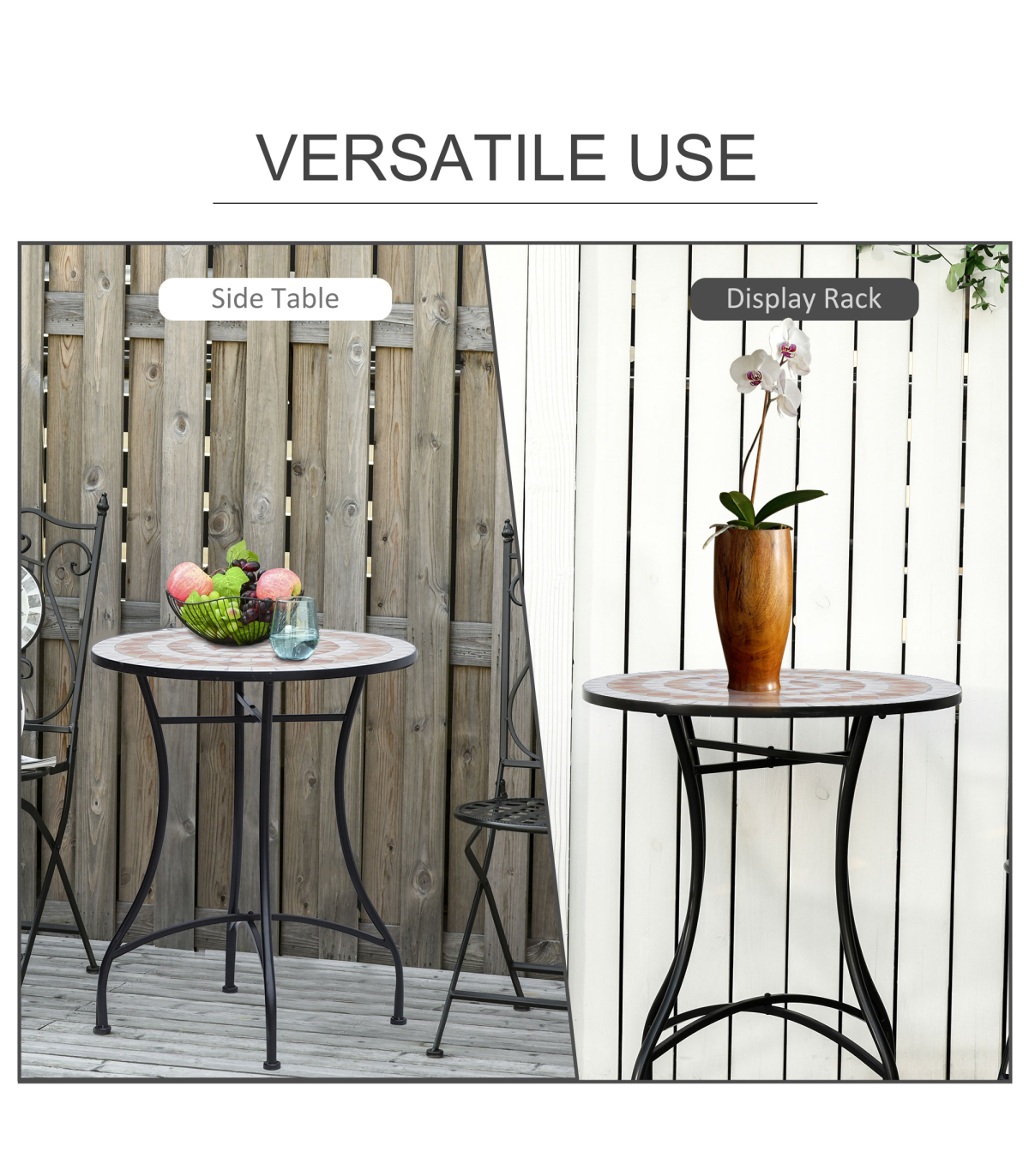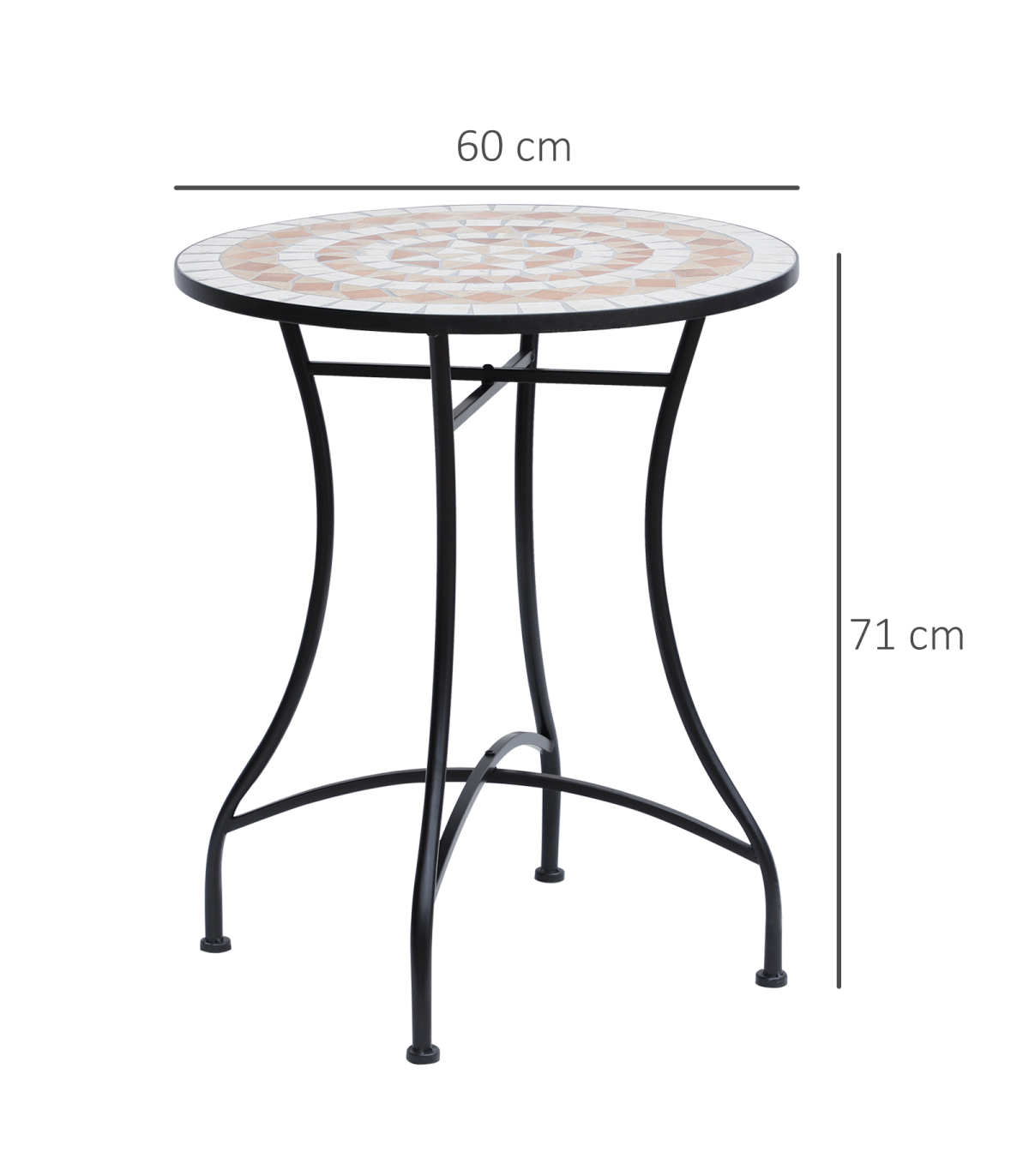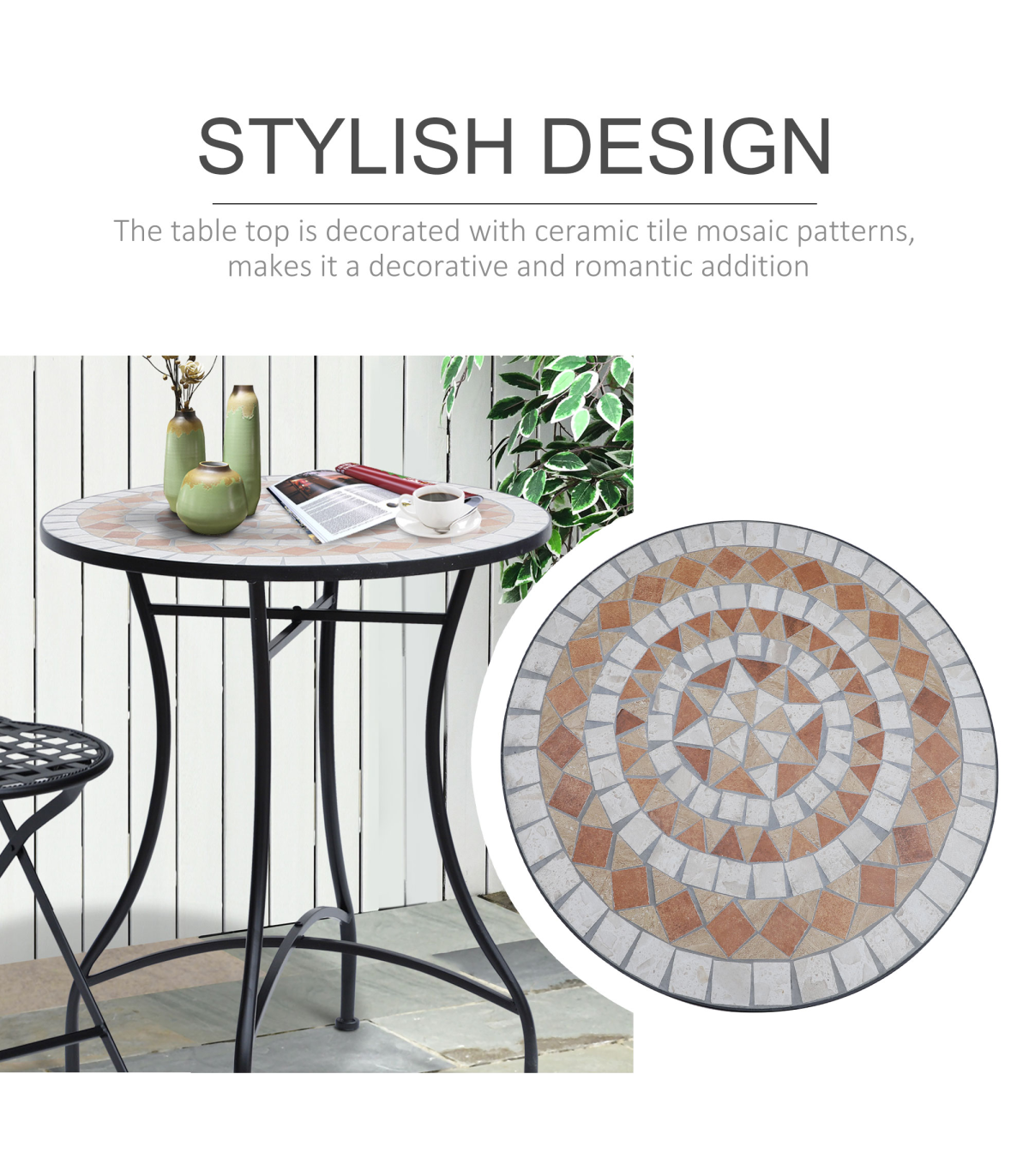- "Outsunny Mosaic Table, 60x71H cm-Black/Orange/White" - Description: - Built to last with sturdy steel frame and ceramic tabletop - Ceramic tabletop for added durability and strength - Tabletop with beautiful mosaic designs adds a touch of style - Lightweight yet sturdy design, easy to move from one place to another - Easy to clean and maintain, wipe clean with damp cloth - Compact and suitable for any outdoor areas - Hassle-free assembly is required
