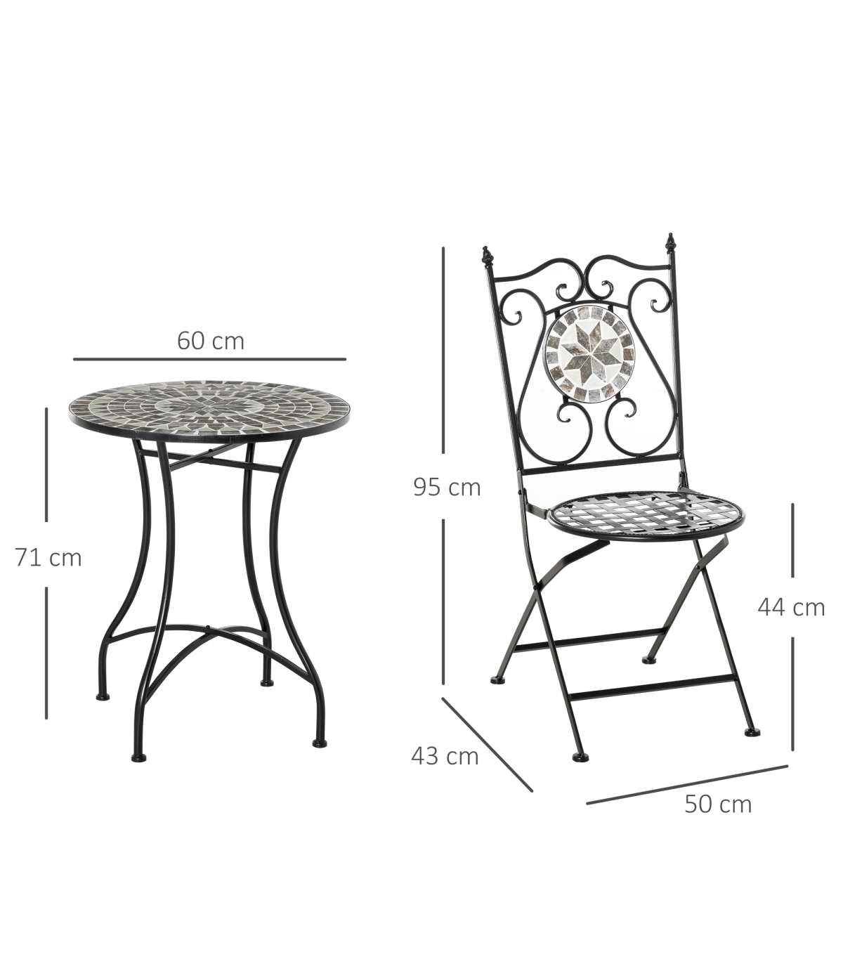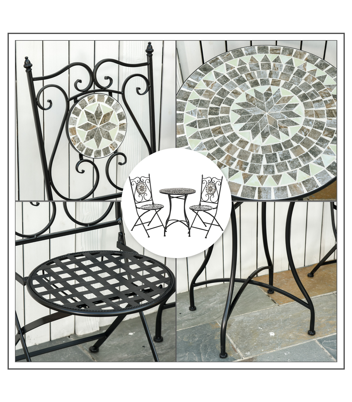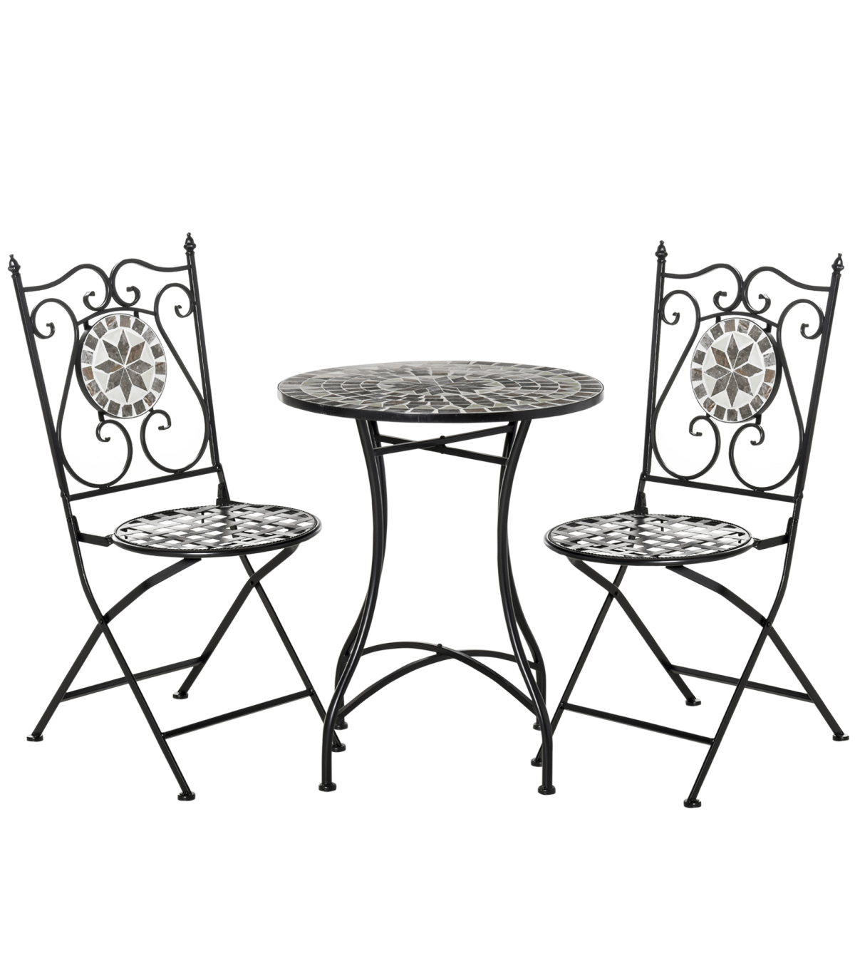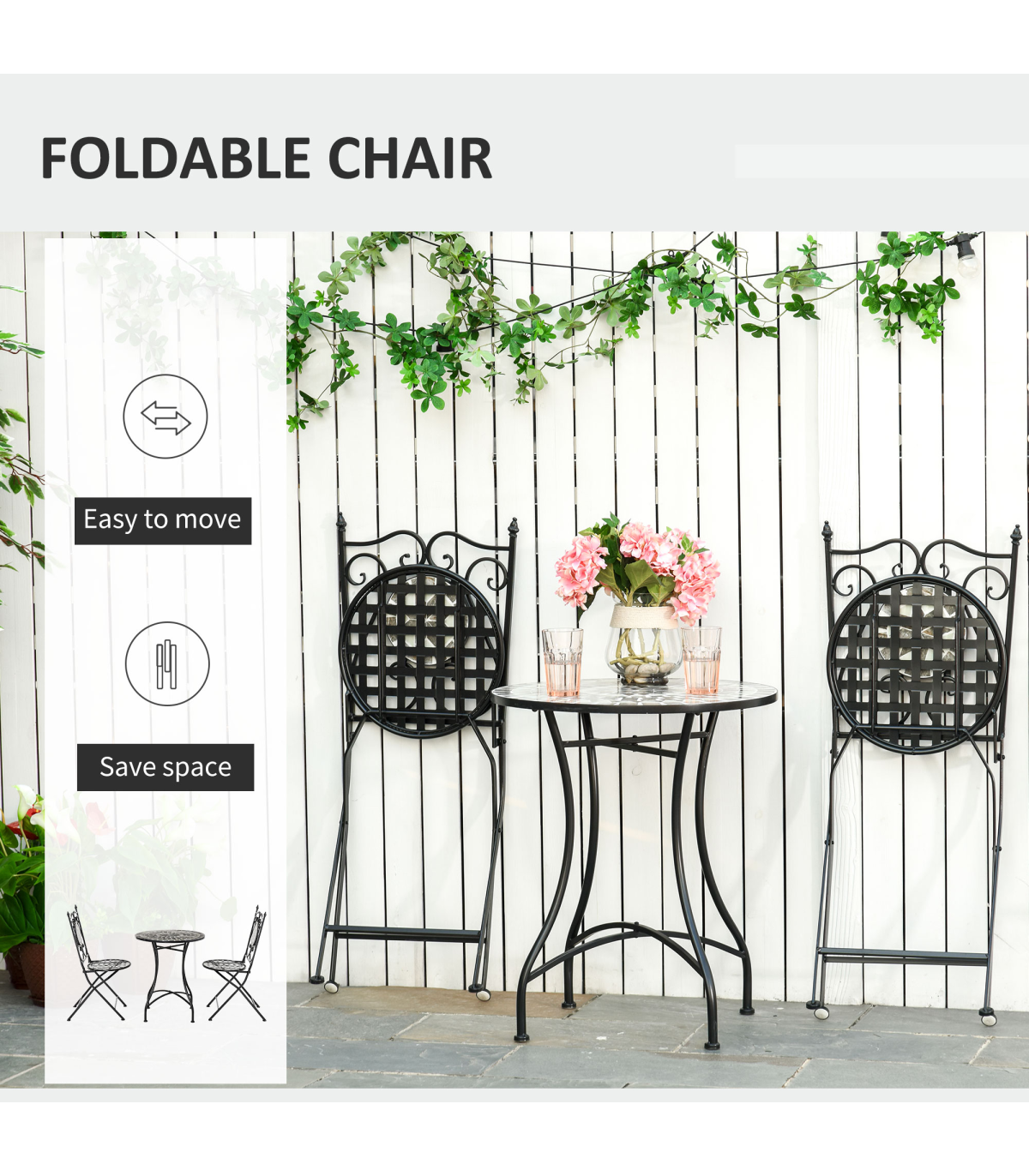 Decorative ceramic table top and chair panels are wear-resistant and easy to clean Small and compact size suitable for all outdoor areas Grid cut-out chairs prevent water building up on the seats Elegant scrolling on the chair backs Chairs can be folding for carrying and storage Table requires assembly