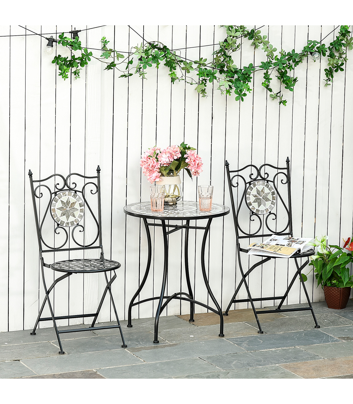 3Pc Mosaic Tile Garden Bistro Set Folding Chairs