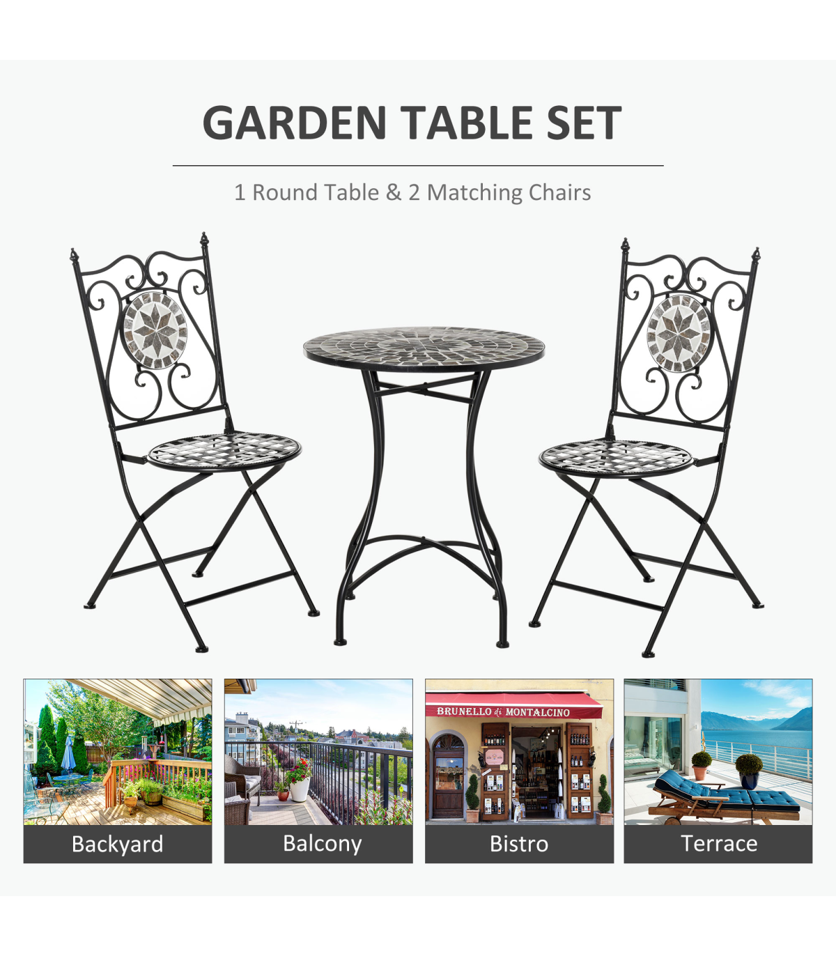 Bring beauty to your everyday with garden bistro set for 2 from Outsunny. It's formed of a round table with ceramic mosaic tile top and two chairs - both with a mosaic back panel - giving room to relax outdoors with someone else. Made from metal, create a solid and sturdy core structure, with the scrolling on the balcony furniture adding extra elegance to the design. Cut-out grid design on seats prevent water build up. And the garden bistro sets are finished with small round feet on all pieces.