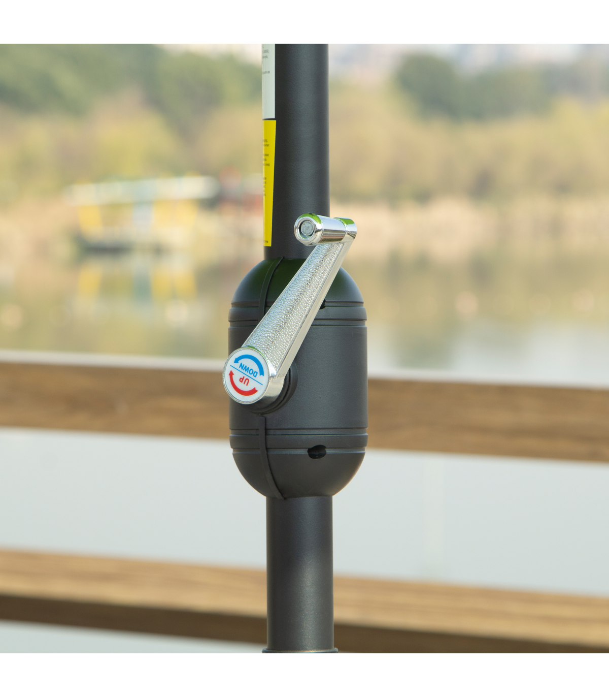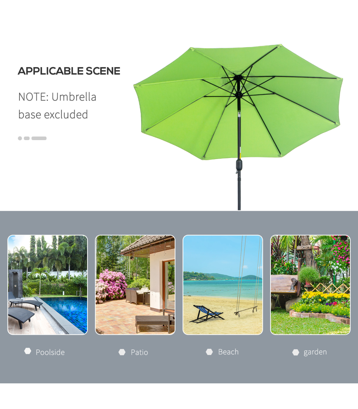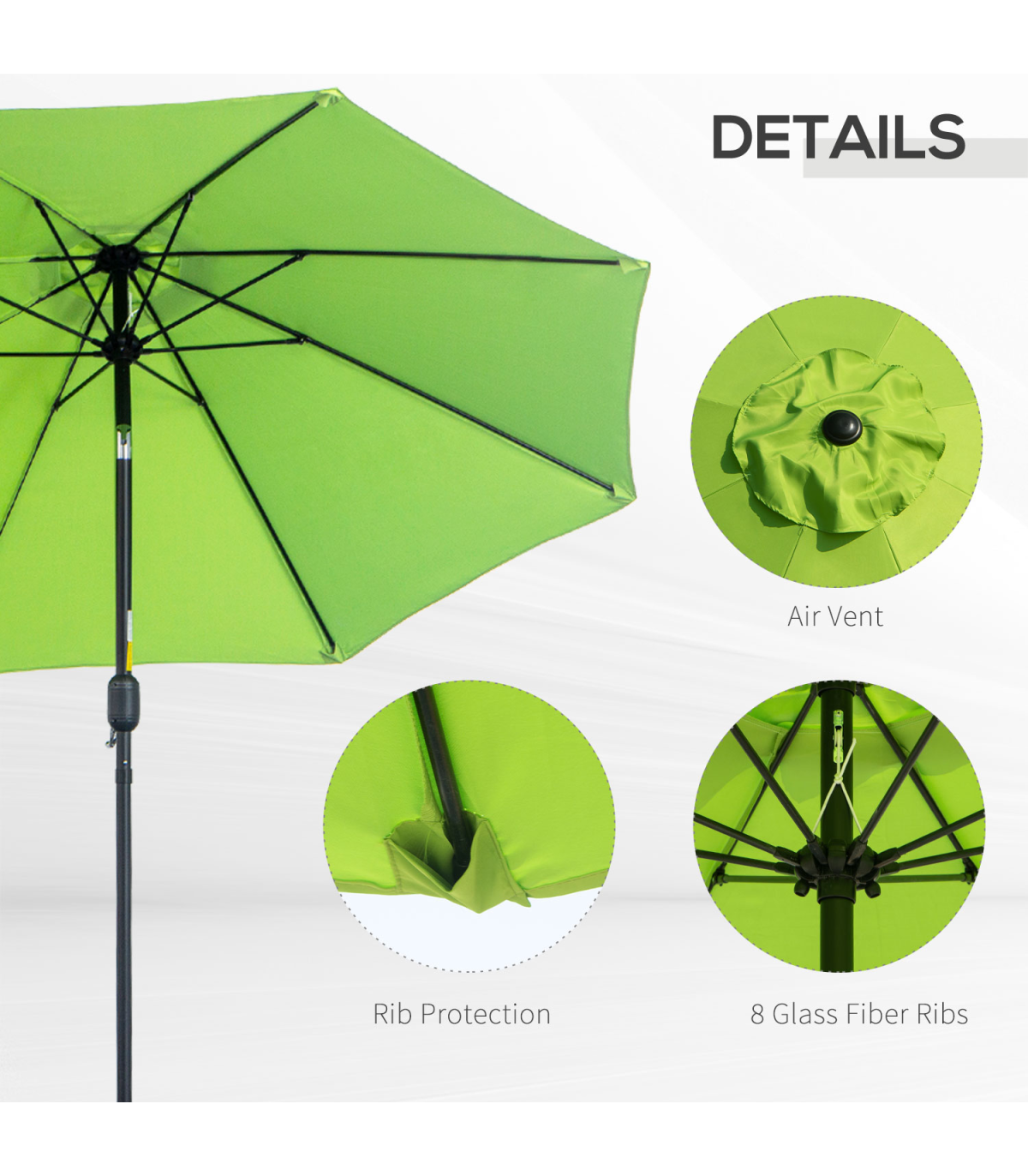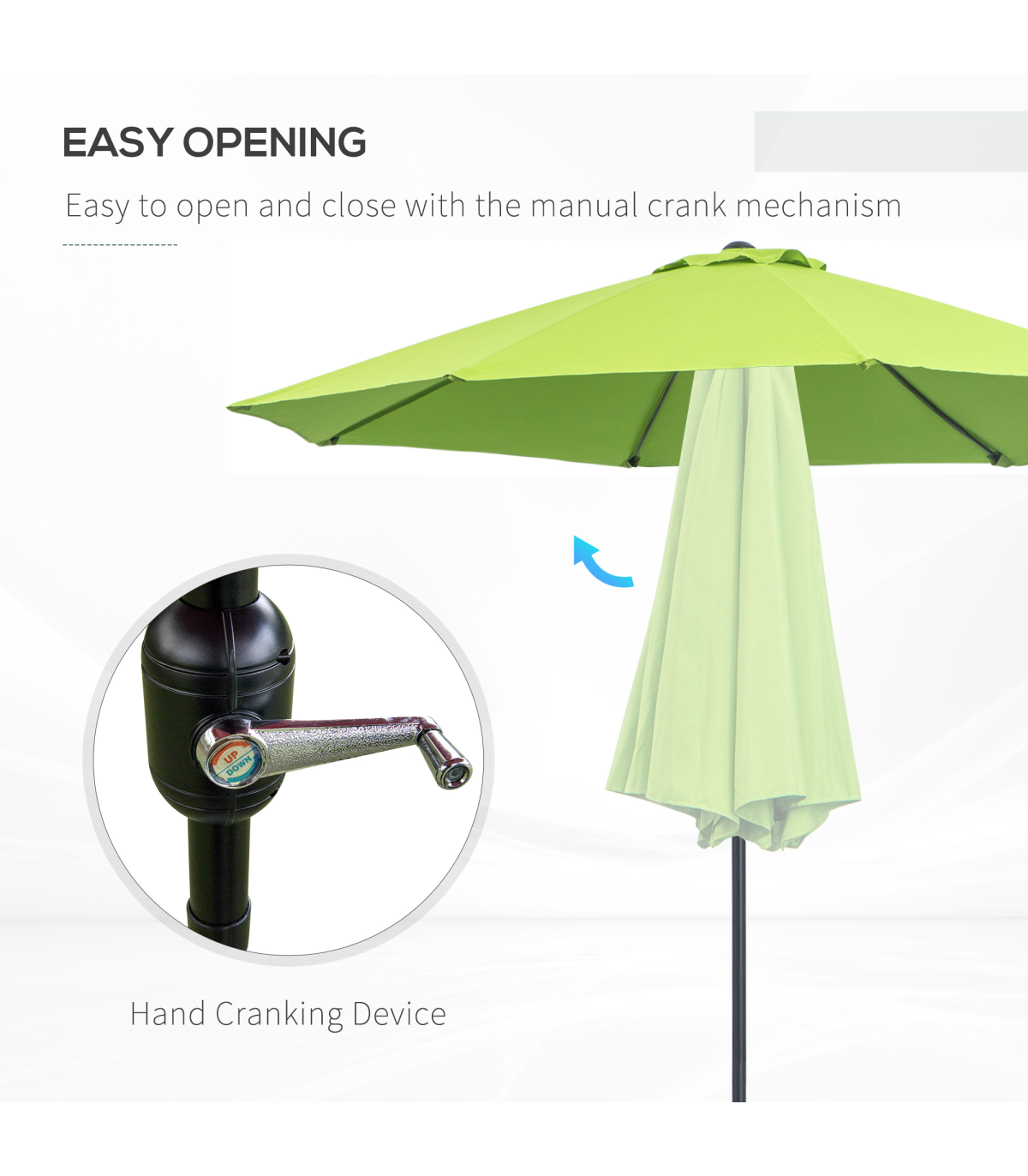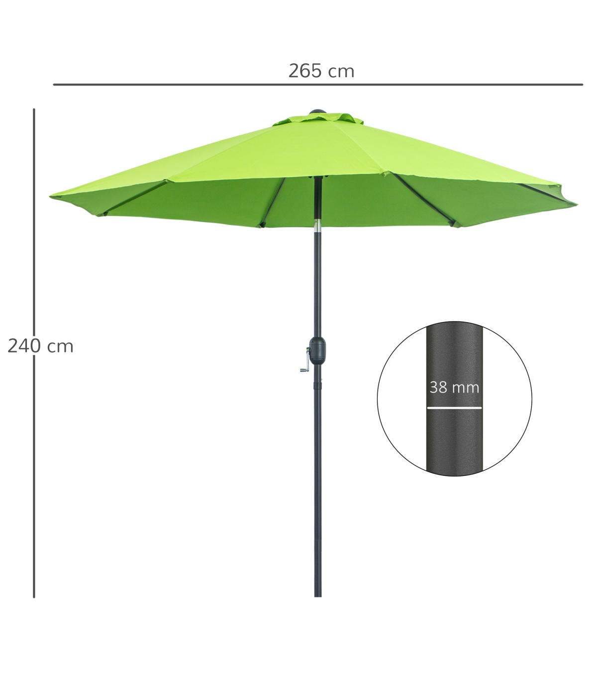 2.65m diameter canopy suitable for up to six people Powder coated aluminium pole is strong, with 8 ribs supporting the canopy connection Crank handle - easy to open and close the canopy Three different canopy angles - easy to fix Fade and weather resistant canopy protects against sun and light weathering. Do not leave in Base is not included. Assembly Required