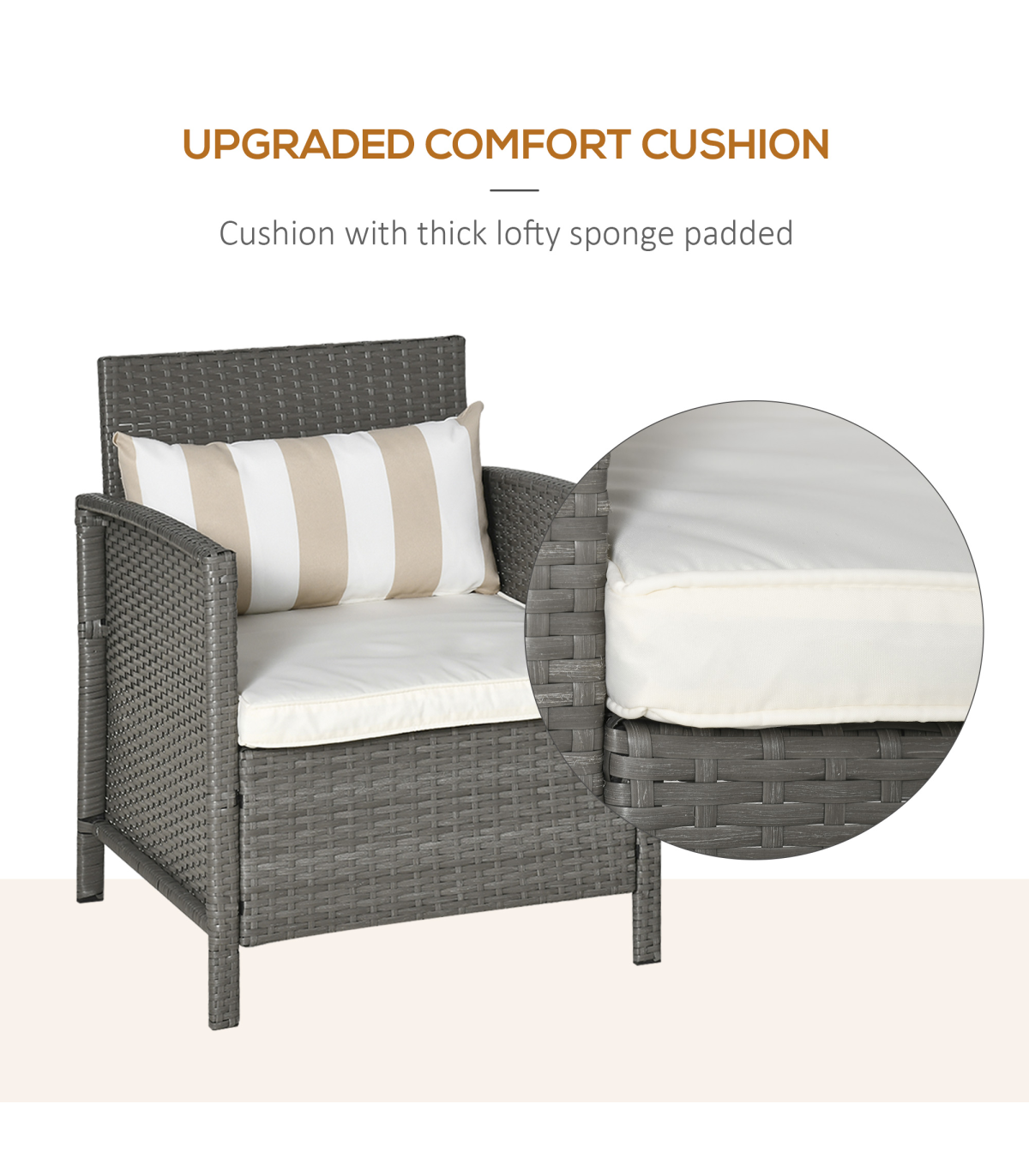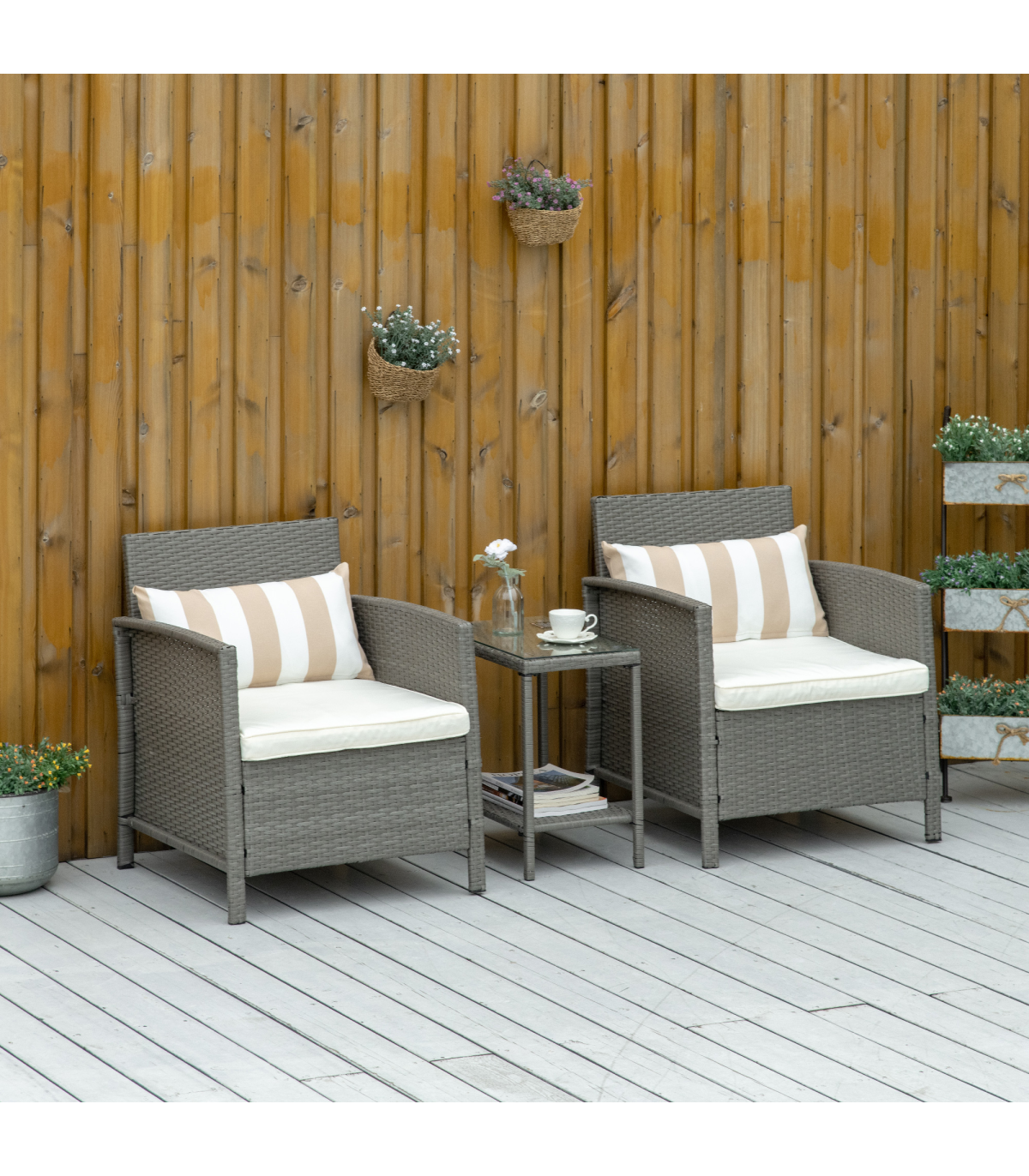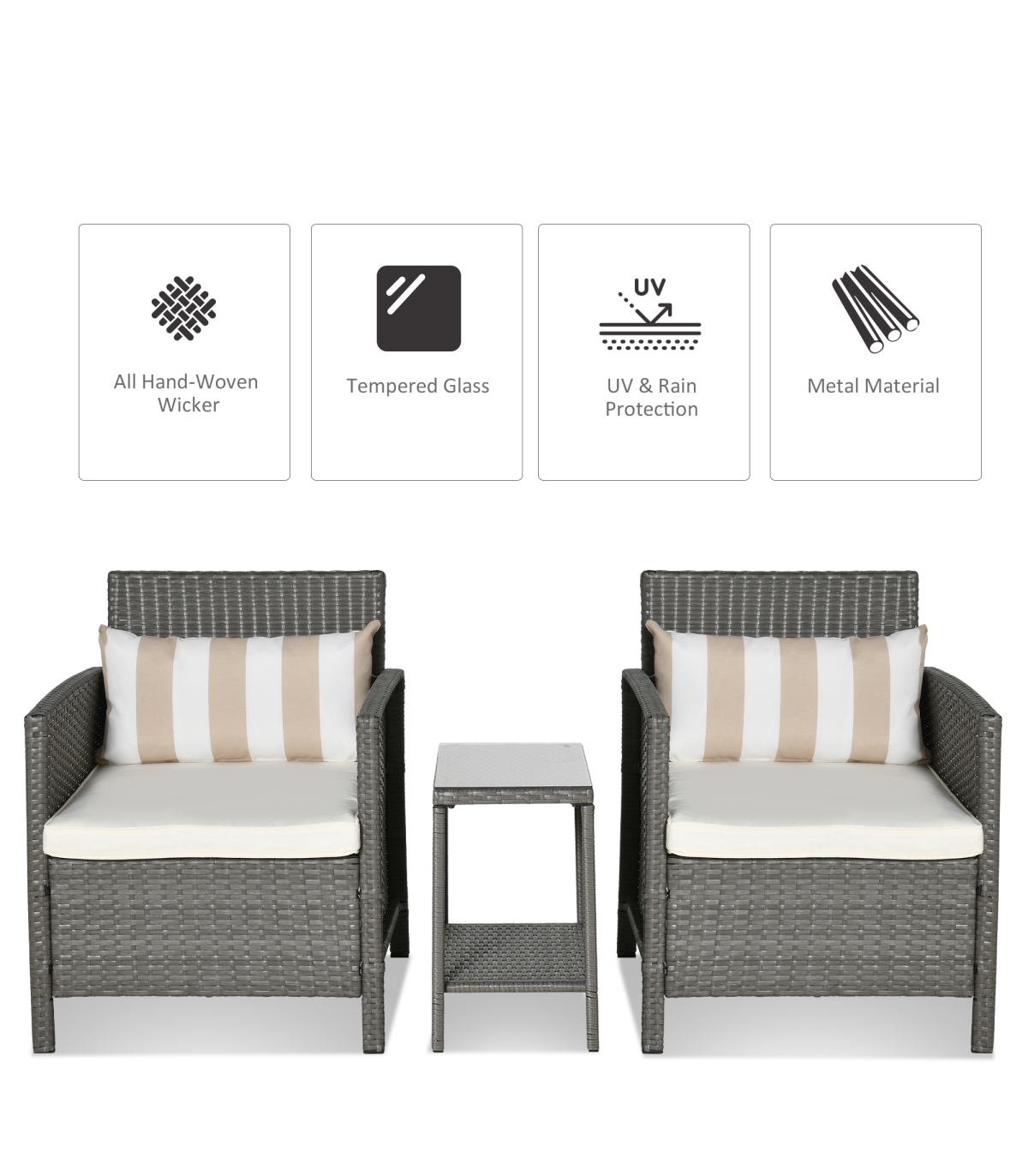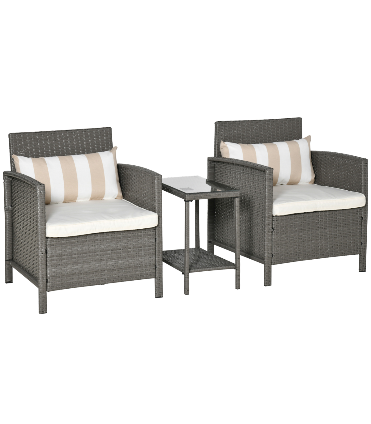 - Rattan 2 Seater Patio Bistro Set with Cushion Pillow - Grey, Cream White Description: - Three-piece set consisting of three armchairs and a coffee table - Sturdy metal frame wrapped in PE wicker for durability against mild weather damage - Easy-to-clean smooth surface - Comfortable thick padded seat with removable and washable covers for easy maintenance - Stylish bolster cushion with stripes for added comfort and support - Two-tier table with sleek glass tabletop, providing ample space - Maximum load capacity: chair - 160kg, table - 30kg - Assembly required