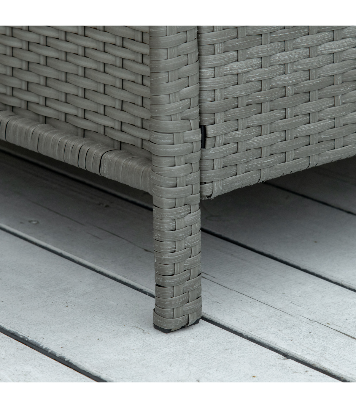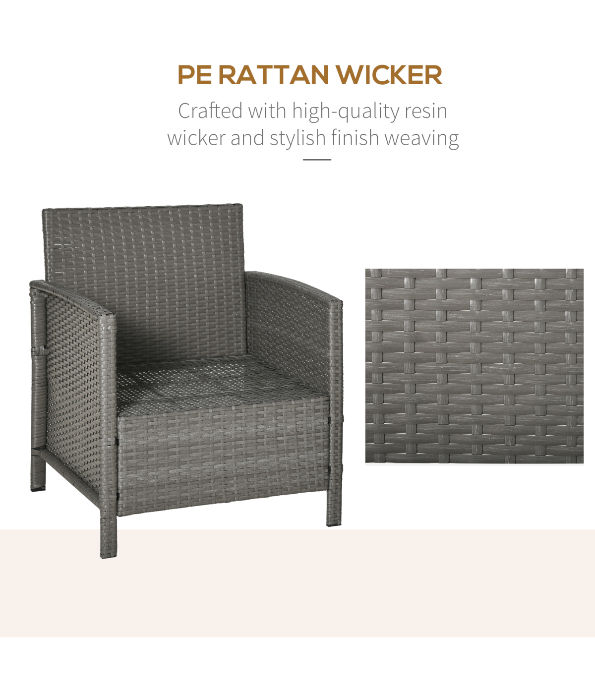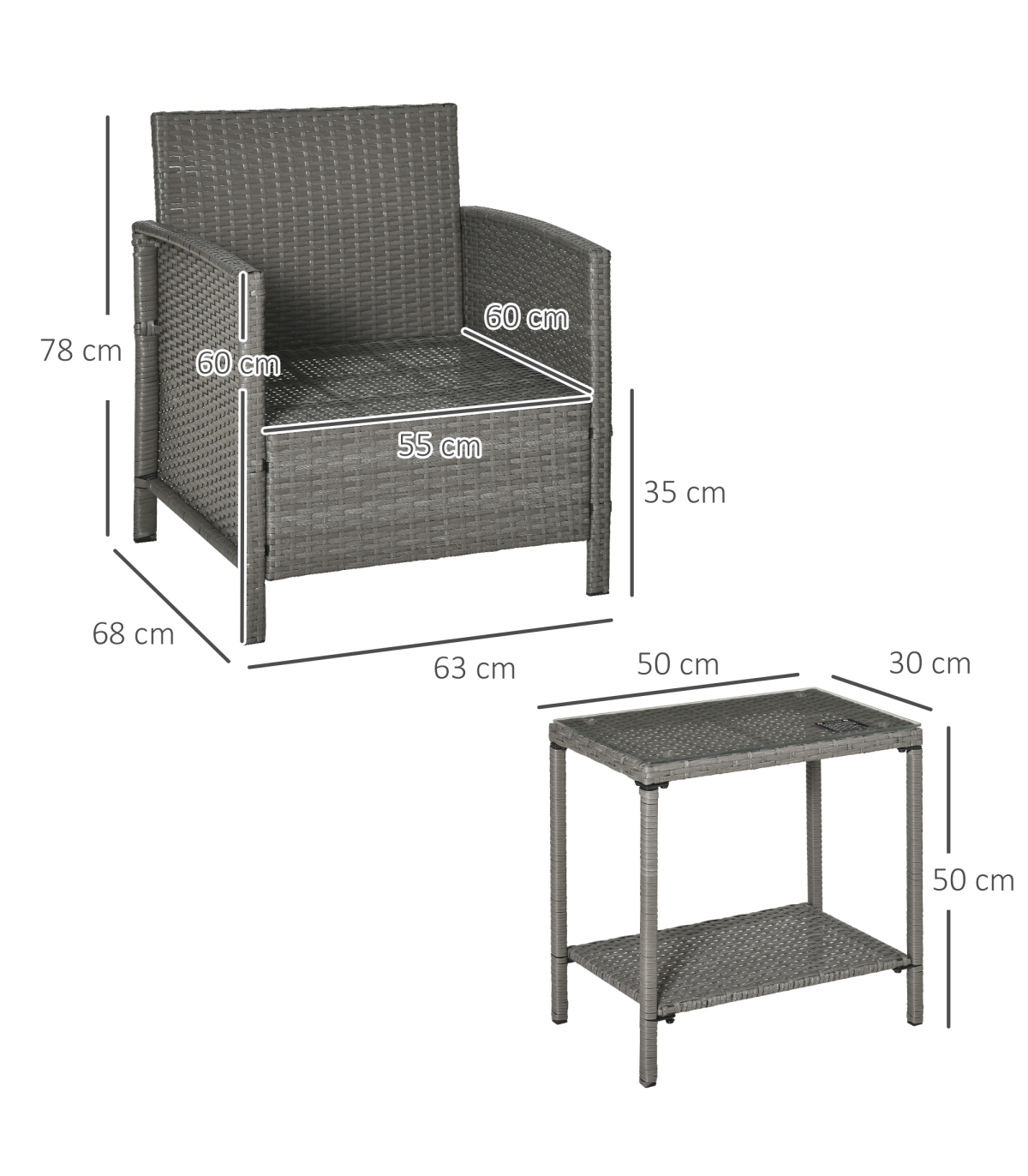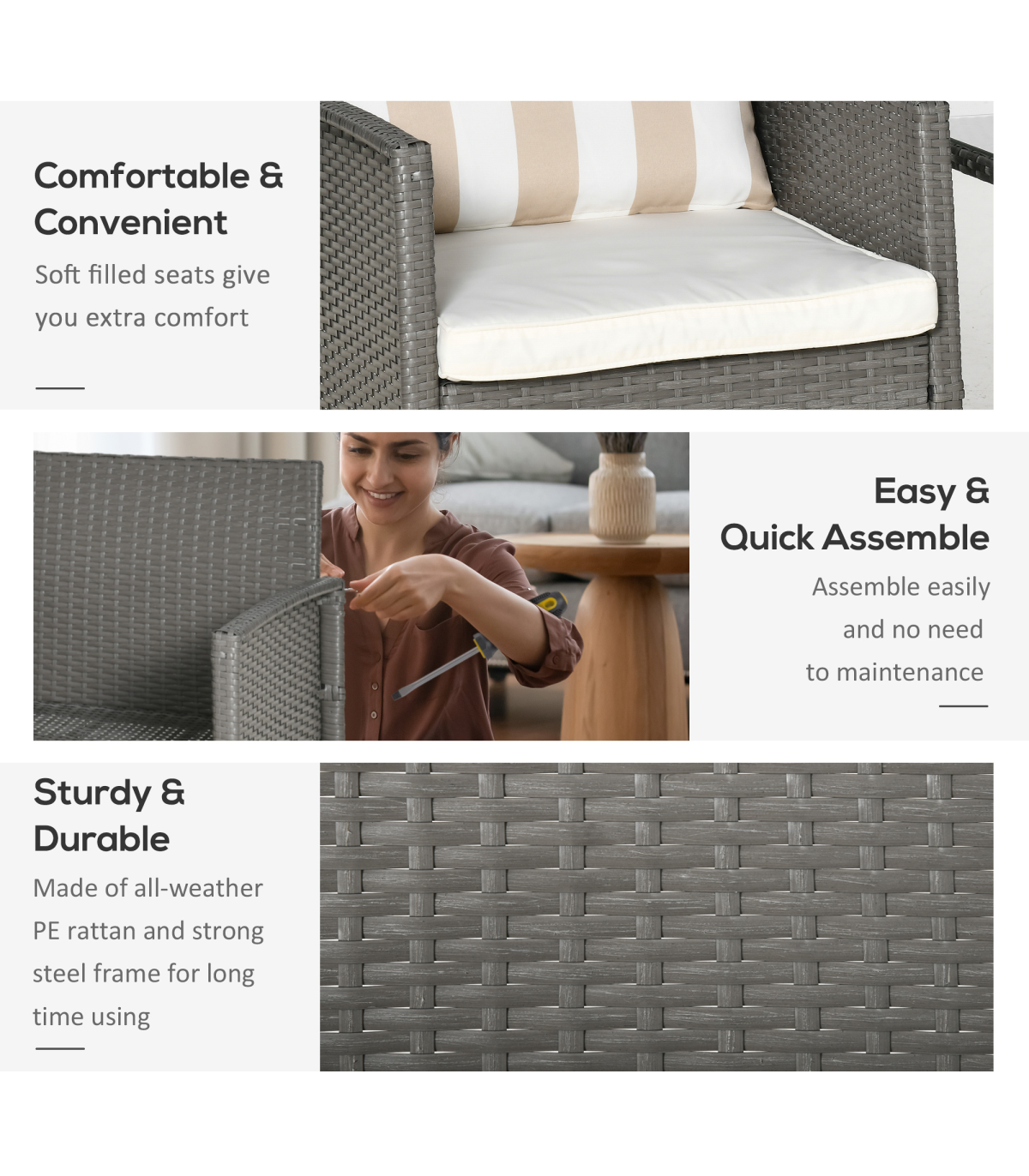 - Rattan 2 Seater Patio Bistro Set with Cushion Pillow - Grey, Cream White Description: - Three-piece set consisting of three armchairs and a coffee table - Sturdy metal frame wrapped in PE wicker for durability against mild weather damage - Easy-to-clean smooth surface - Comfortable thick padded seat with removable and washable covers for easy maintenance - Stylish bolster cushion with stripes for added comfort and support - Two-tier table with sleek glass tabletop, providing ample space - Maximum load capacity: chair - 160kg, table - 30kg - Assembly required