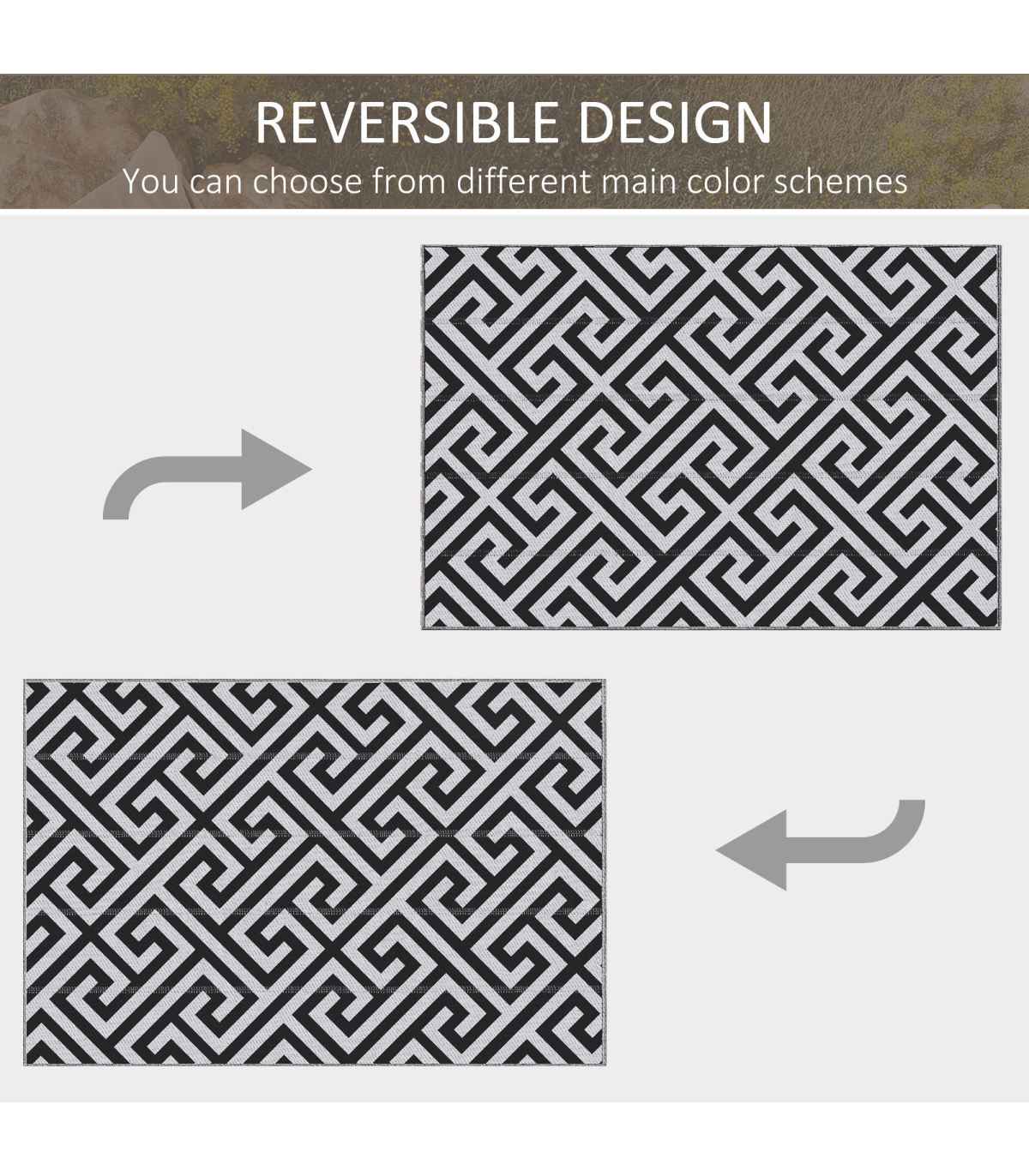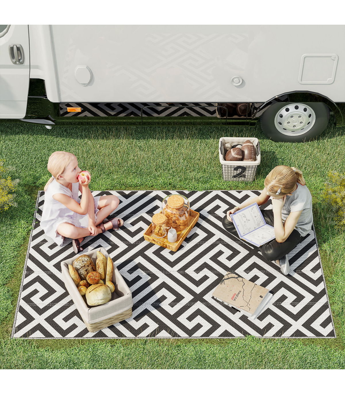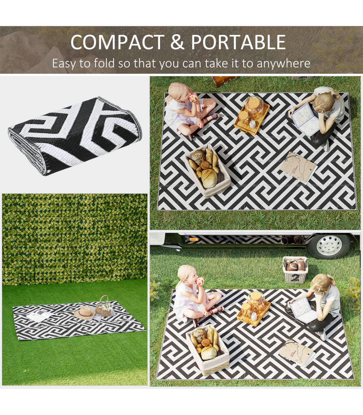 Set up your own activity base for camping or other outdoor activities. The foldable rug is specially designed for outdoor use like camping, picnic, road tour, etc. It's widely suitable for camper vans, RVs, the beach, gazebos, patios, playrooms, and anywhere you need it. The durable material resists water and UV, which is anti-fading and provides protection from moisture from ground. Furthermore, just flip it over to update the look and style! Be the envy of your friends!