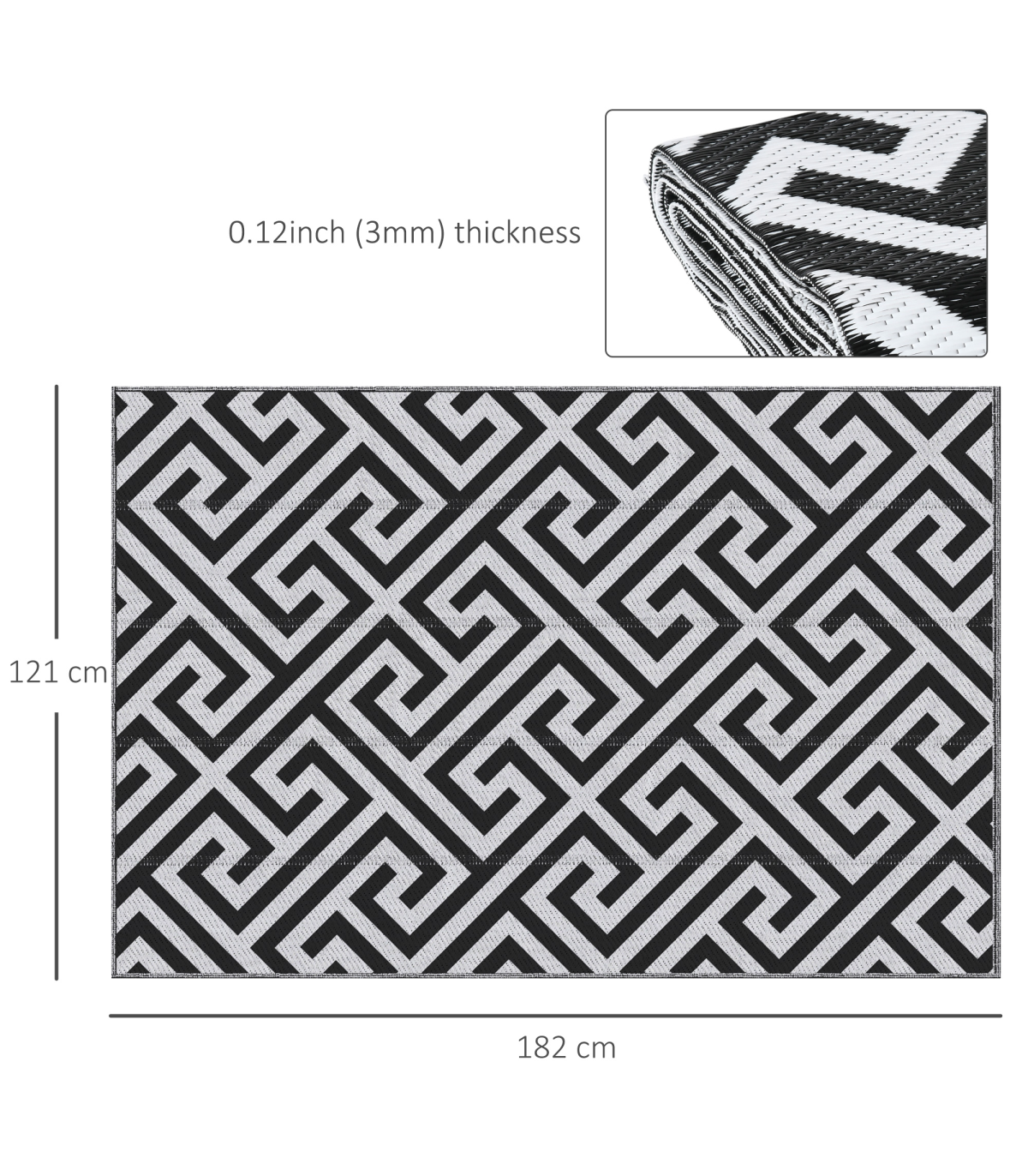 PORTABLE DESIGN: It's lightweight and can be folded into compact size, is easy to be taken outdoors. Suitable for RV road trip, camping, picnic, peach, garden, etc.SELECTED MATERIAL: This outdoor rug is made of 100% polypropylene, along with durable edging that to avoid fraying. With sun protection treatment to protect against fading and other sun damage.REVERSIBLE USE: The double sides of the outdoor rug can be used with different main color schemes. The stylish pattern makes it a colorful addition to any home or outdoor activities.EASY MAINTENANCE: If it gets dirty, just rinse it with water, sweep it with broom or wipe it with a wet rag and then airing it dry.PRODUCT INFORMATION: Overall Dimension: 121L x 182W x 0.3T cm. NOTE: This product is not fireproof, please keep it away from fire.