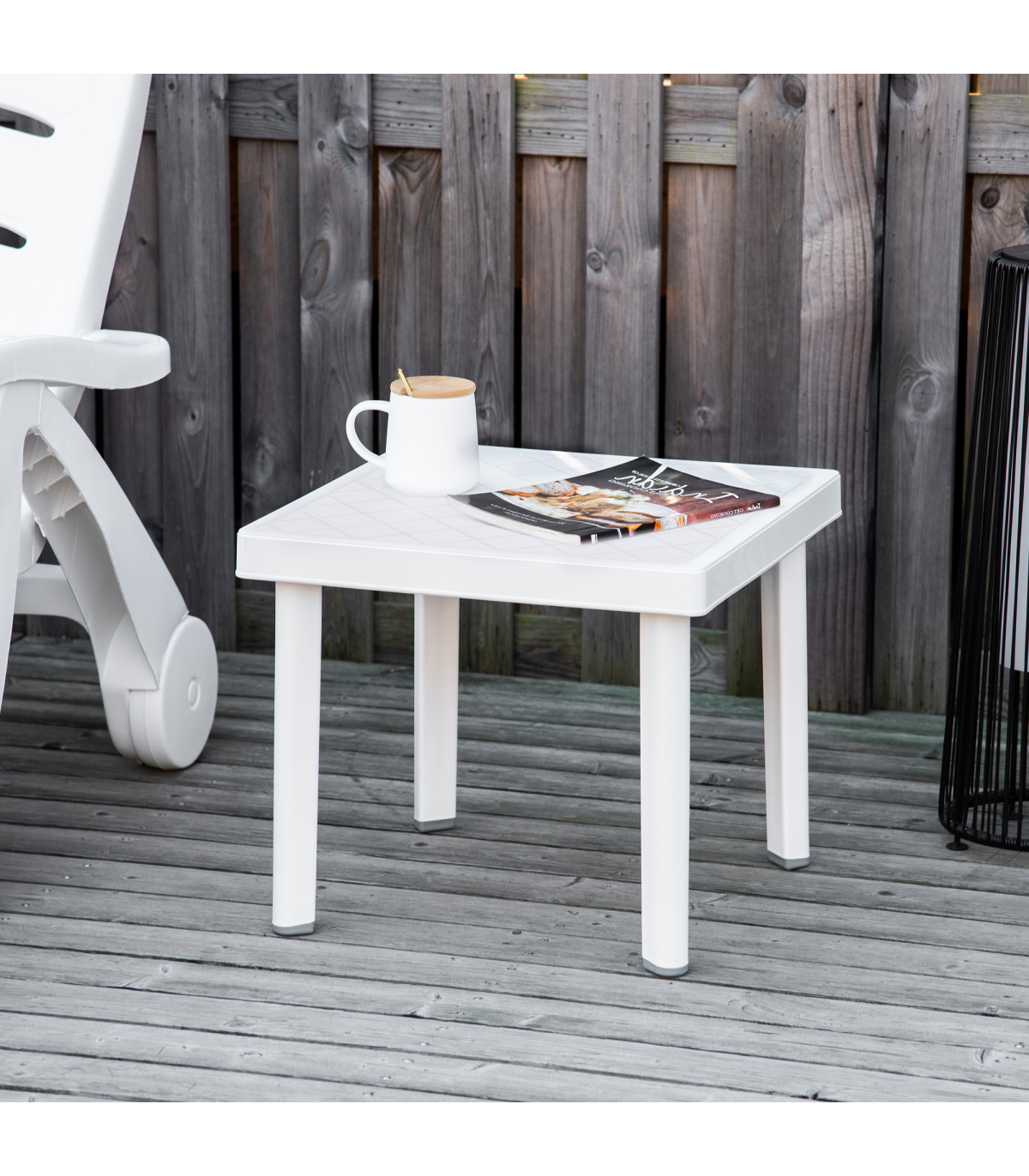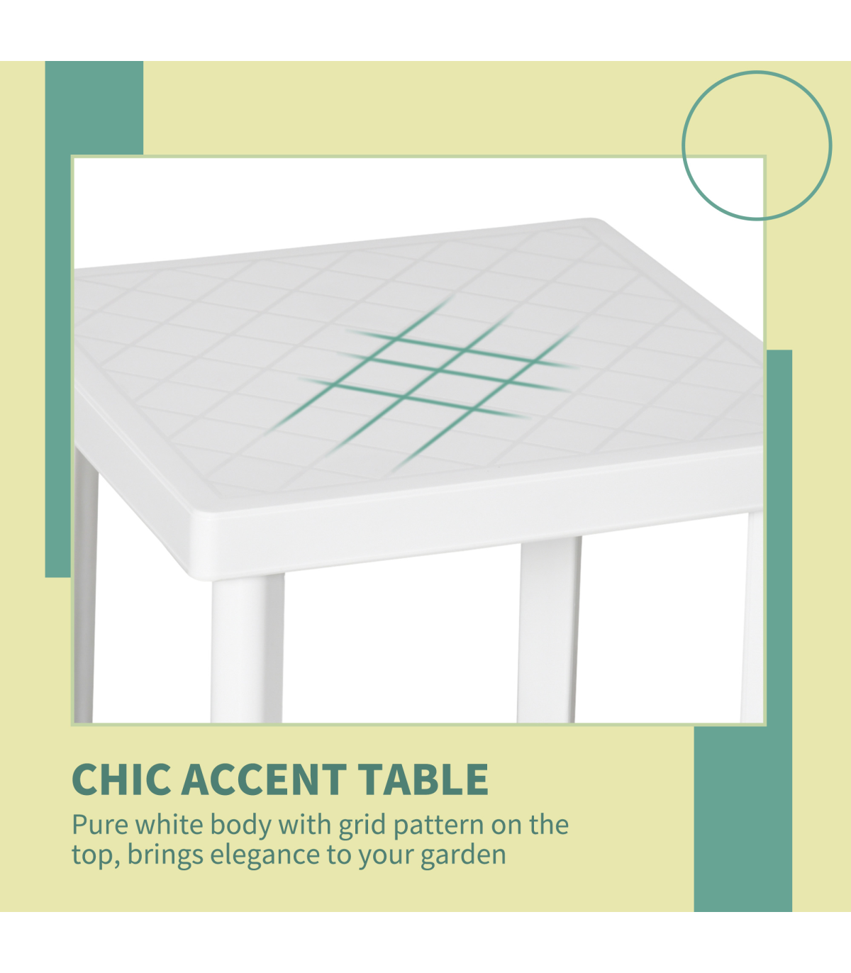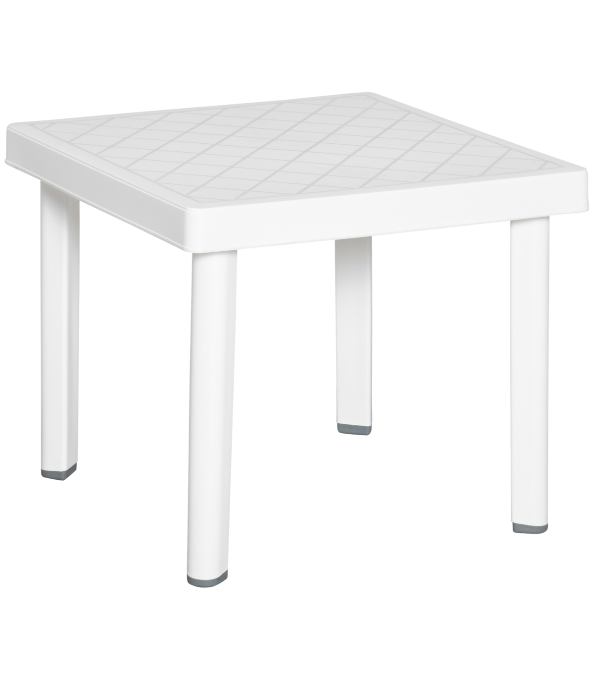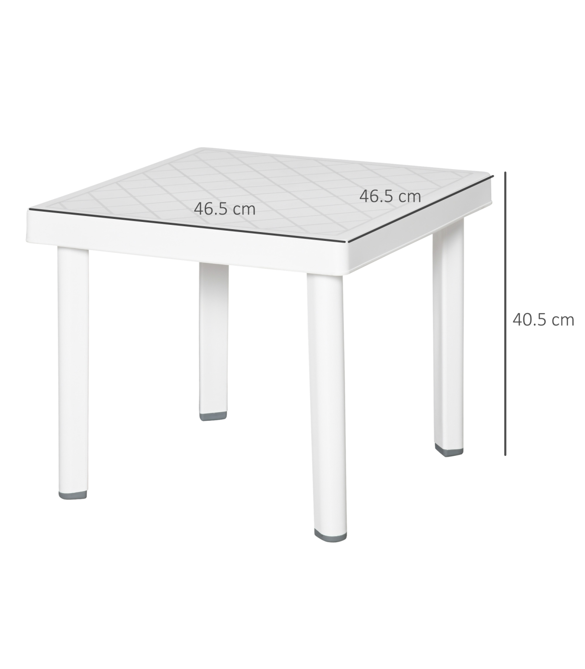 - Garden End Table Outdoor Square Accent Coffee Table for Drink Snack Outsunny - Description: - CHIC & STYLISH: Pure white body with square grid pattern on the tabletop makes it a great addition to your garden, terrace, balcony, and more - FOOT PADS: Prevent the bottom from wearing out or slipping, keep the garden coffee table level and balanced - EASY TO CLEAN: The plastic body is weather-resistant for use outdoors, it is tough and durable and can be wiped clean easily - VERSATILE USE: Able to serve as an end table, entryway accent, or pretty much anywhere you need it - OVERALL DIMENSION: 46.5L x 46.5W x 40.5H cm - MAXIMUM LOAD WEIGHT 20KG - ASSEMBLY REQUIRED