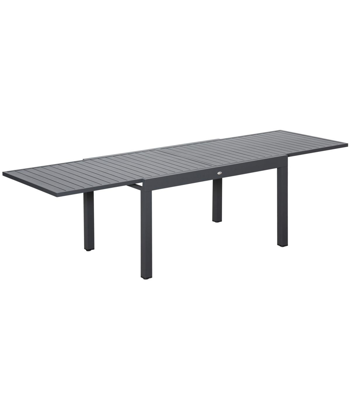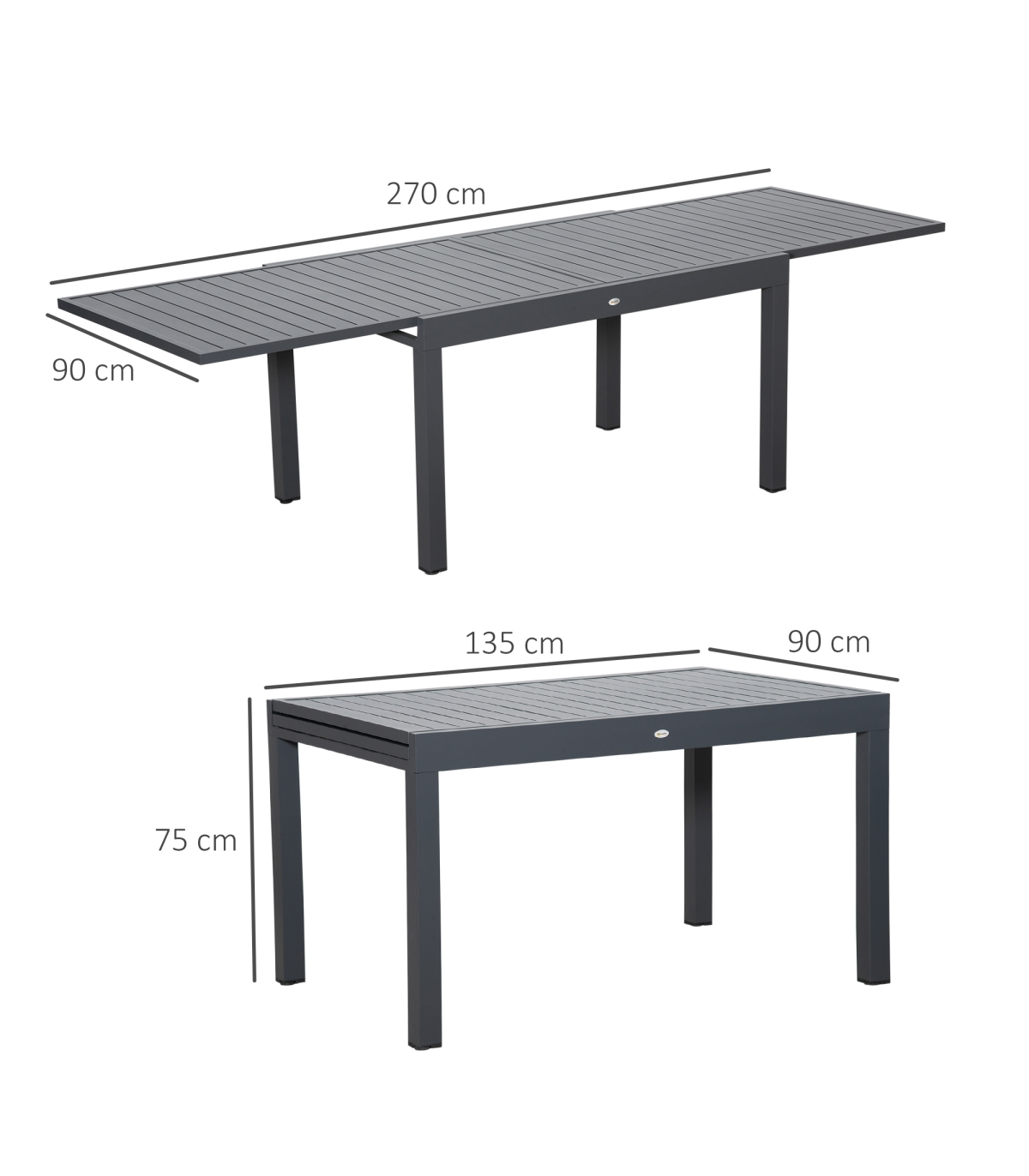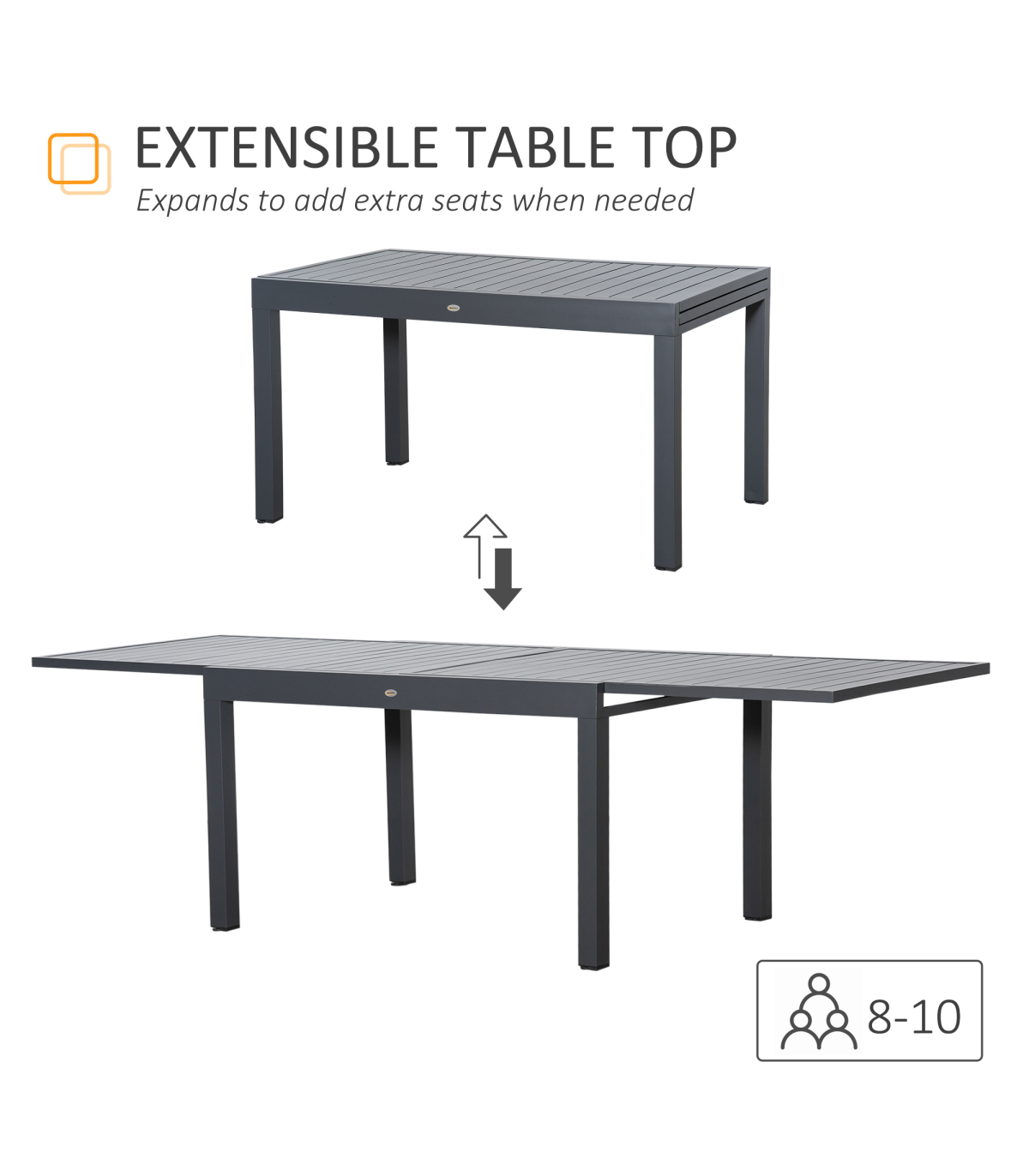 Pick a stylish addition for dining, afternoon tea and parties on patios, decks and more, with this extendable garden table from Outsunny. The powder coated aluminium frame is sturdy and durable. The tabletop extends between 135cm and 270cm - seating between eight and people: a large table great for when friends and family come over!