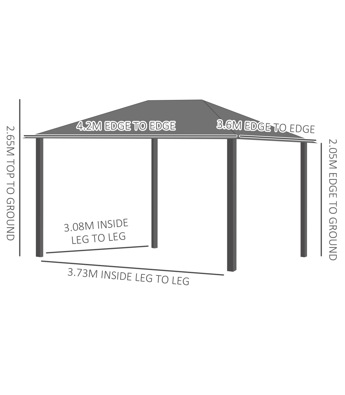 DELUXE DESIGN: Large and bold, it will impress everyone who sees it. The polycarbonate gazebo to hold your outdoor gatherings, BBQs and parties, giving everyone shelter whilst plenty of room to move around.STRONG FRAME: Made from aluminium to stand stable and upright when in use. Naturally water and rust resistant. Keeps the gazebo upright and in place all day long.HARDTOP: More protective than a traditional canopy, it shields your guests inside from direct sunlight, UV and light rain. Helps keep inside cool. Sloped shape, water won't build up.FOUR CURTAINS: Creates privacy when wanted for a more intimate party experience, with netting to keep bugs and insects away. EIGHT GROUND STAKES INCLUDED: Keeps the aluminium gazebo firmly in place to the ground for extra stability. 12 expansion screws also included.PATIO GAZEBO DIMENSIONS: 265H x 420L x 360Wcm. Eave: 205Hcm. ASSEMBLY REQUIRED.
