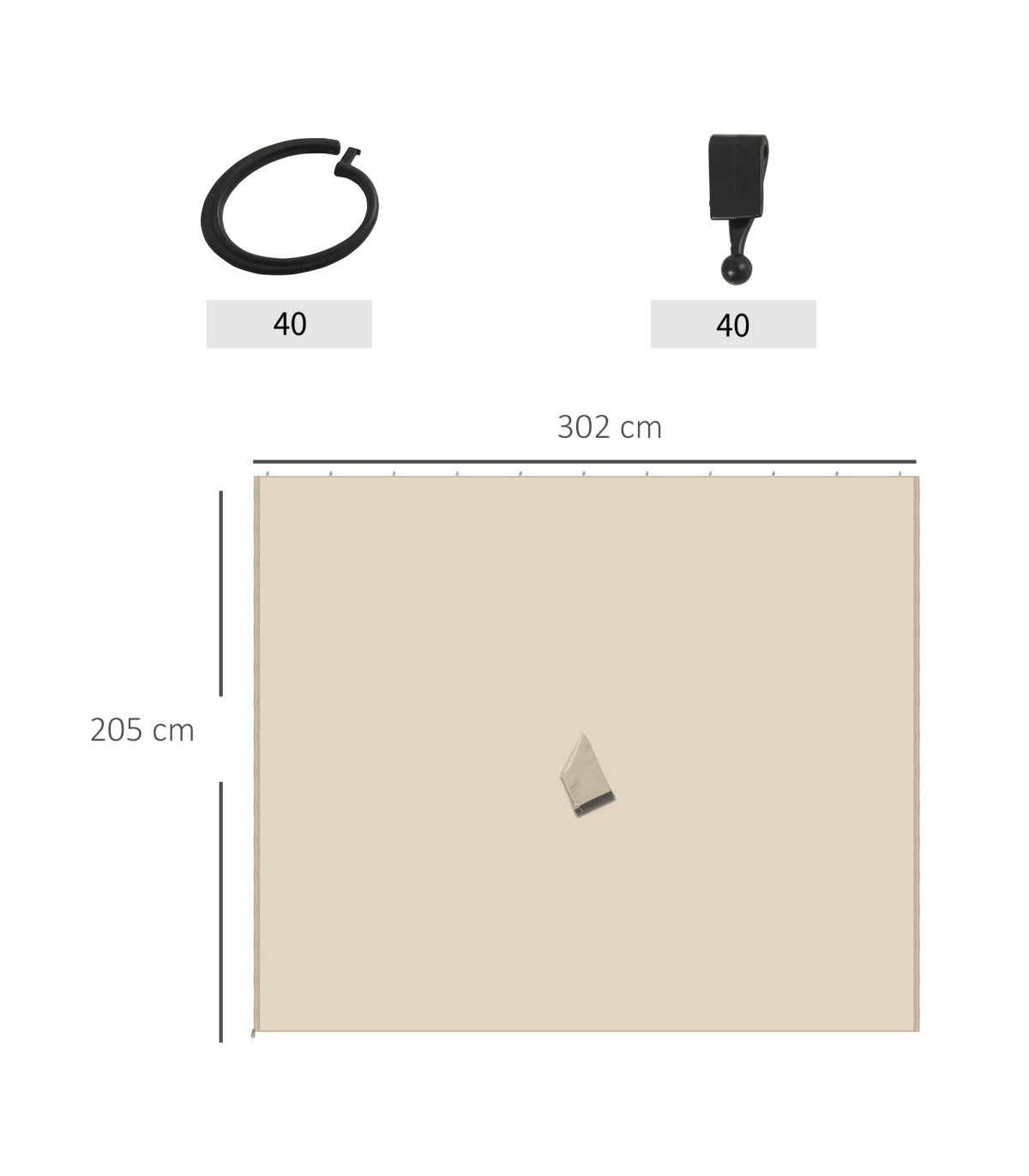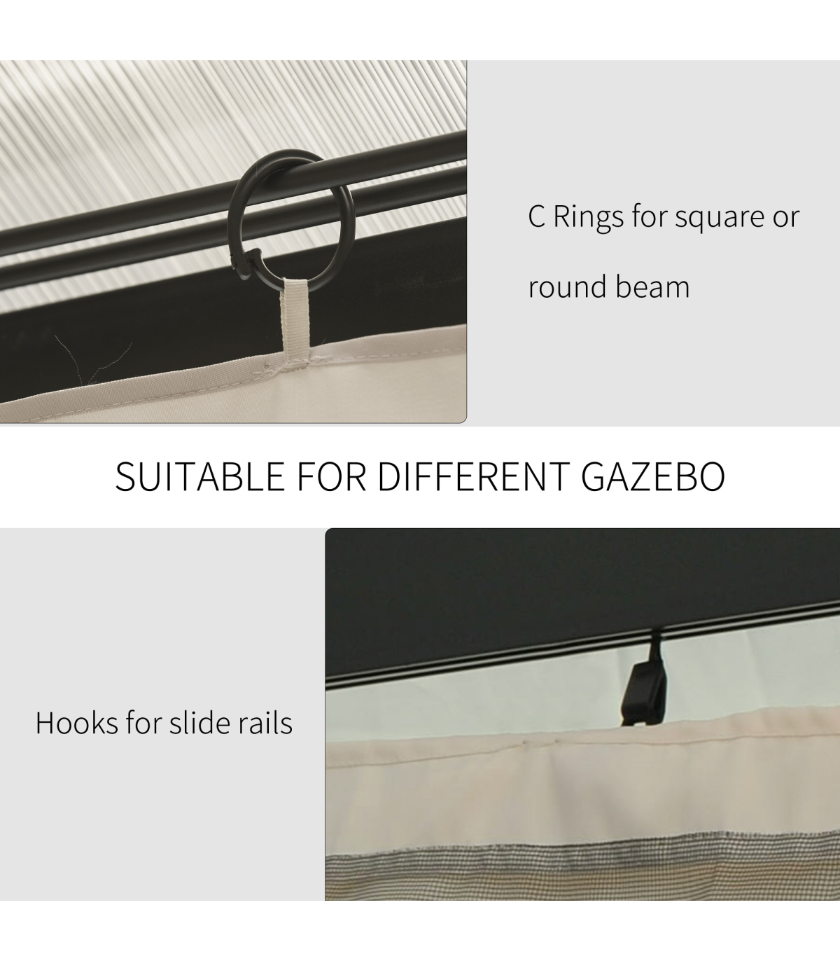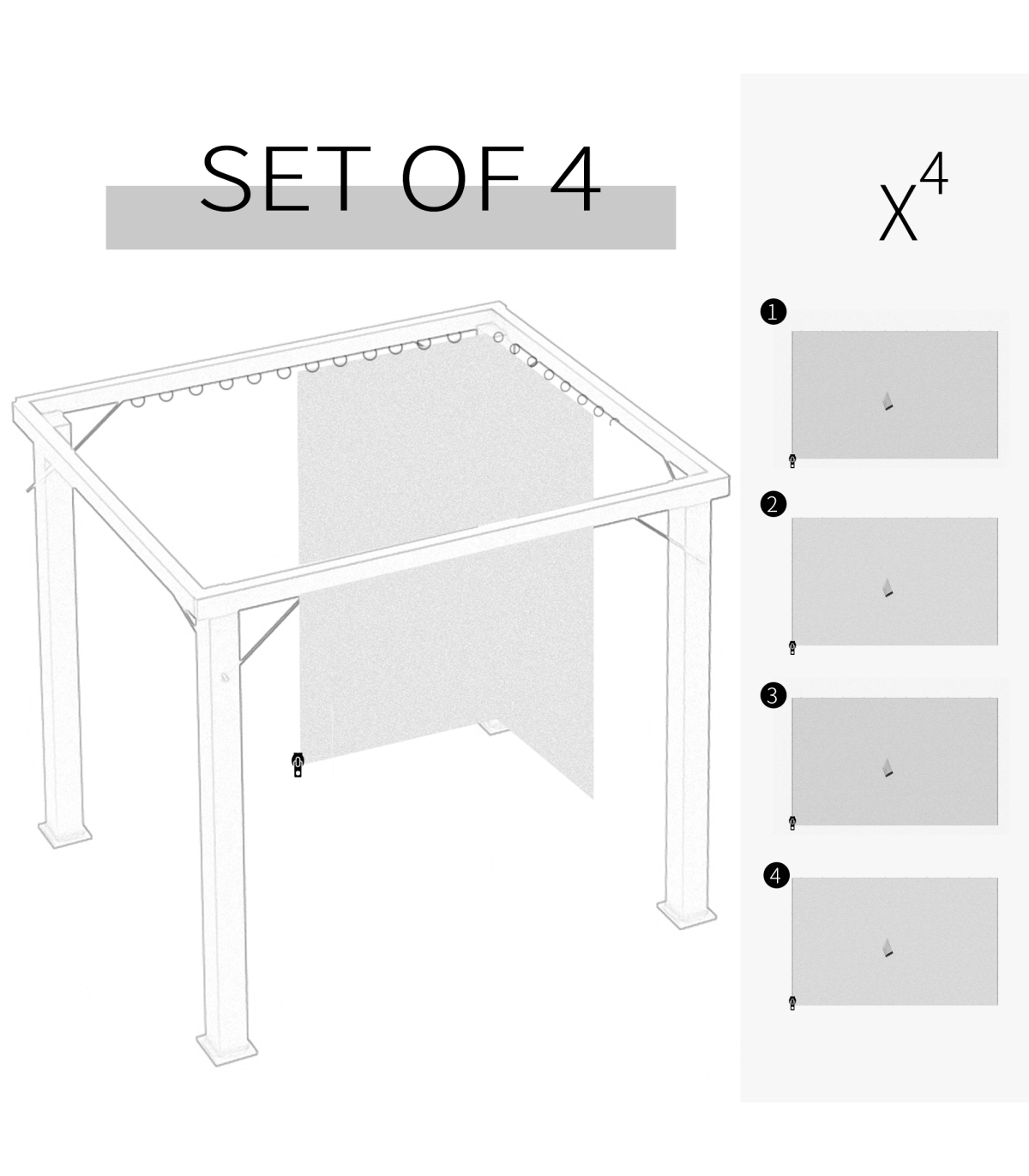 APPLICABLE TO: Our gazebo side curtains allow you to create protection when enjoying leisure time outdoors. This means eating food or drinking beverages can be enjoyed without being disturbed, while also protecting you from nasty wind and sunshine.PREMIUM MATERIALS: The gazebo sides panels only are made of durable and high-quality polyester fabric. The middle of each piece has velcro straps for easy fixing when not in use. The double-sides zipper of the pergola sidewall allows you to open and close easily from both inside and outside, providing convenience for use.EASY TO INSTALL: Easy to install by C rings or hooks are included with these gazebo curtains, which can meet the needs of different gazebo structures. Hooks are used for slide rails, and C-shaped rings are used for square or round beam pipes.NOTES: These gazebo replacement curtains can fit most 3 x 3(m) metal gazebos. PANELS ONLY, THE GAZEBO FRAME IS NOT INCLUDED. Please measure your gazebo size before purchasing. Do not wash.WHAT IN THE BOX: Sidewall x 4 pcs (Sidewall Dimensions: 302L x 205H cm), Hooks x 40 pcs, C rings x 40 pcs.