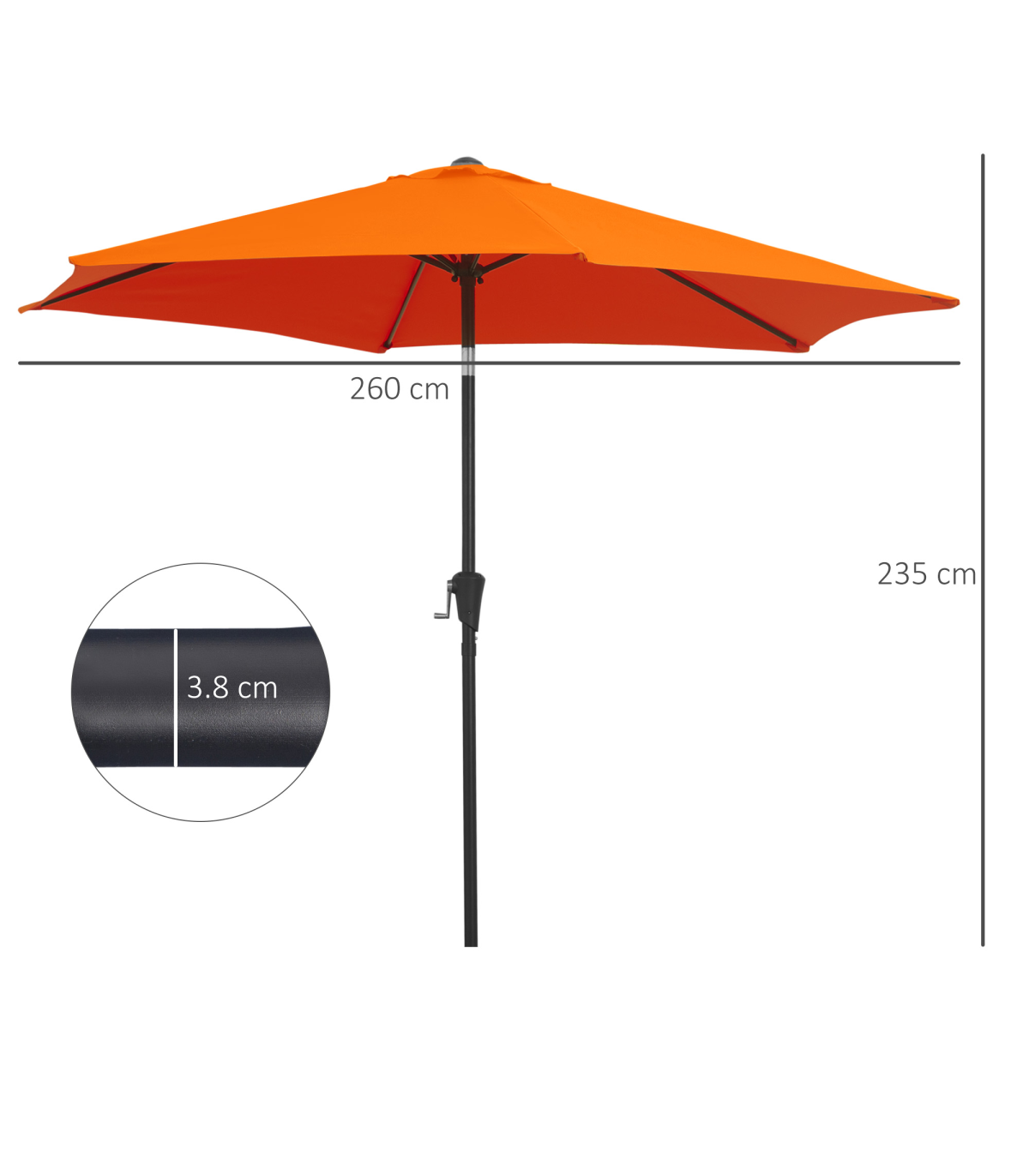 Patio Umbrella Parasol Sun Shade Garden Aluminium Orange 2.7M Outsunny Description: - LARGE STYLISH DESIGN: This large 2.7m stylish patio parasol has a polyester top cover that provides ample shading and is perfect for various locations. - CRANK MECHANISM: Easily open and close your outdoor parasol umbrellas in seconds with the easy-to-turn handle located on the side of the powder-coated aluminum pole. - ADJUSTABLE TILT: This garden table umbrella features an adjustable tilt, allowing you to quickly adjust the angle and shield yourself from the moving sun, ensuring shade all afternoon. - SINGLE WIND VENT: The sunshade for garden has a wind vent at the top, ensuring proper ventilation and helping the large parasol stay secure and stable on the ground. - OVERALL SIZE: 2.7 x 2.35H (M). Assembly Required. Base is not included.