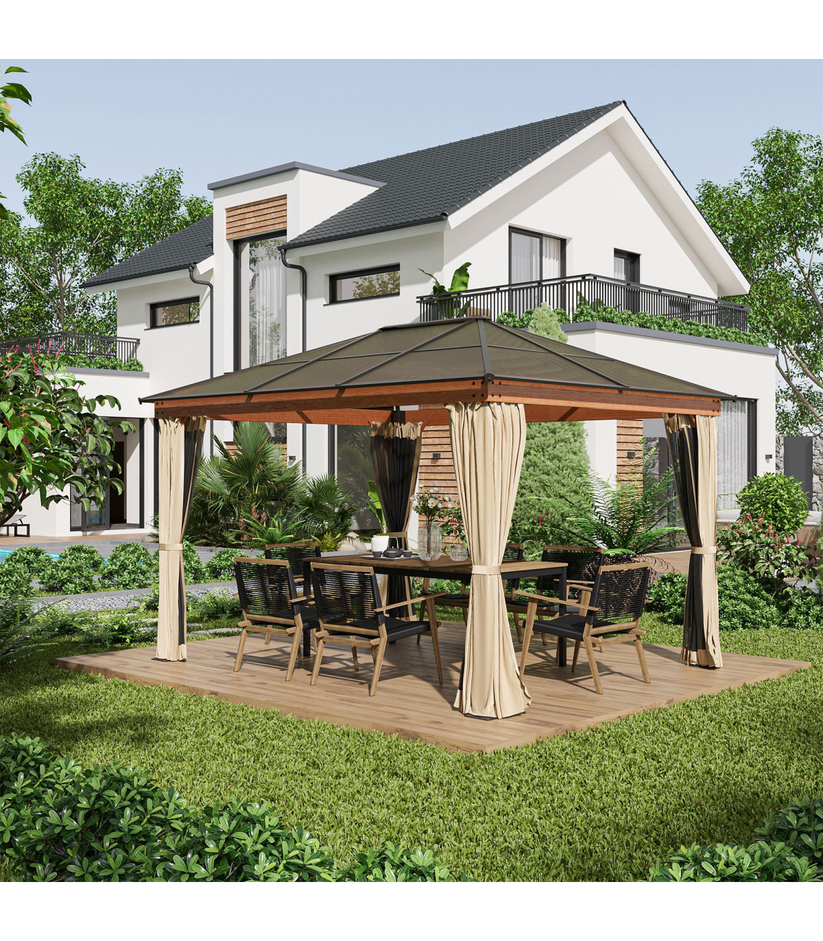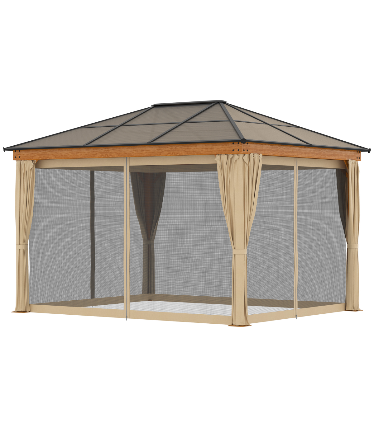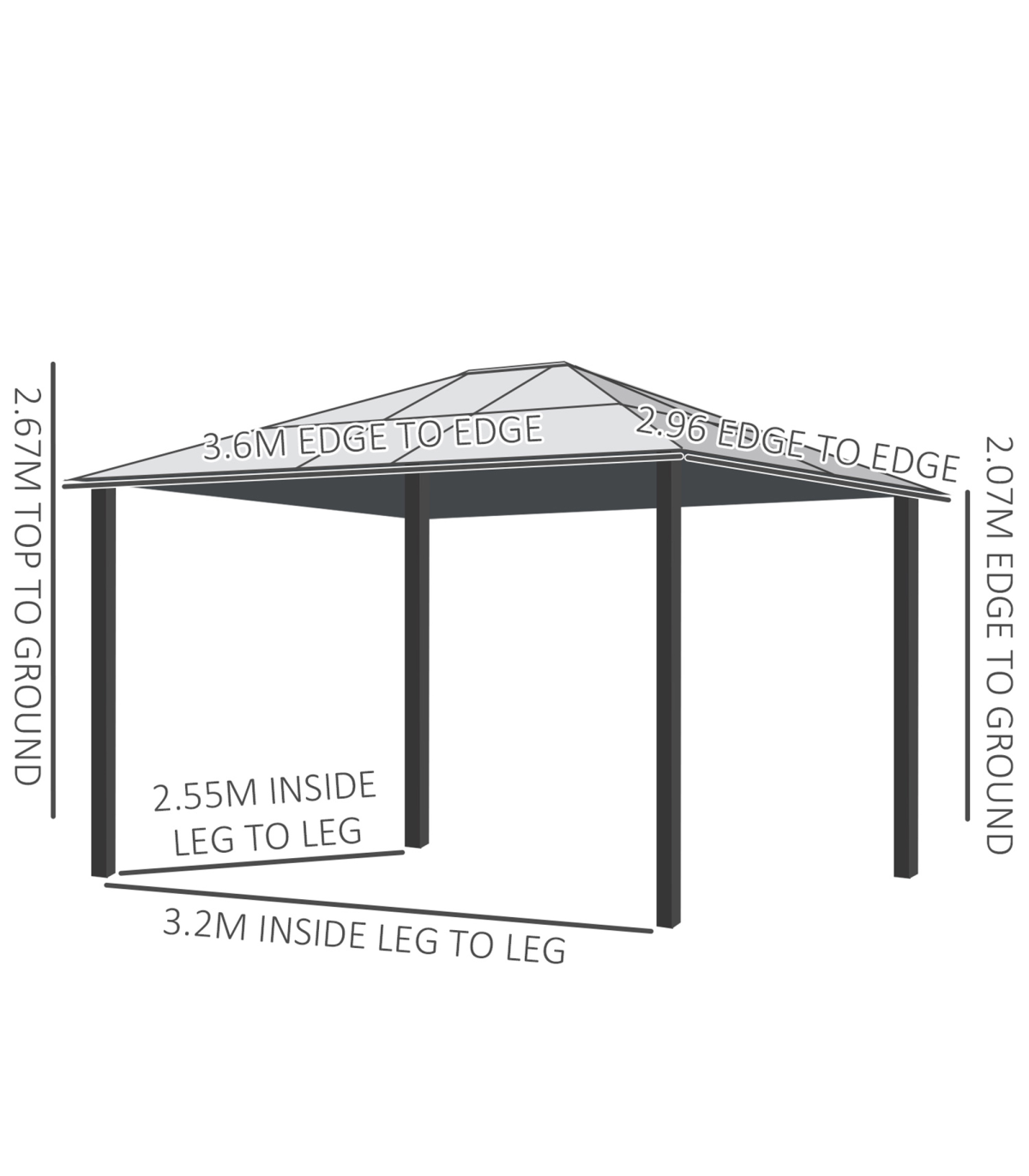 Hard top gazebo design: Polycarbonate roof for a strong top, which protects underneath from rain, snow and direct sun.Eight curtains, with netting: This gazebo with netting can easily create privacy, whenever you want. Removable netting to keep bugs and insects outside. Both layers can be tied to the frame easily.3 x 3.6m hardtop gazebo size: A large size, open inside - this garden gazebo is the perfect place for having outside parties, gatherings, BBQs - and so much more.Aluminium and steel blend frame: A strong core for this polycarbonate gazebo, it stands steadily in place. 16 ground nails and 16 expansion screws to secure to the ground.Dimensions: 267H x 296L x 360Wcm, Eaves: 207Hcm. Assembly required. Do not leave standing in heavy weather conditions.